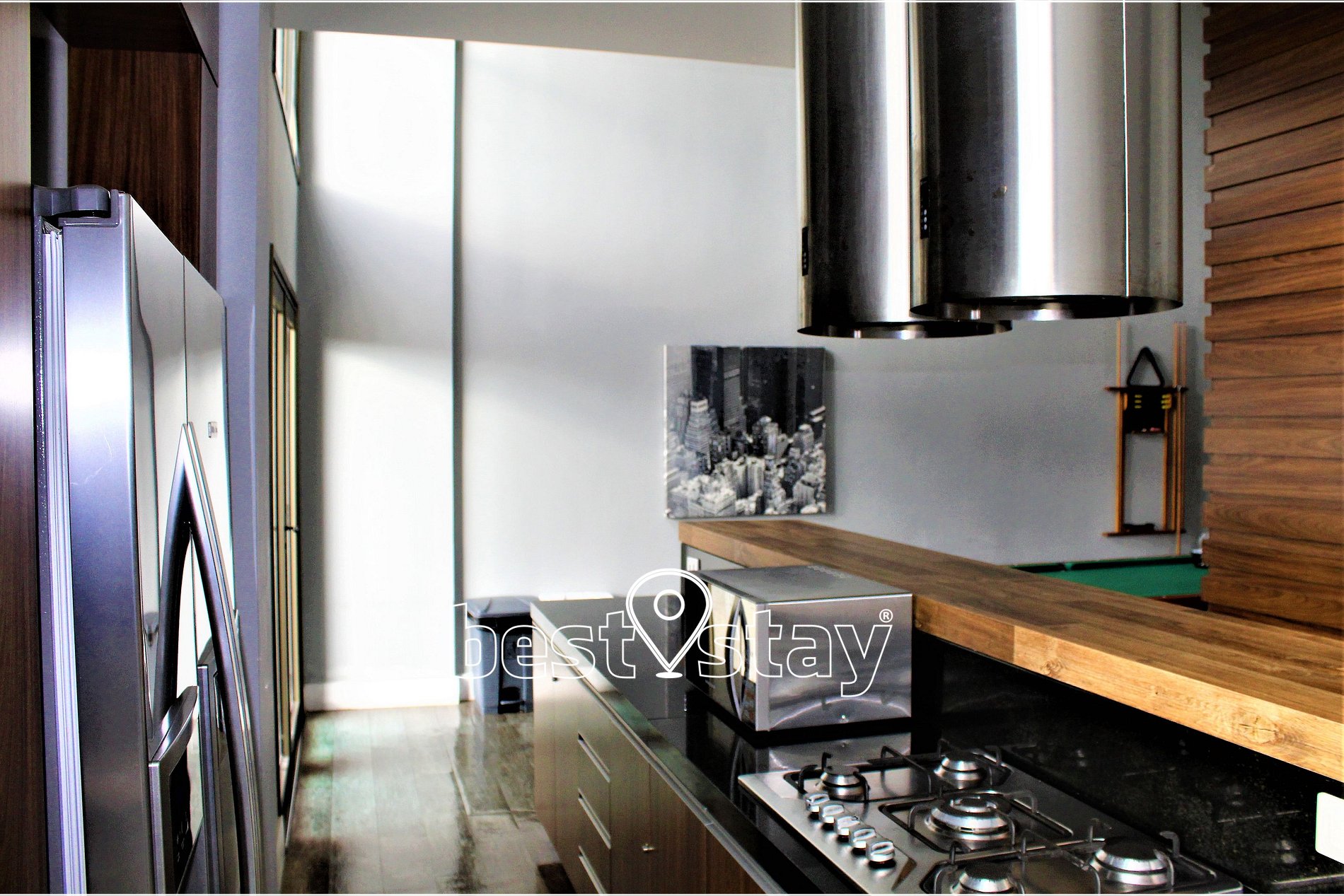 Tipo americana, fogão Cooktop elétrico de 2 bocas, forno de bancada, geladeira, micro-ondas, cafeteira elétrica tradicional, panelas, louças e talheres. Água quente com aquecimento central a gás e ótima pressão, nas pias e no chuveiro.