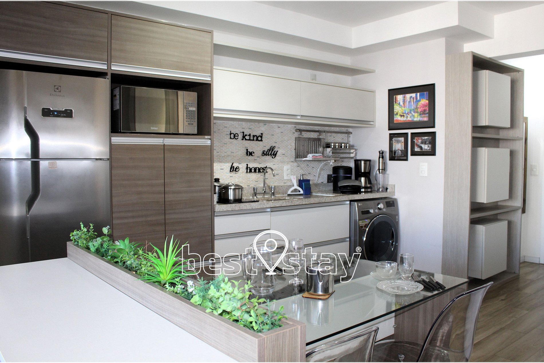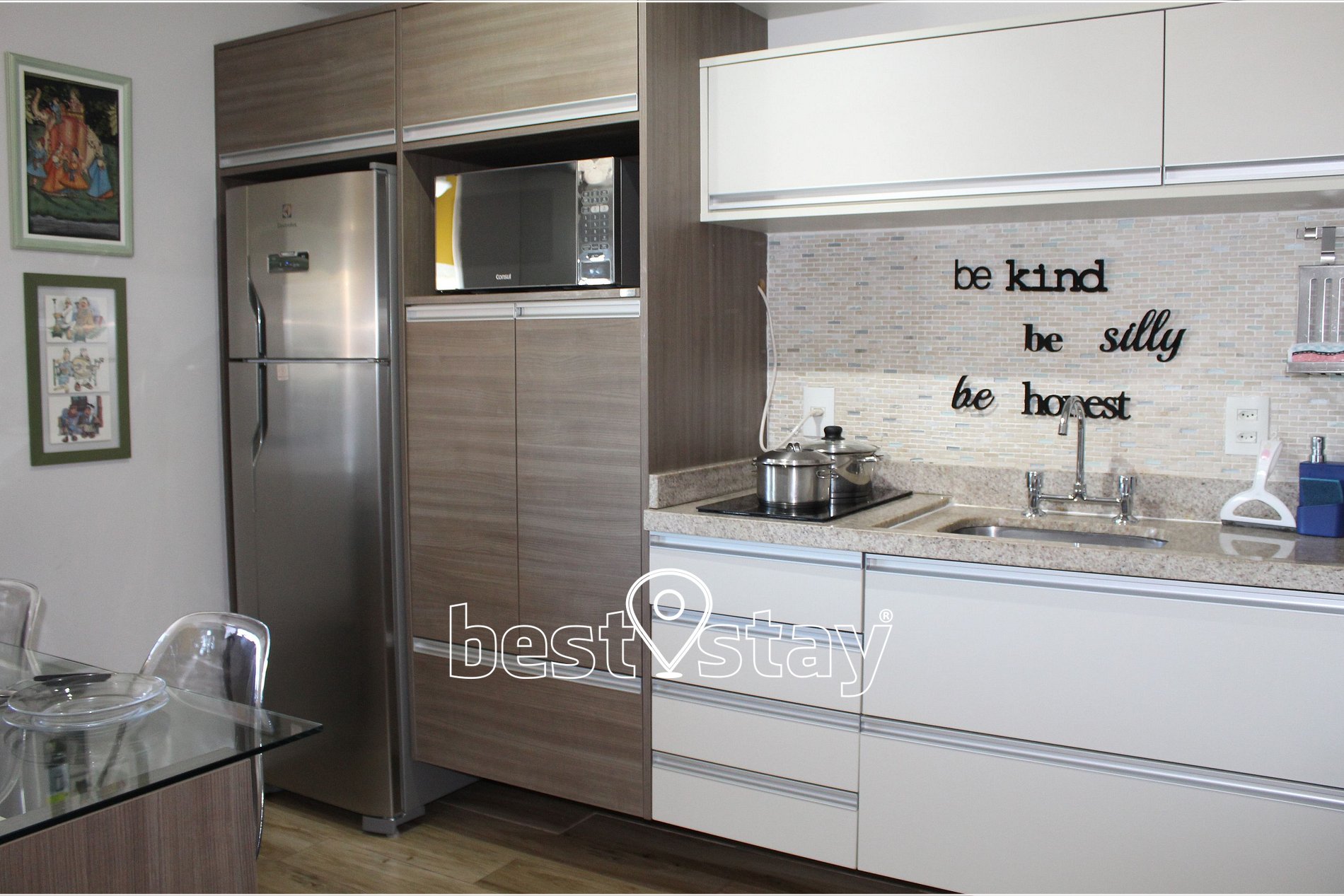 Fogão cooktop indução 2 bocas, Geladeira, Microondas, cafeteria elétrica, Sanduicheira, mixer, panelas inox, taças de vinho, copos, xícaras, Louças, talheres e utensílios de cozinha em geral, mesa c/ 2 cadeiras. Máquina lava e seca roupas LG, Pia com água quente e aquecimento central à gás.