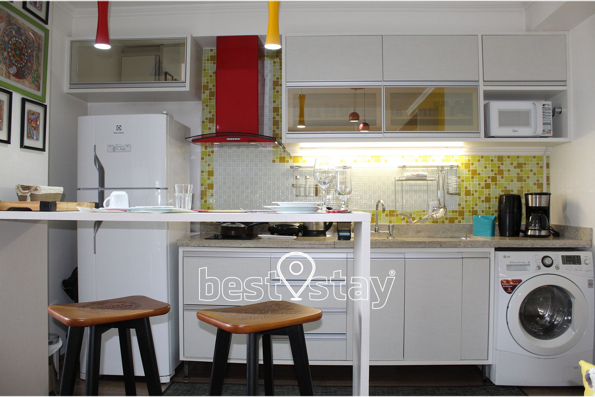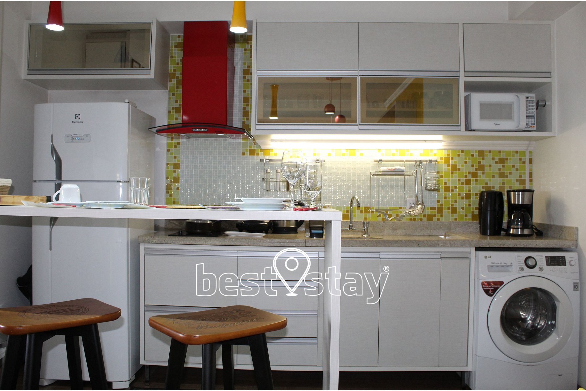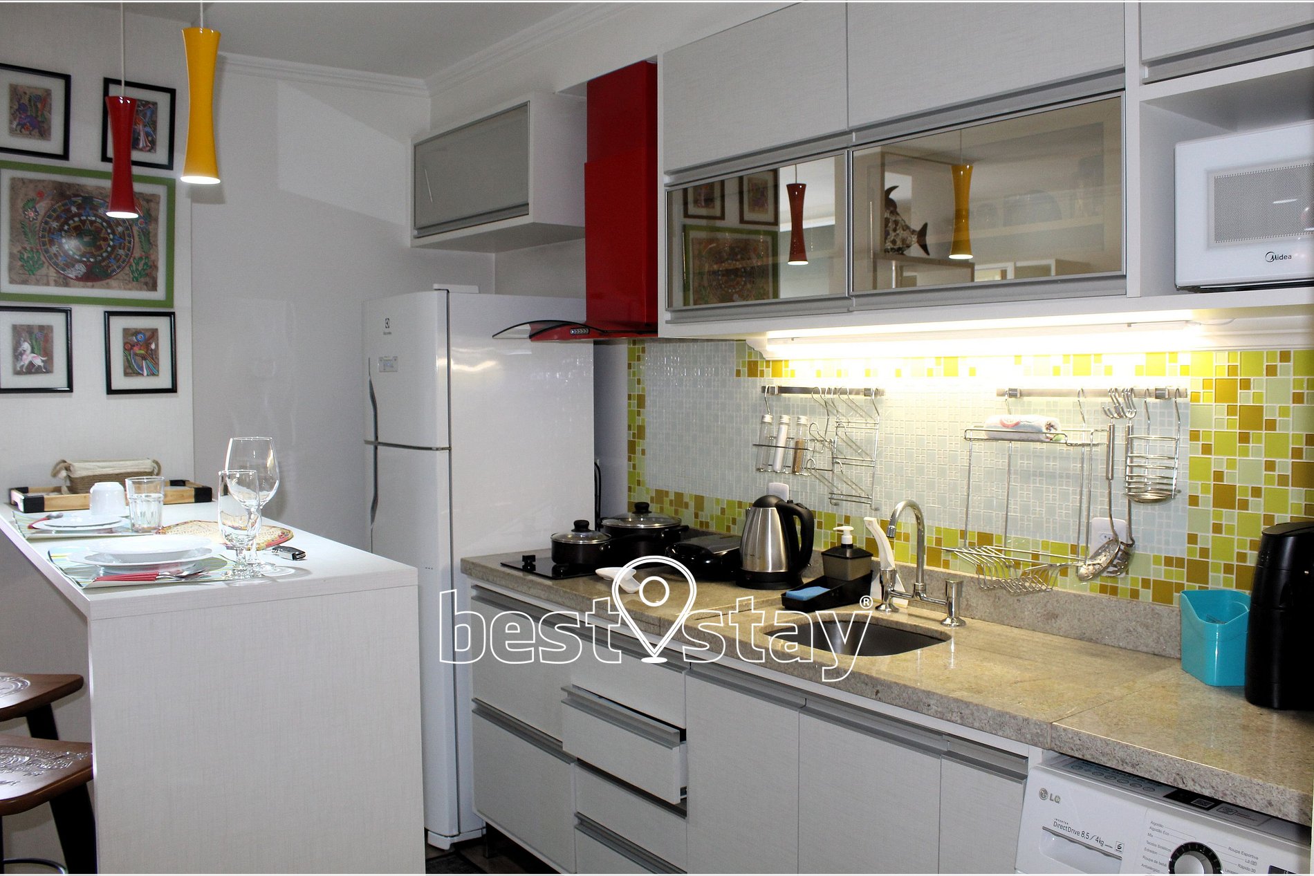Tipo americana c/ mesa/bancada para refeições, fogão elétrico Cooktop 2 bocas, geladeira, micro-ondas, cafeteira elétrica tradicional, cafeteira de cápsulas, pipoqueira elétrica, sanduicheira, liquidificador, grill, panela de pressão elétrica, panelas, taças, copos, xícaras, louças, talheres e utensílios, escorredor de louça, suporte para temperos. Pia com água quente e aquecimento central a gás, com ótima pressão - Maquina lava e seca, exclusiva do apartamento. Estação de trabalho/Estudo com cadeira.