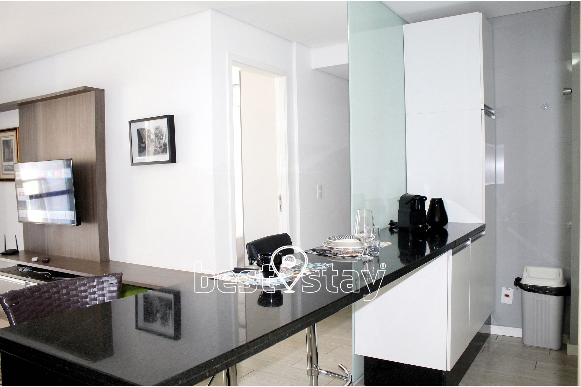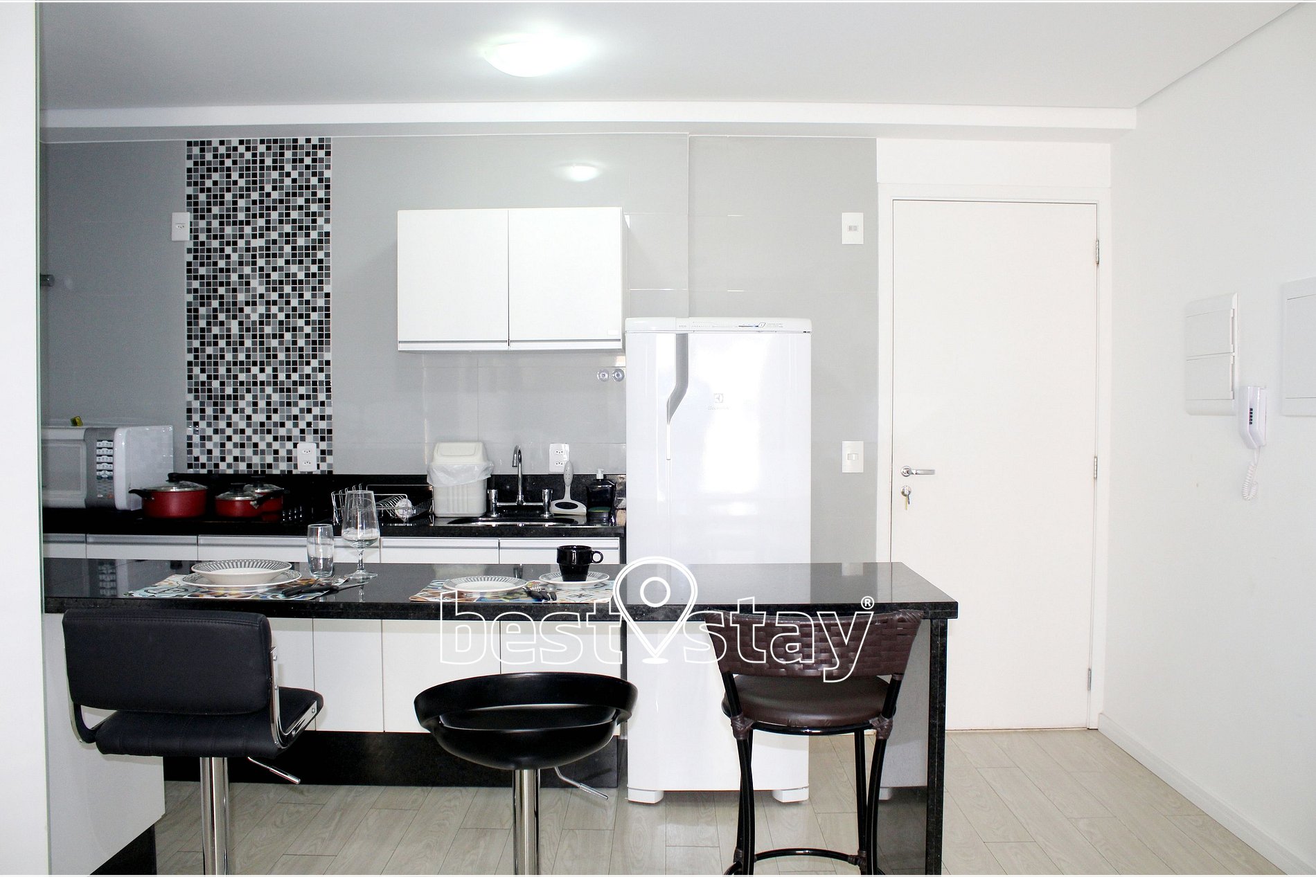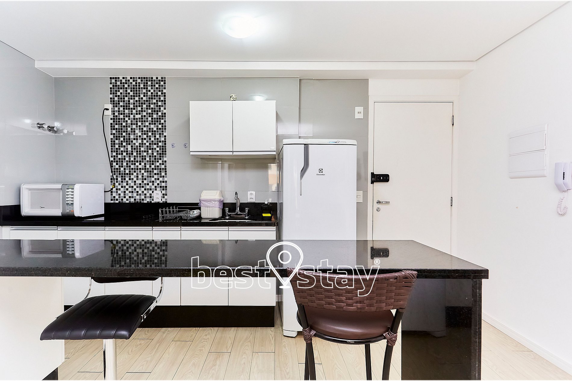 Tipo americana, bancada com 2 banquetas para refeições, fogão Cooktop elétrico de 4 bocas, geladeira, micro-ondas, cafeteira elétrica tradicional, liquidificador, sanduicheira, panelas, utensílios de cozinha, louças e talheres. Água quente com aquecimento central e ótima pressão.
