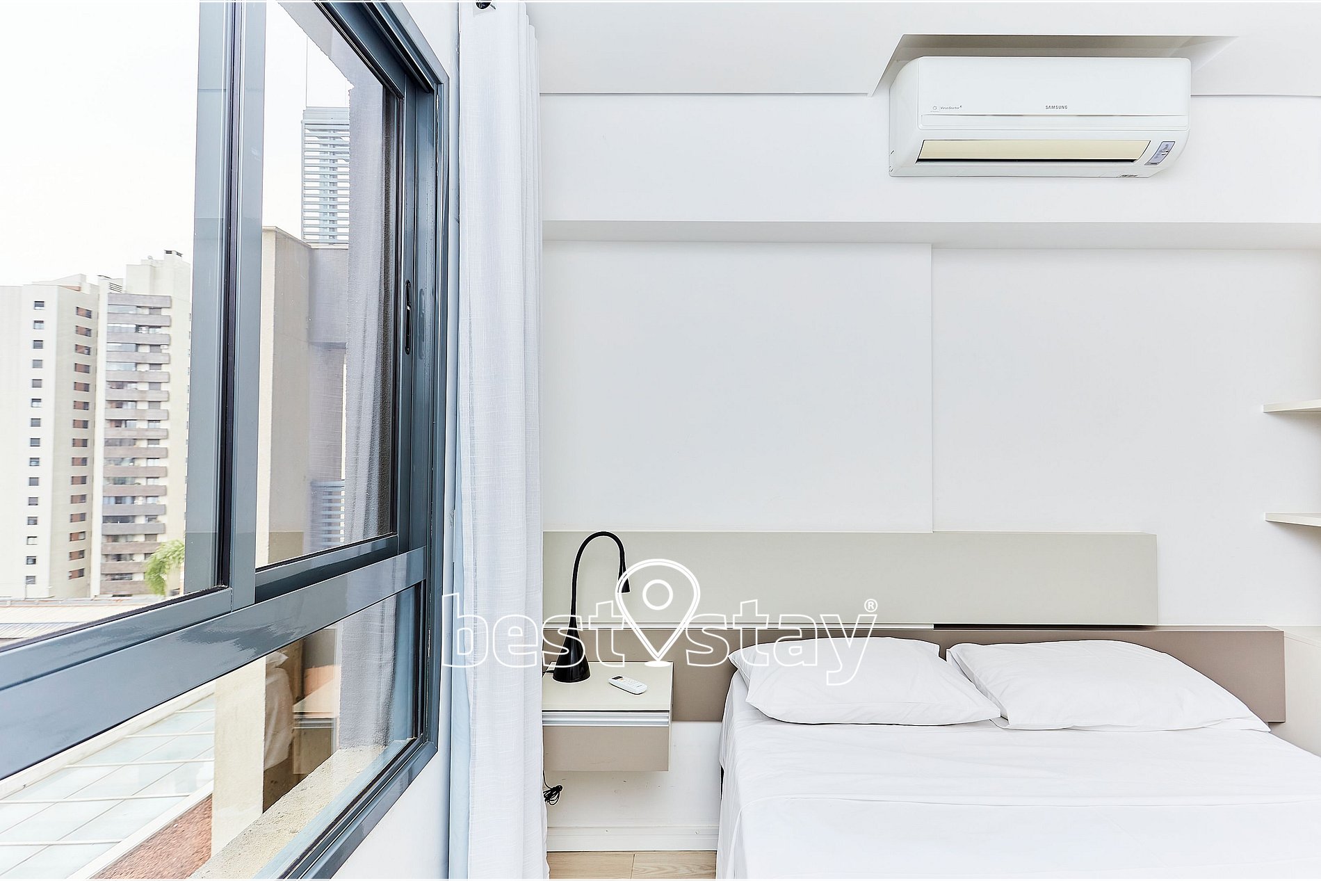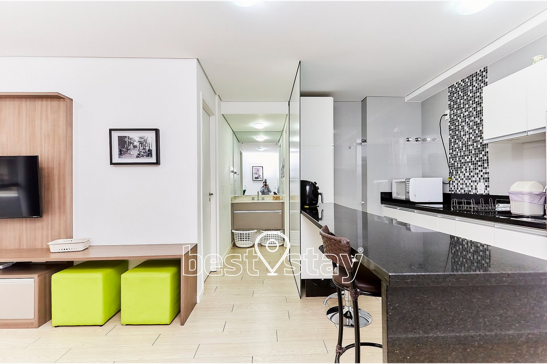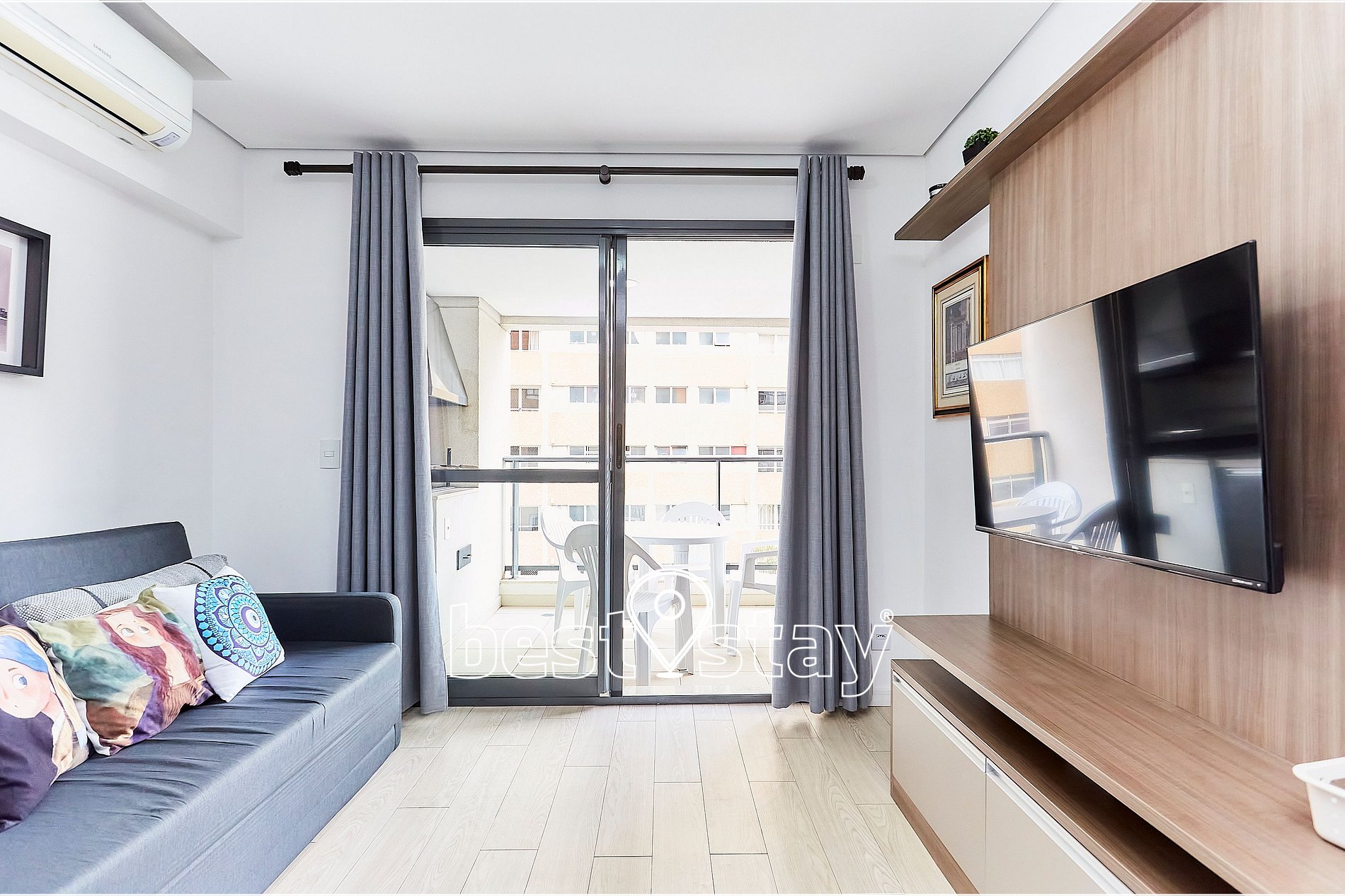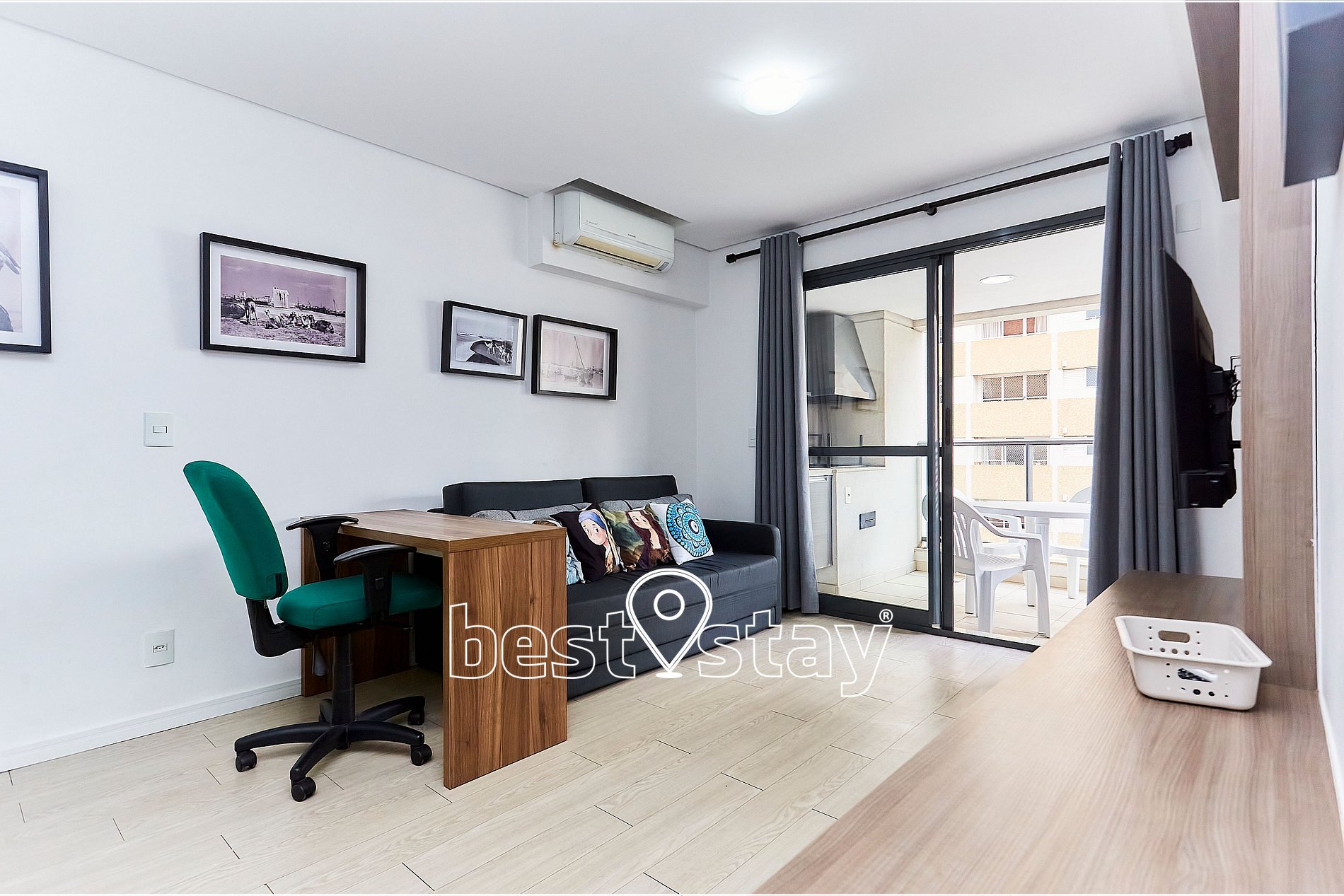 SmarTv 48 polegadas, sofá-cama para 1 pessoa, ar condicionado, estação de trabalho com mesa e cadeira Tudo meticulosamente decorado, com muito conforto e blackout nas cortinas.