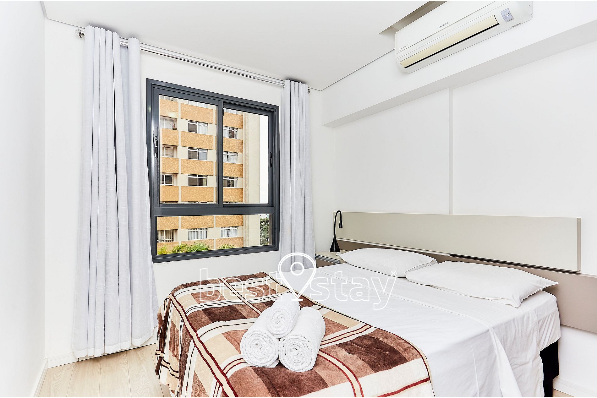 Cama de casal, cortina BLACKOUT 100%, guarda roupas, cabides, ferro de passar, cobertores e travesseiros e ar condicionado.