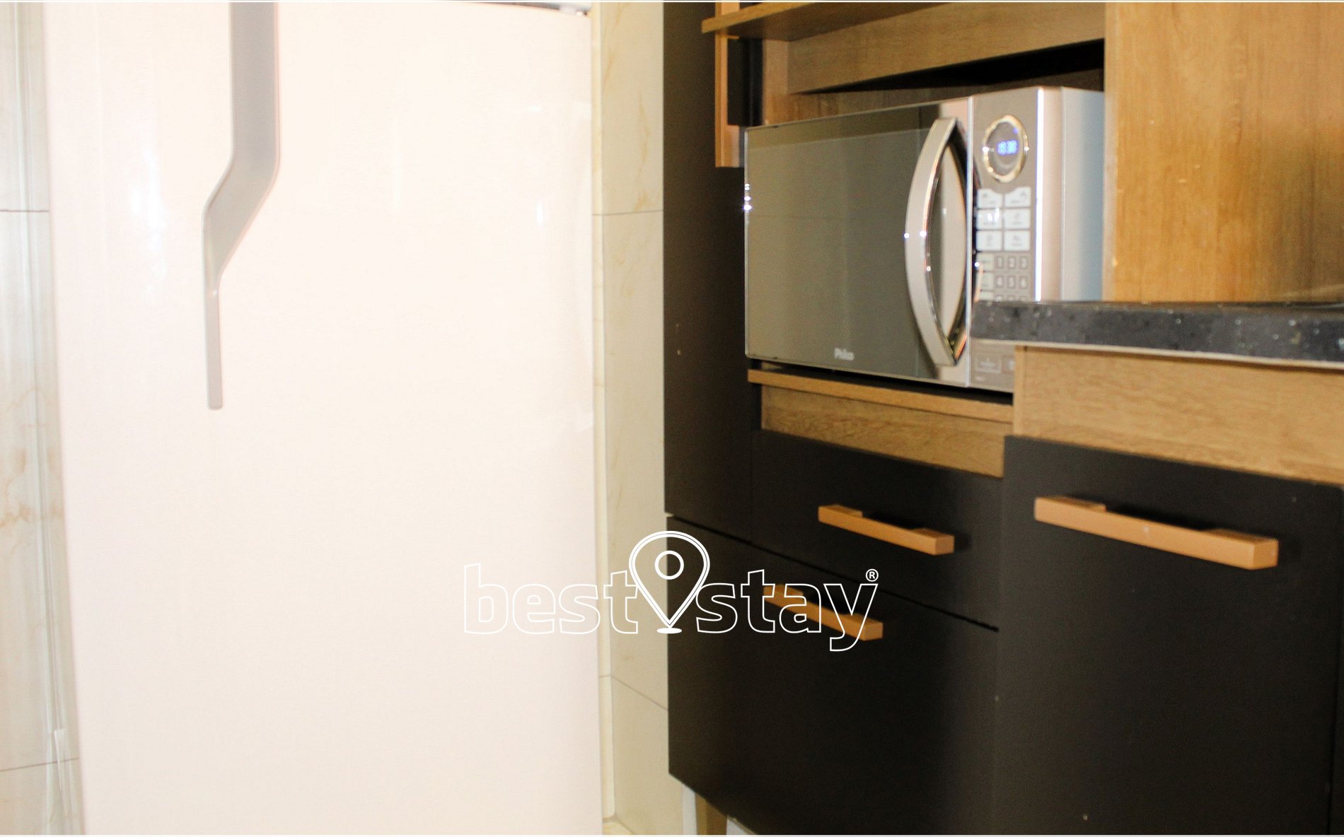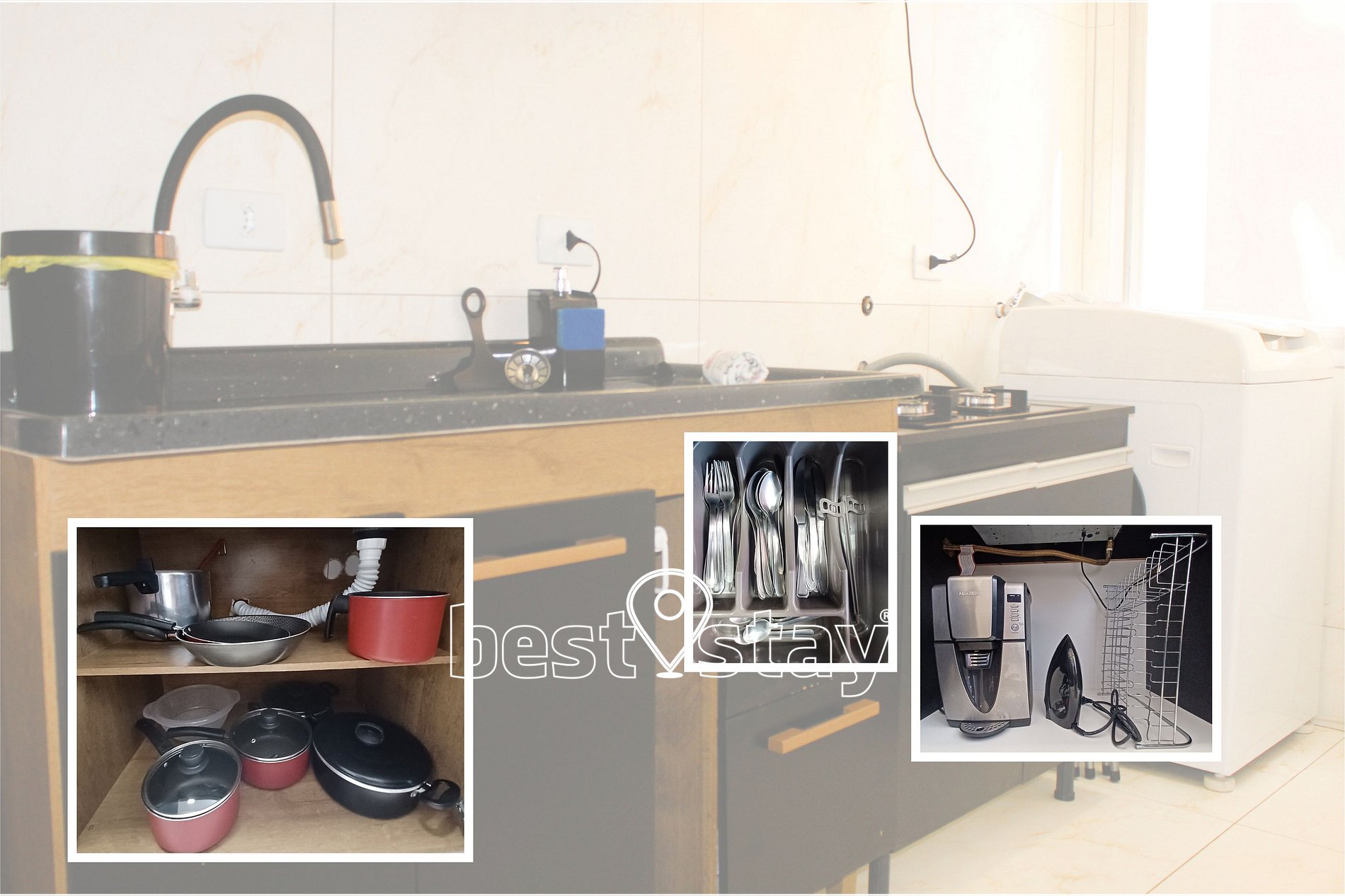 Fogão Cooktop, à gás, 4 bocas, geladeira, forno elétrico, micro-ondas, cafeteira elétrica tradicional, liquidificador, panelas, louças e talheres, e todos os itens necessário para preparar suas refeições. Máquina de lavar (EM MANUTENÇAO), escada, varal para secar roupas, ferro elétrico, tábua de passar.