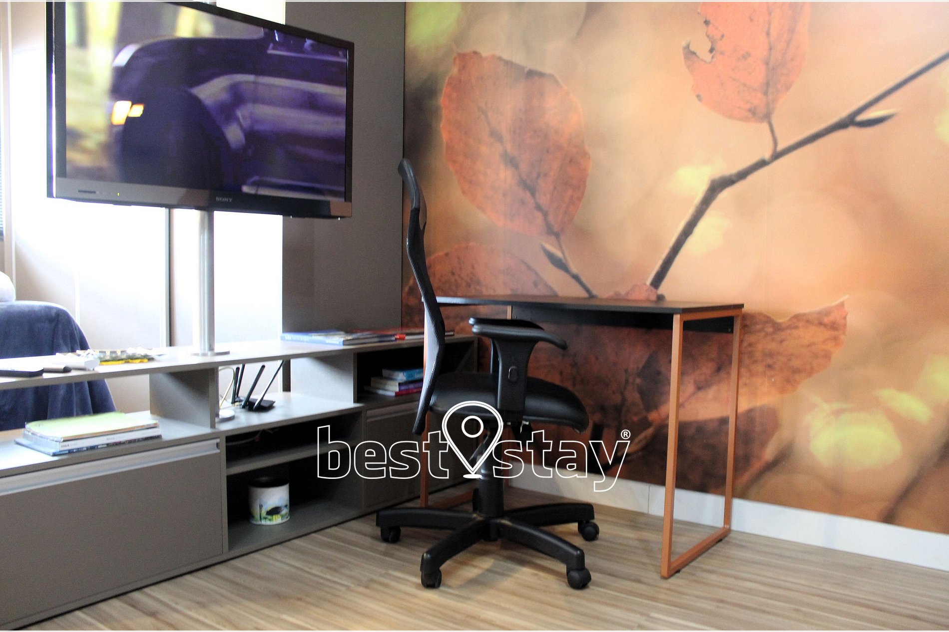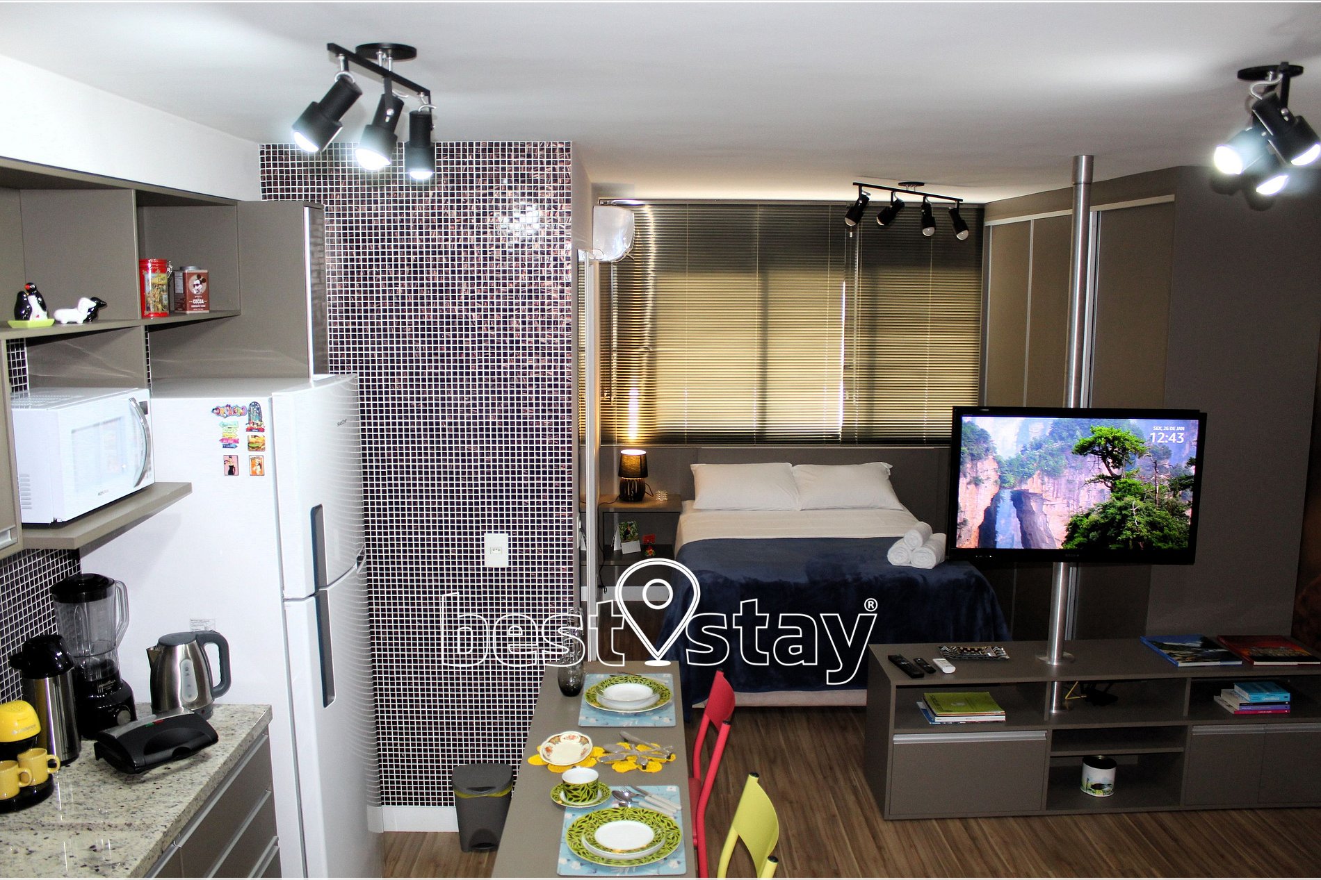 TV com suporte giratório (sala/quarto) com FireTV, sofá-cama super confortável, estação de trabalho com mesa e cadeira confortável. Tudo meticulosamente decorado e com muito conforto.