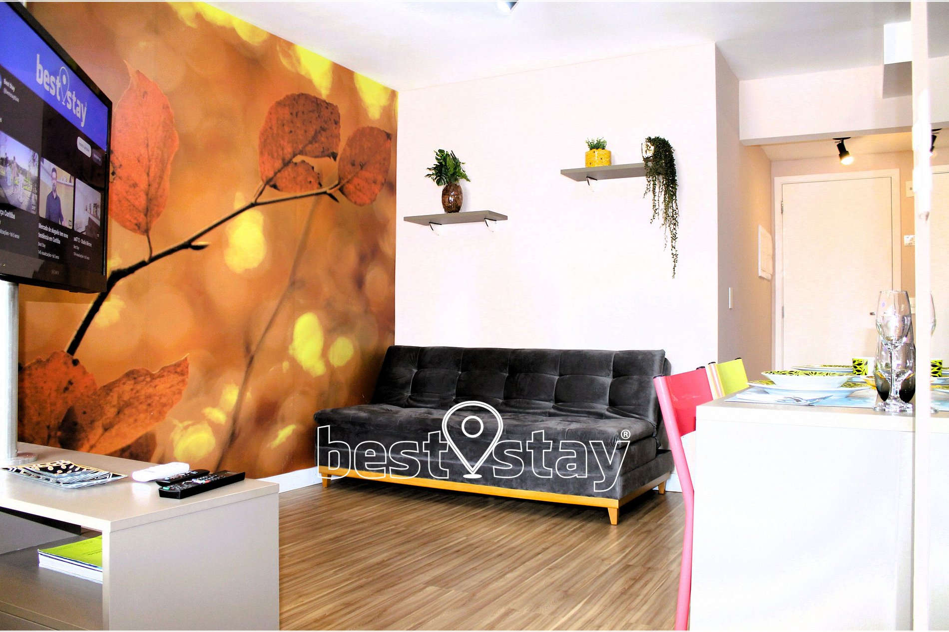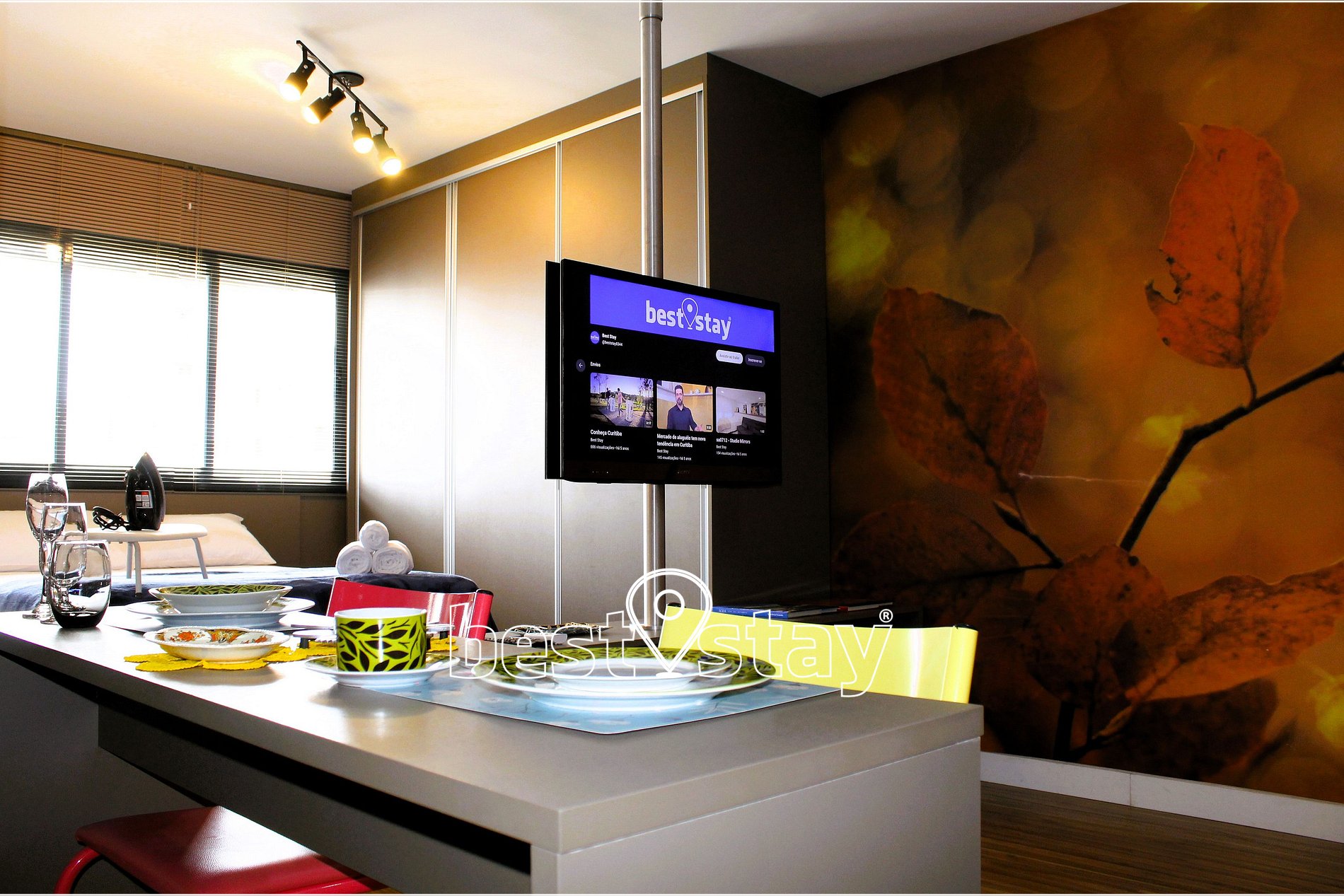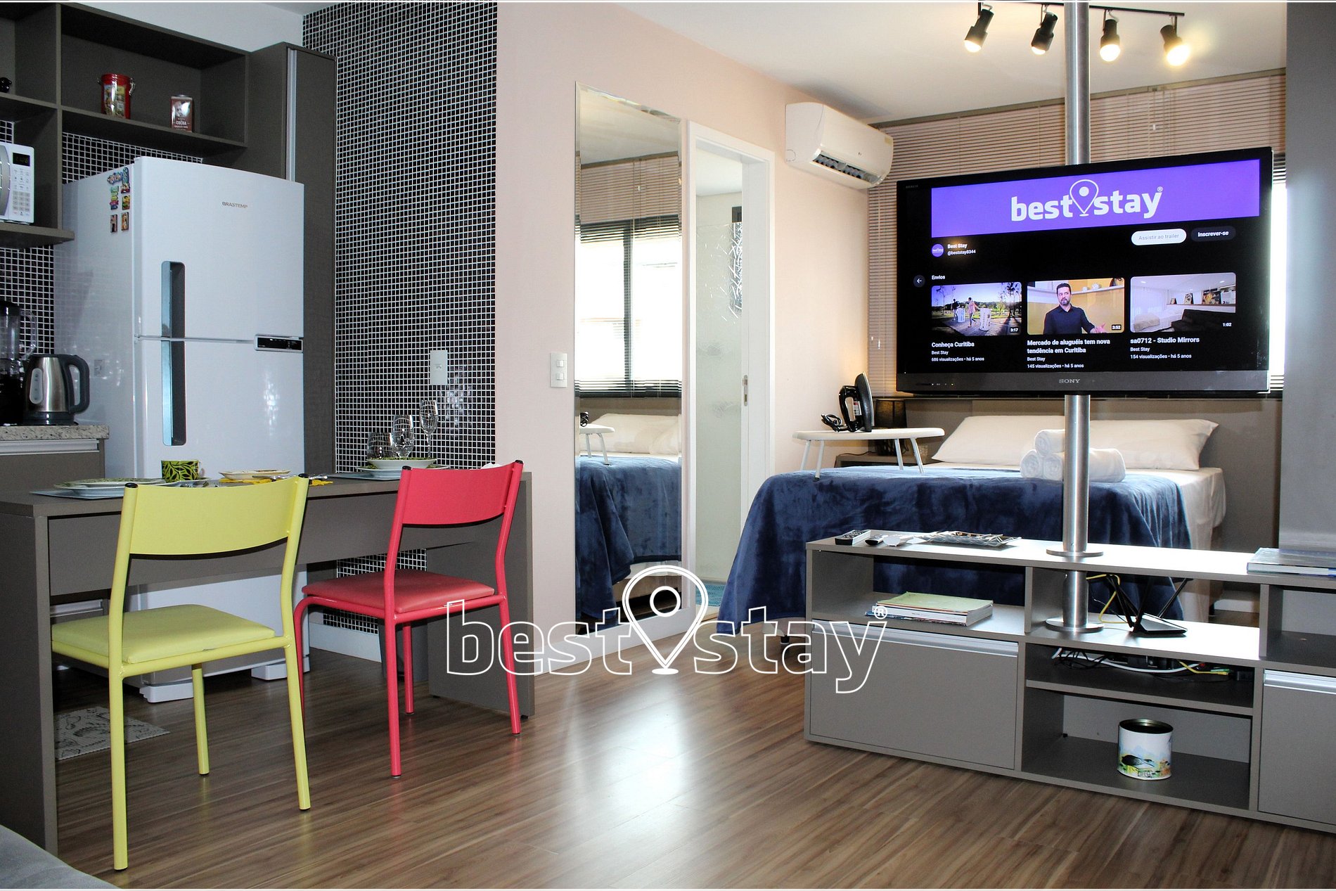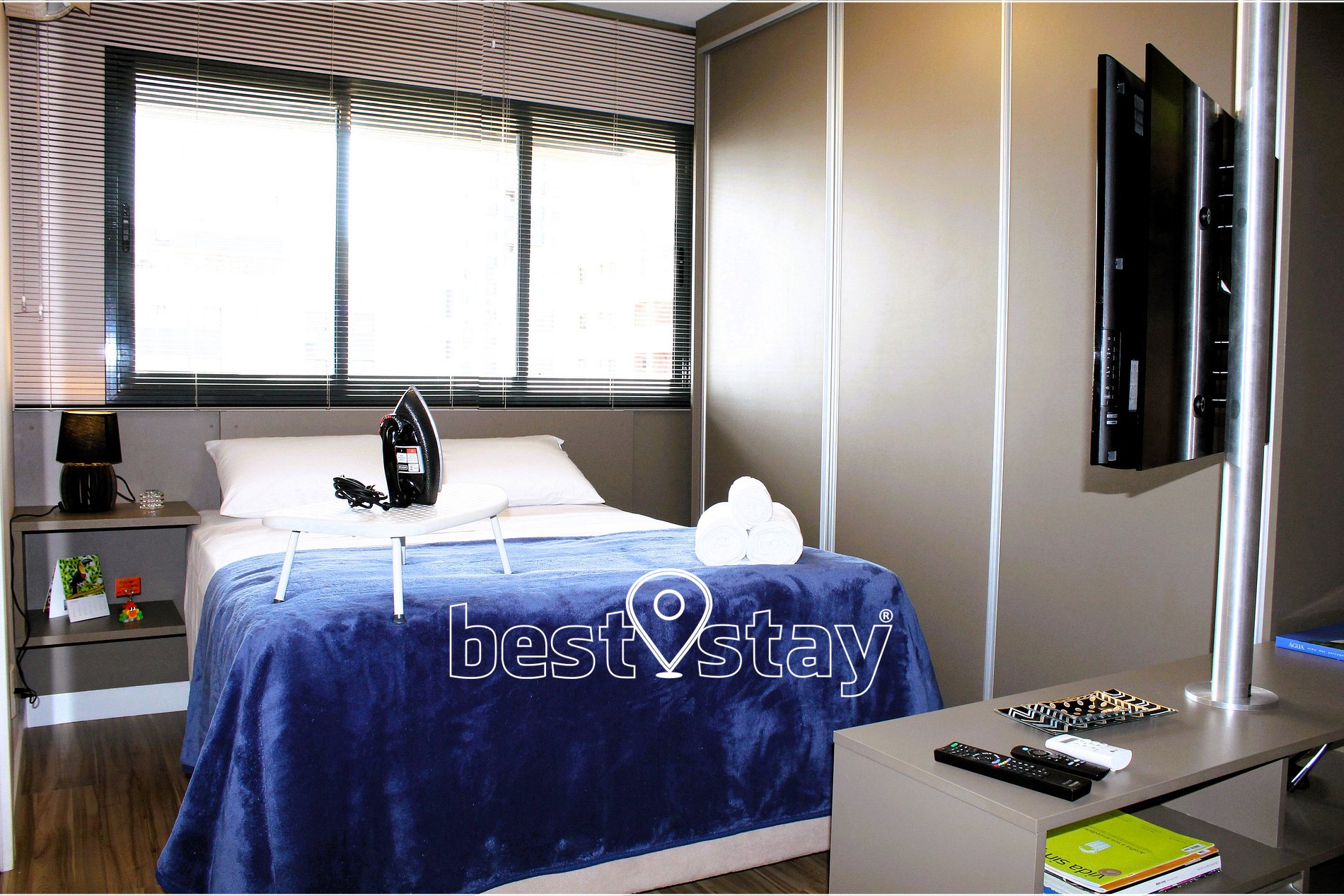 TV com suporte giratório (sala/quarto) com FireTV, sofá-cama super confortável, estação de trabalho com mesa e cadeira confortável. Tudo meticulosamente decorado e com muito conforto.