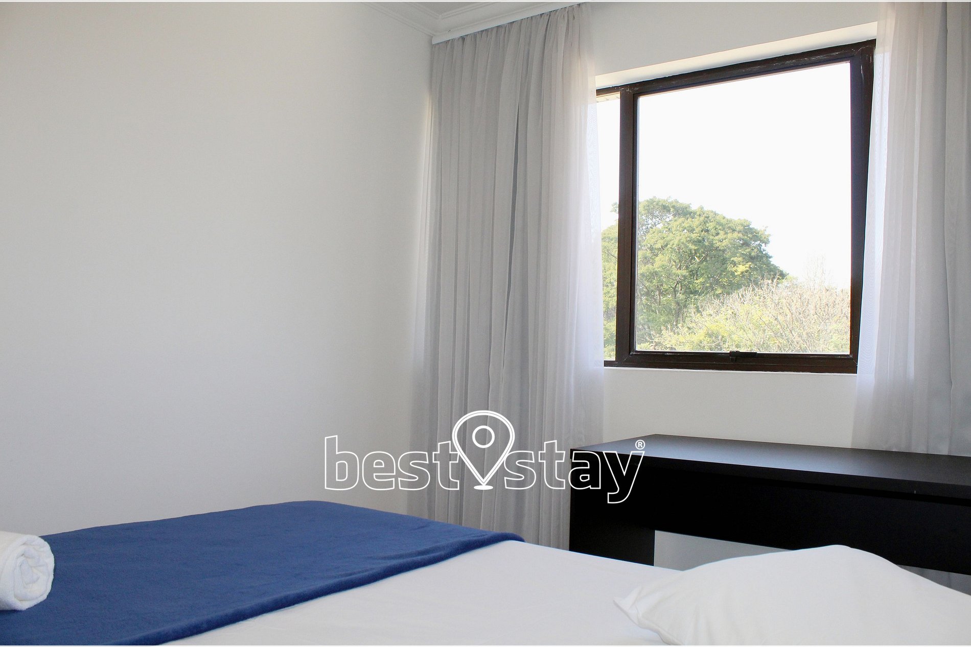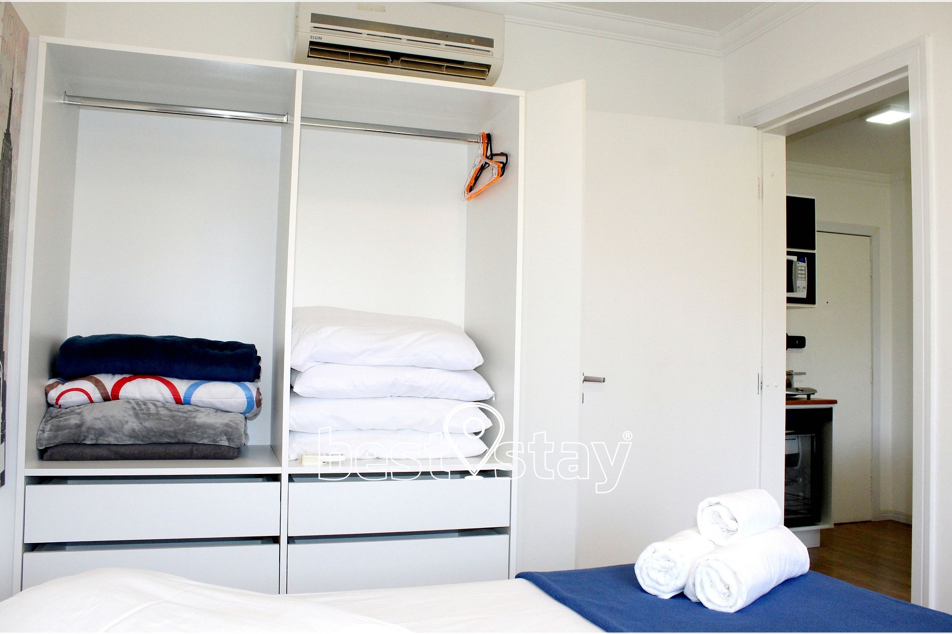 Cama casal, Ar condicionado, guarda roupas, cabides, cobertas, travesseiros, rouparia de cama e banho, ferro de passar.