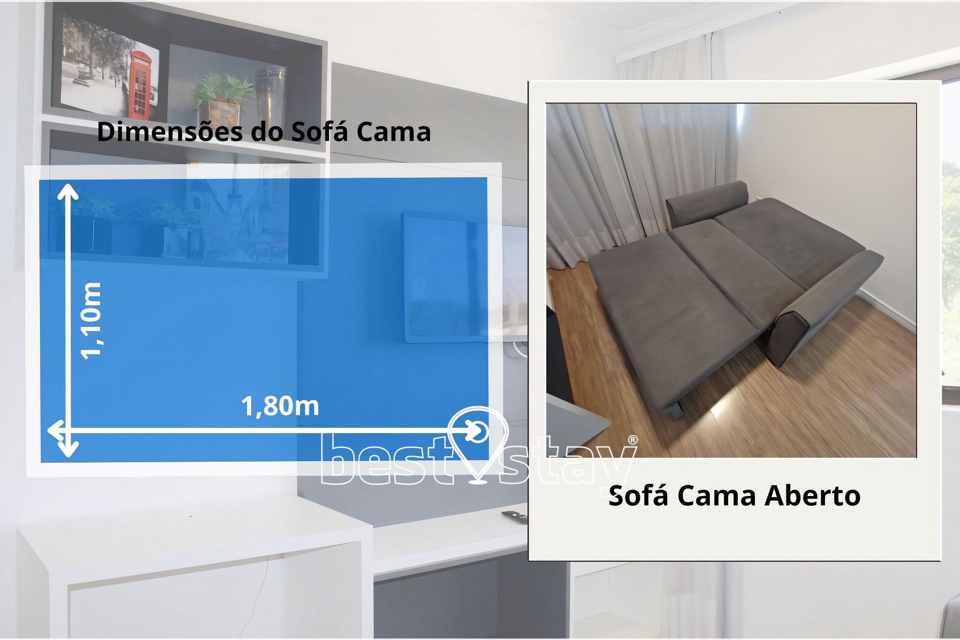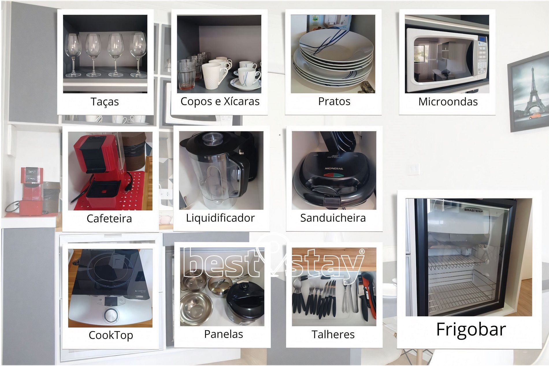 Cooktop indução de balcão (1 boca), panela de pressão elétrica, mesa c/ 4 cadeiras, para refeições, frigobar, micro-ondas, sanduicheira, cafeteira de cápsulas 3 Corações, liquidificador, panelas, taças, louças e talheres, utensílios, detergente, esponja de louça e todos os acessórios necessários para preparar seu café da manhã e demais refeições, TV Smart 48", Sofá-cama.