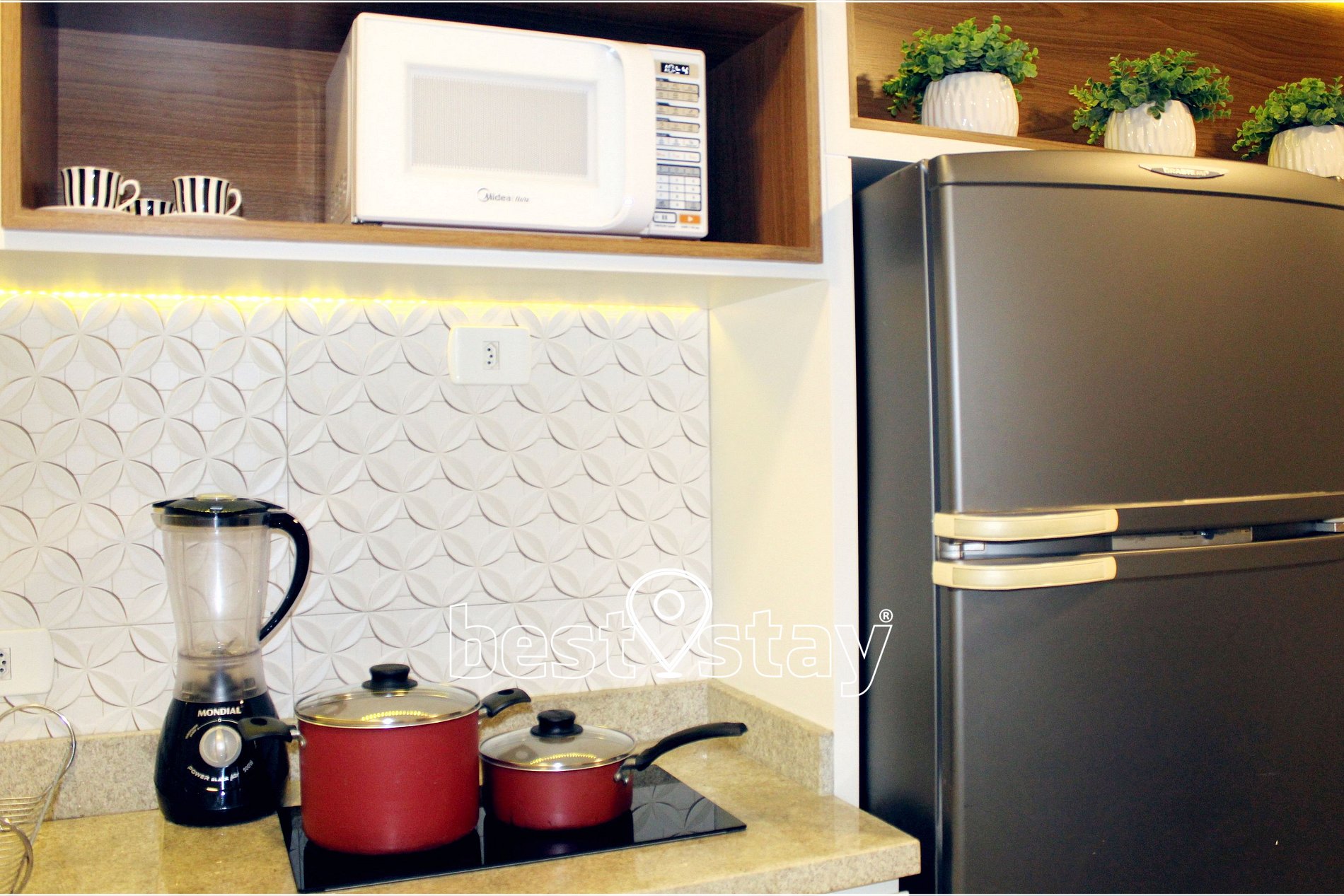 Fogão cooktop elétrico de 2 bocas, Microondas, geladeira duplex com freezer, micro-ondas, cafeteira cápsulas Nespresso, chaleira elétrica, Sanduicheira, liquidificador, espremedor de frutas., panelas, copos, taças, louças, talheres, e todos o itens necessário na cozinha para que você possa preparar sua refeições. Pia com água quente e aquecimento central com ótima pressão.