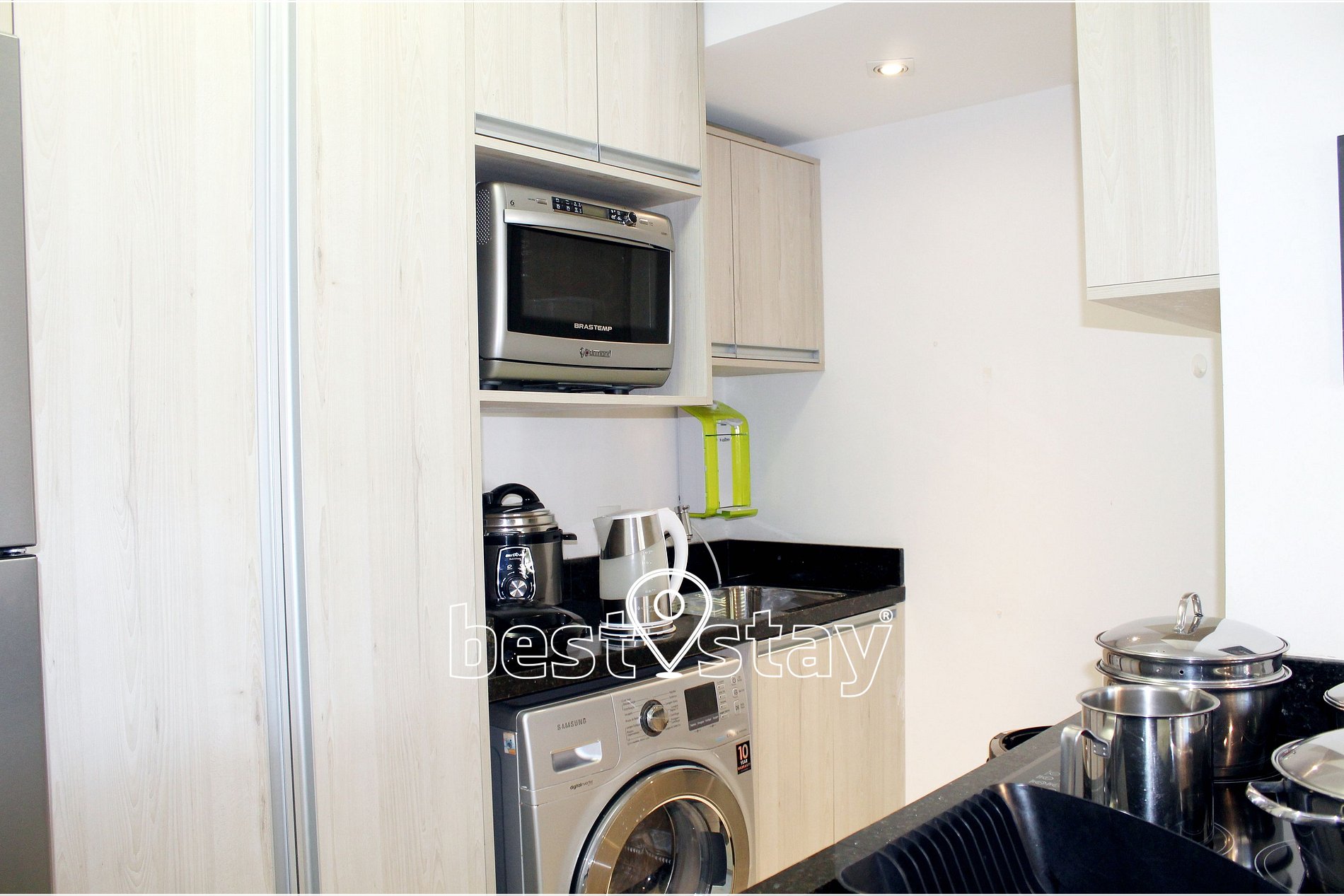 Tipo americana c/ balcão, mesa para refeições com 4 cadeiras, fogão Cooktop de indução - 4 bocas - geladeira duplex, micro-ondas/forno elétrico em um único aparelho, cafeteira elétrica tradicional, liquidificador, batedeira, pipoqueira, panela de pressão elétrica, chaleira elétrica, panelas de inox, louças, utensílios de cozinha diversos, formas, travessas, talheres, etc. Lavadora/Secadora de roupas. Água quente com aquecimento central e ótima pressão.