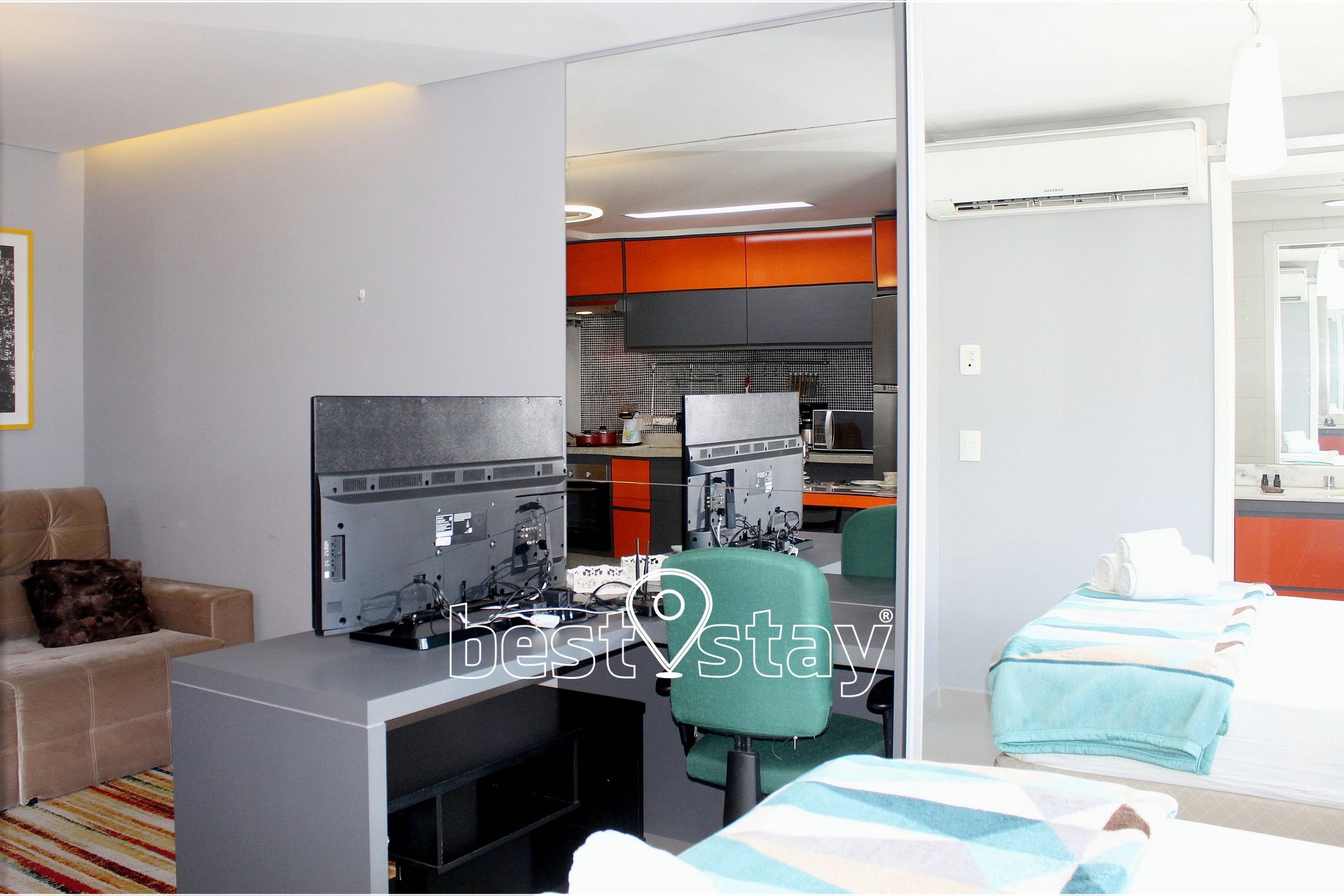 TV com FireTV, sofá chease super confortável, colchão de solteiro extra. Tudo meticulosamente decorado e com muito conforto.