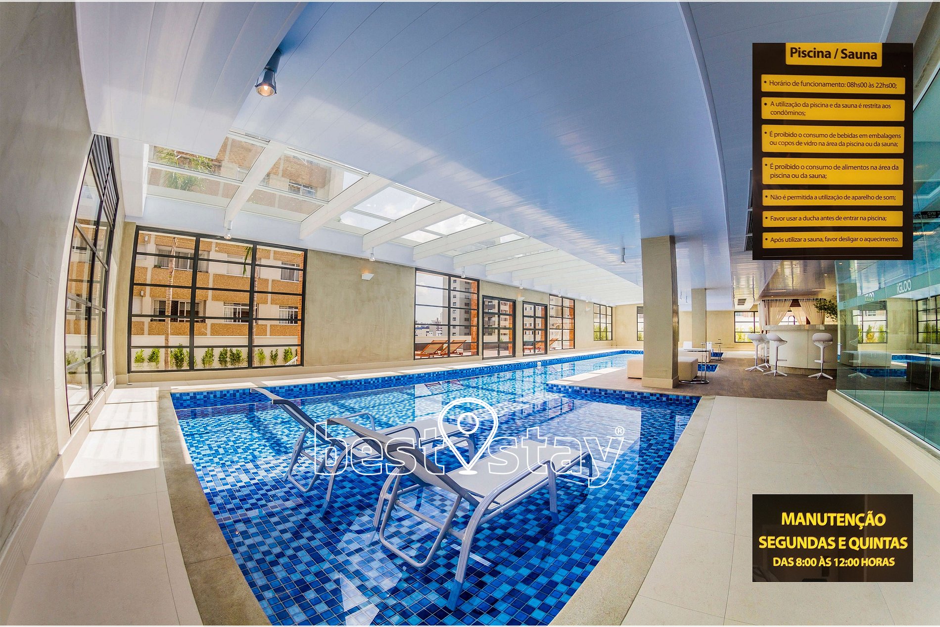 - A Best Stay não administra as áreas sociais do condomínio e também não tem autonomia sobre as mesmas. Apenas seguimos todas as regras da administração, que valem também para todos os moradores. Não nos responsabilizamos pelo funcionamento e manutenção das áreas sociais, que estão sujeitas a paradas e fechamentos para manutenção, sem aviso prévio.