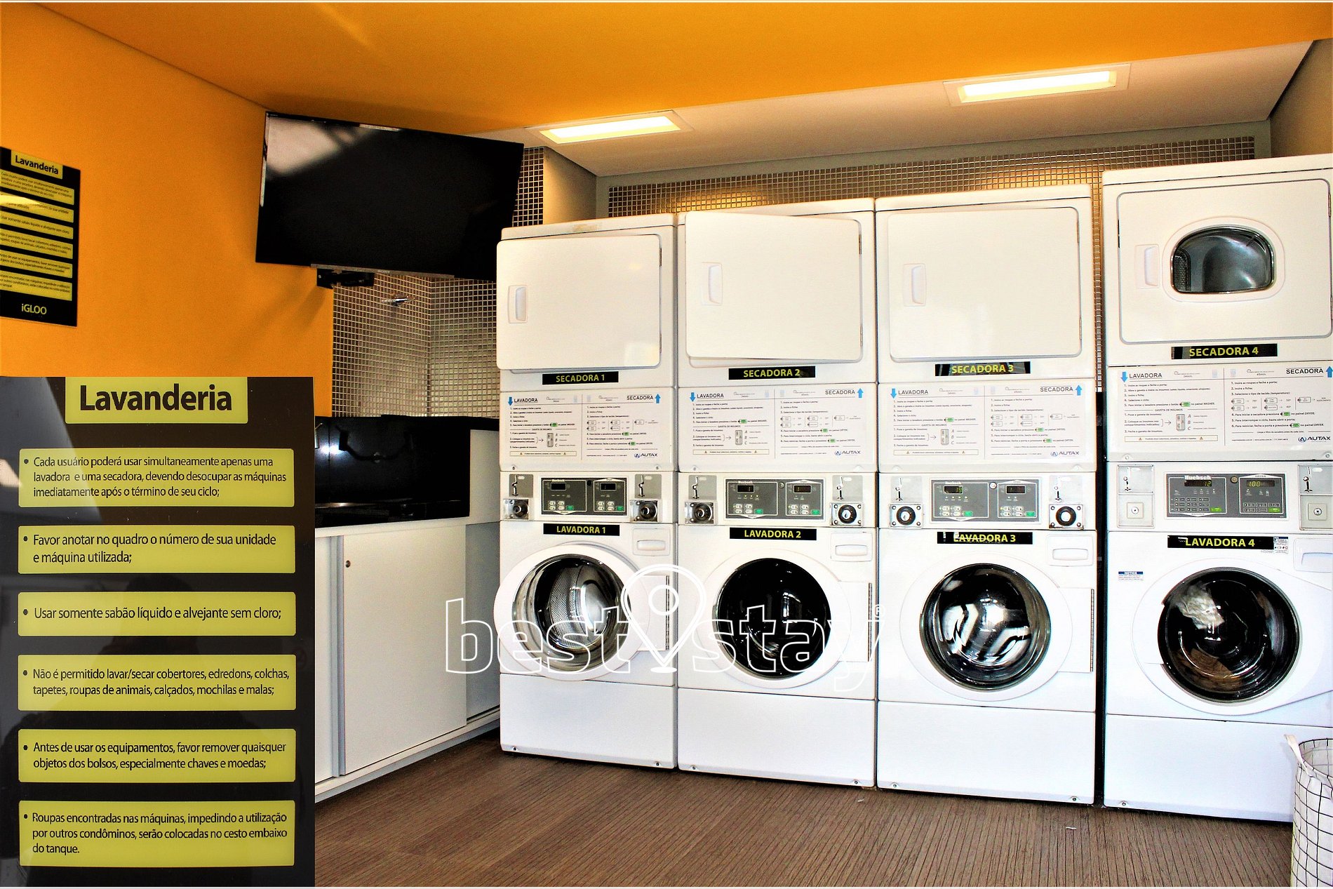 - LAVANDERIA: é permitido uso mediante compra das fichas com o Anfitrião, limitados a 02 fichas por dia e pagamento antecipado. Não são fornecidos produtos para lavagem, e deve ser usado sabão liquido nas máquinas.