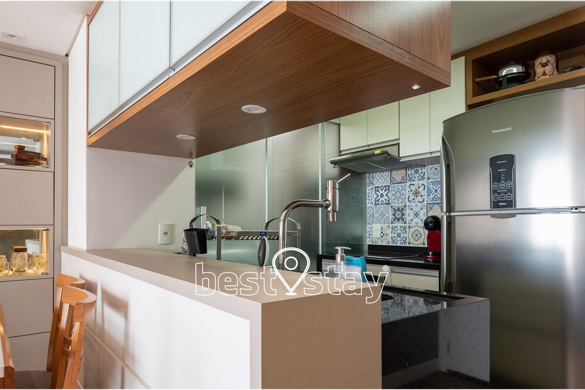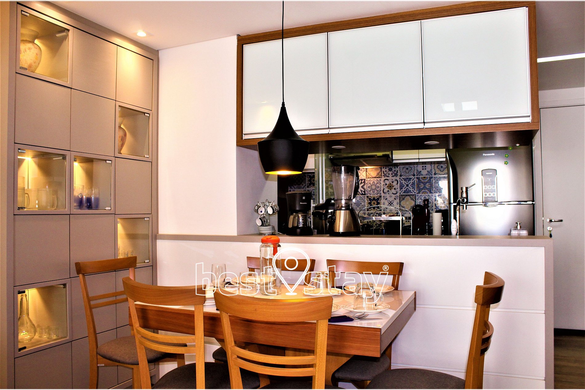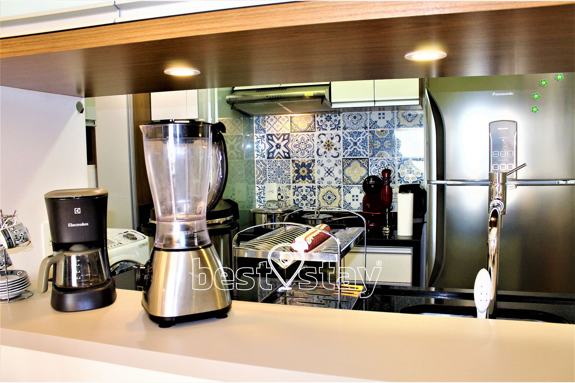 Tipo americana, fogão Cooktop 4 bocas, forno embutido, geladeira, micro-ondas, cafeteira Dolce Gusto de cápsulas, cafeteira elétrica tradicional, liquidificador, panela de pressão elétrica, panela de arroz elétrica, panelas tradicionais, louças, talheres, travessas, copos, xícaras, etc. Realmente muito equipado e com todos utensílios de cozinha. Água quente com aquecimento central e ótima pressão.