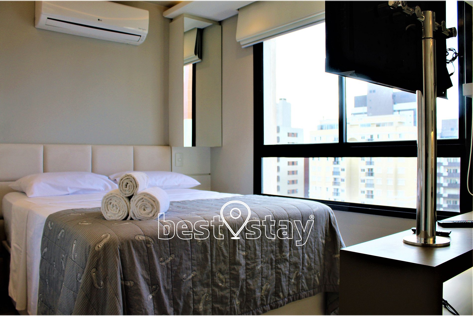 Tv 32 polegadas com FireTV Amazon, Cama casal baú, armários para roupas com cabides, estação para trabalho com cadeira, ar condicionado quente e frio. Banheiro privativo c/ ducha higiênica, ducha com água de aquecimento central a gás com uma maravilhosa pressão, proporcionando banhos deliciosos e relaxantes, telas de proteção na janela.