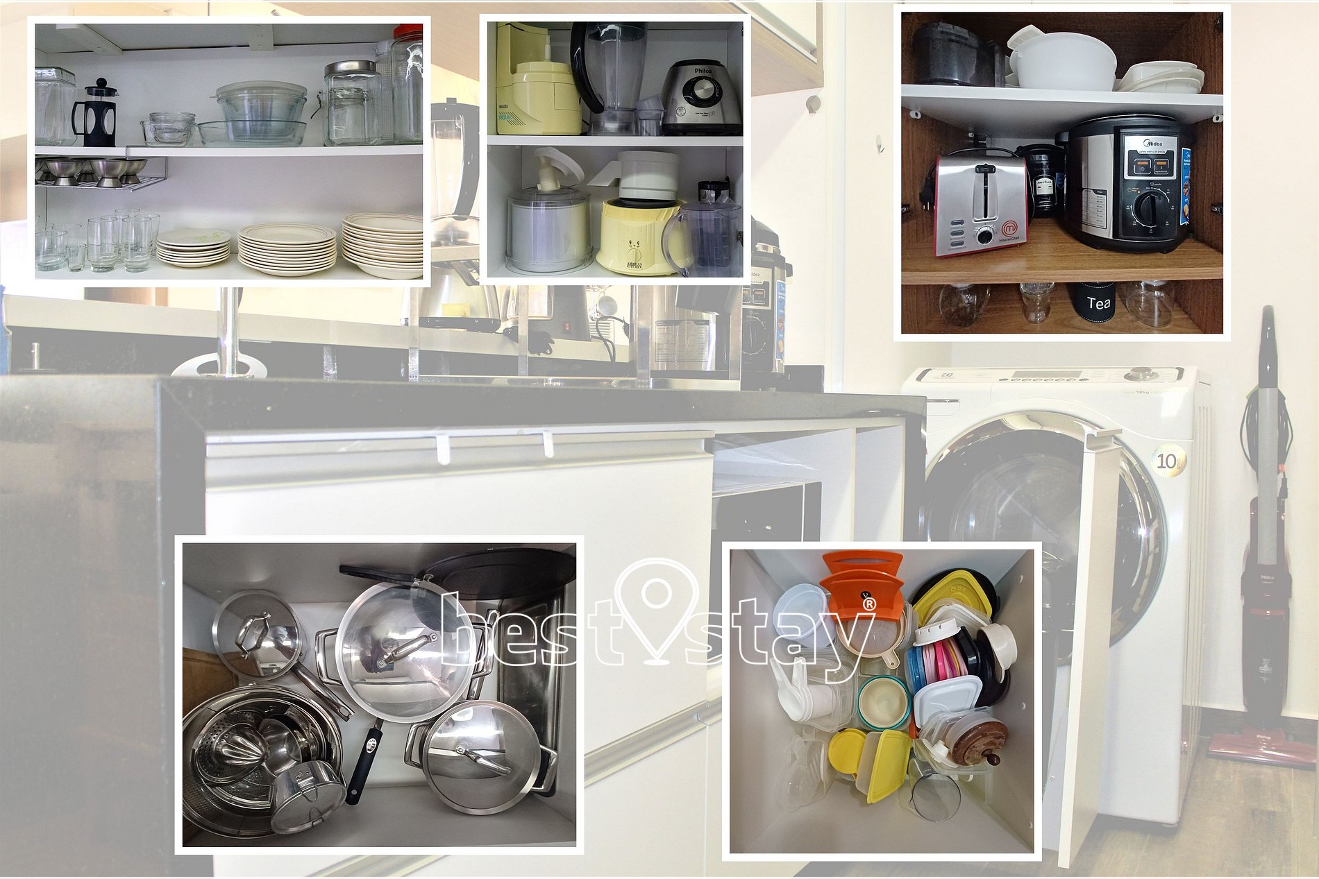 Máquina lava e seca, material de limpeza, vassoura, rodo, panos, etc.