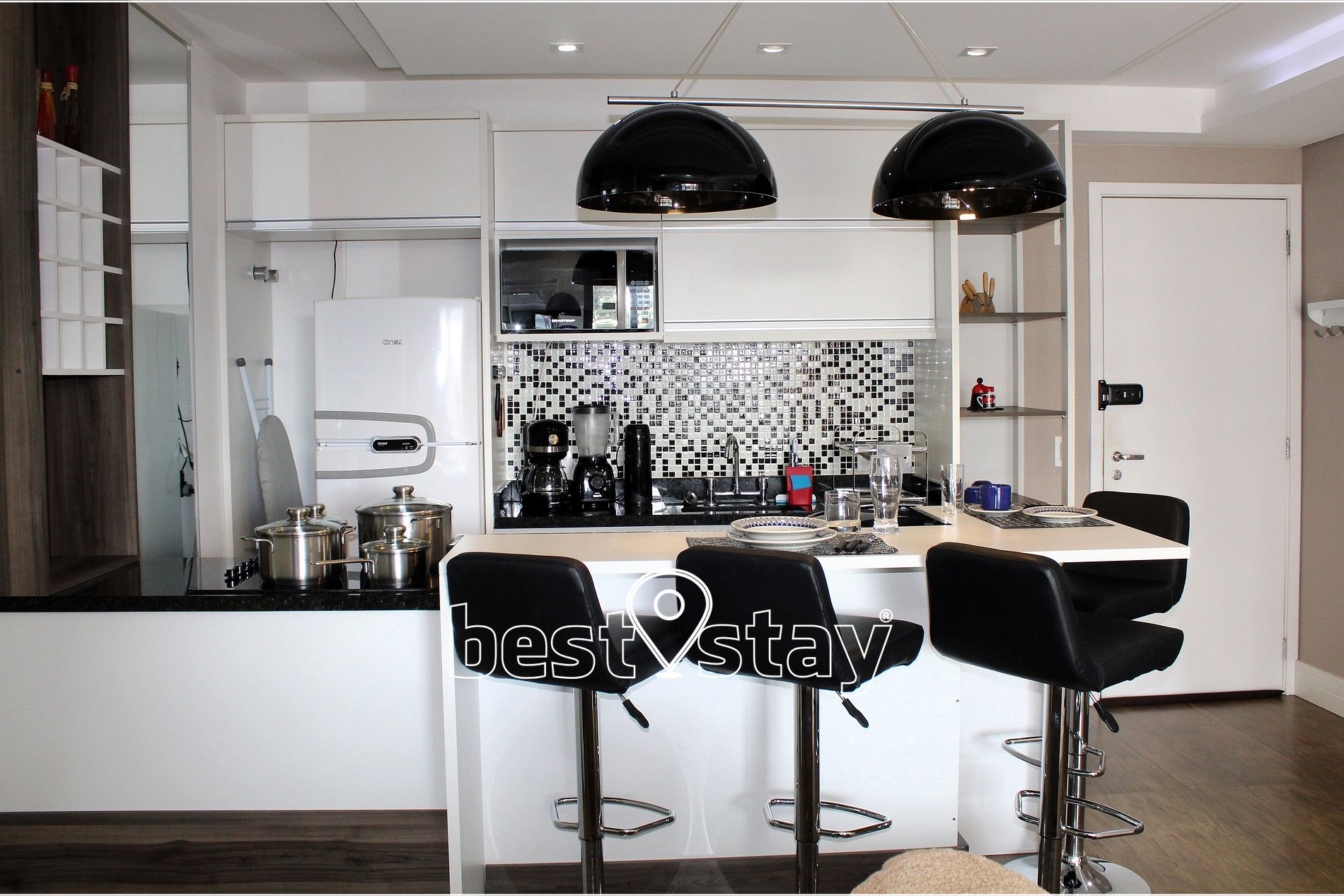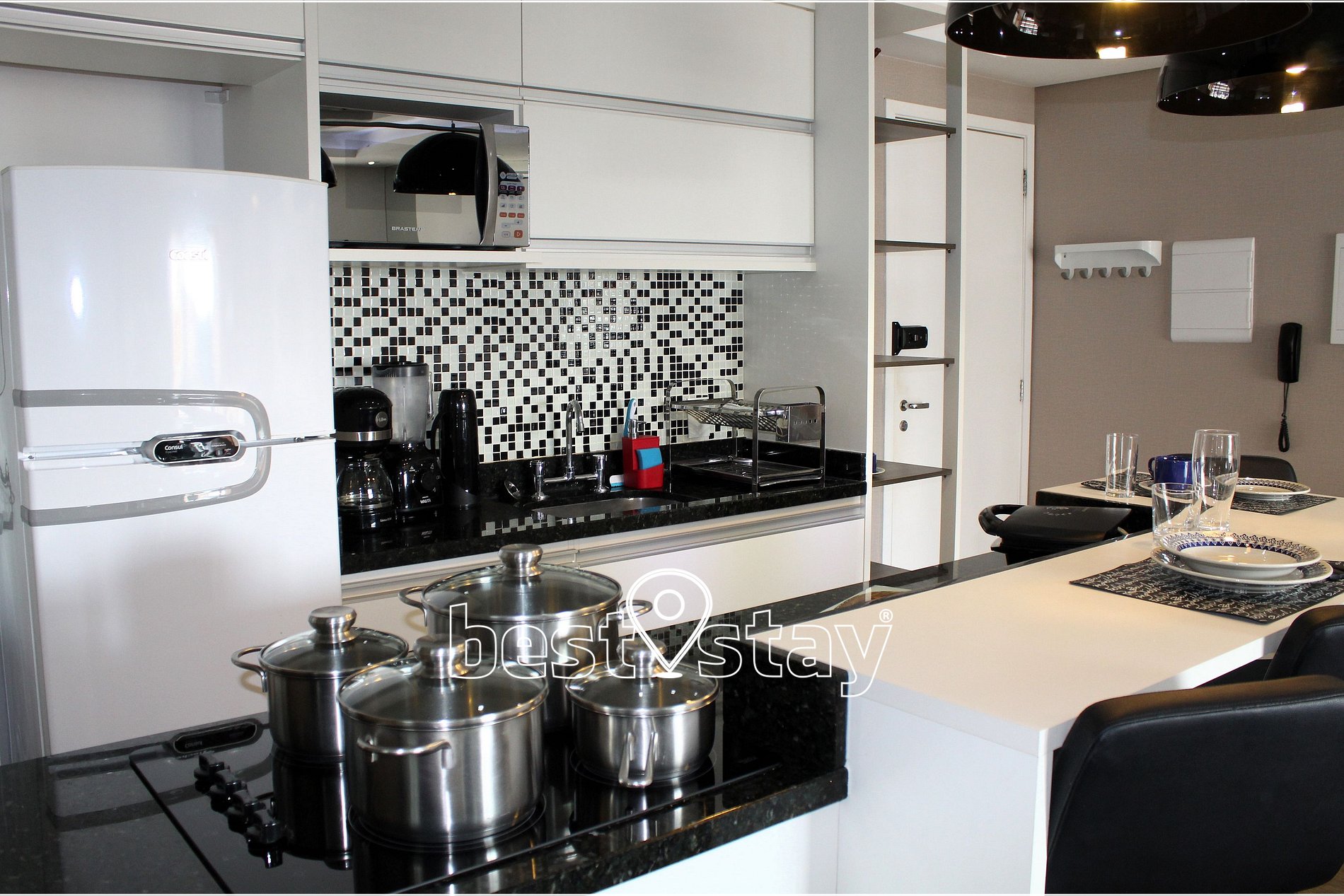 Tipo americana, bancada com 3 banquetas, para refeições, fogão Cooktop elétrico com 4 bocas, geladeira, micro-ondas, cafeteira elétrica tradicional, liquidificador, sanduicheira, panela de pressão, panelas, utensílios de cozinha, louças e talheres. Água quente com aquecimento central e ótima pressão.