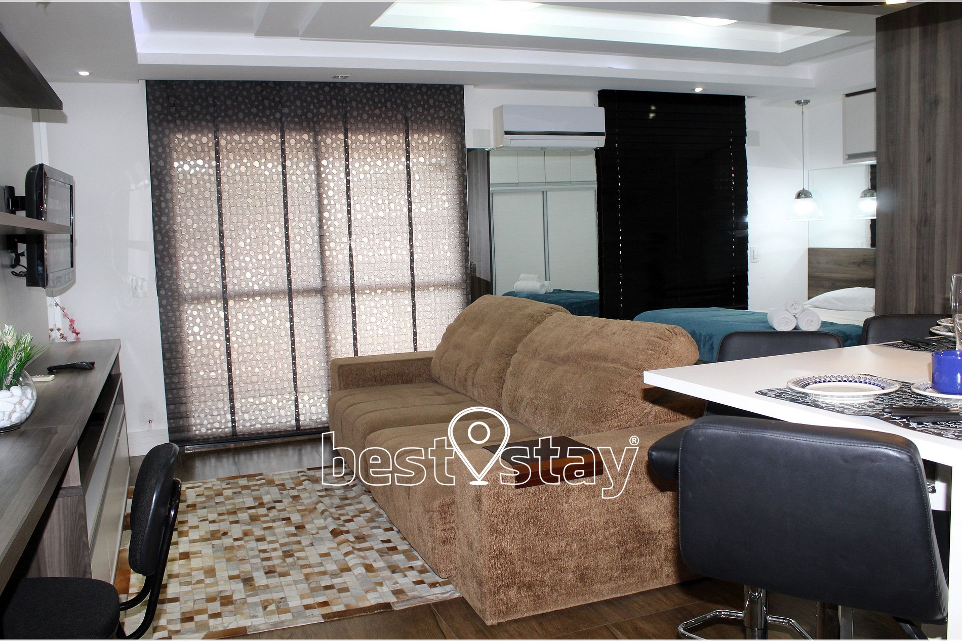 Cama de casal, guarda roupas, cabides, ferro e tábua de passar, cobertores e travesseiros. TV c/ streaming box, para conexão com aplicativos de streaming, sofá chease, estação de trabalho/estudo. Tudo meticulosamente decorado, com muito conforto e blackout nas cortinas.