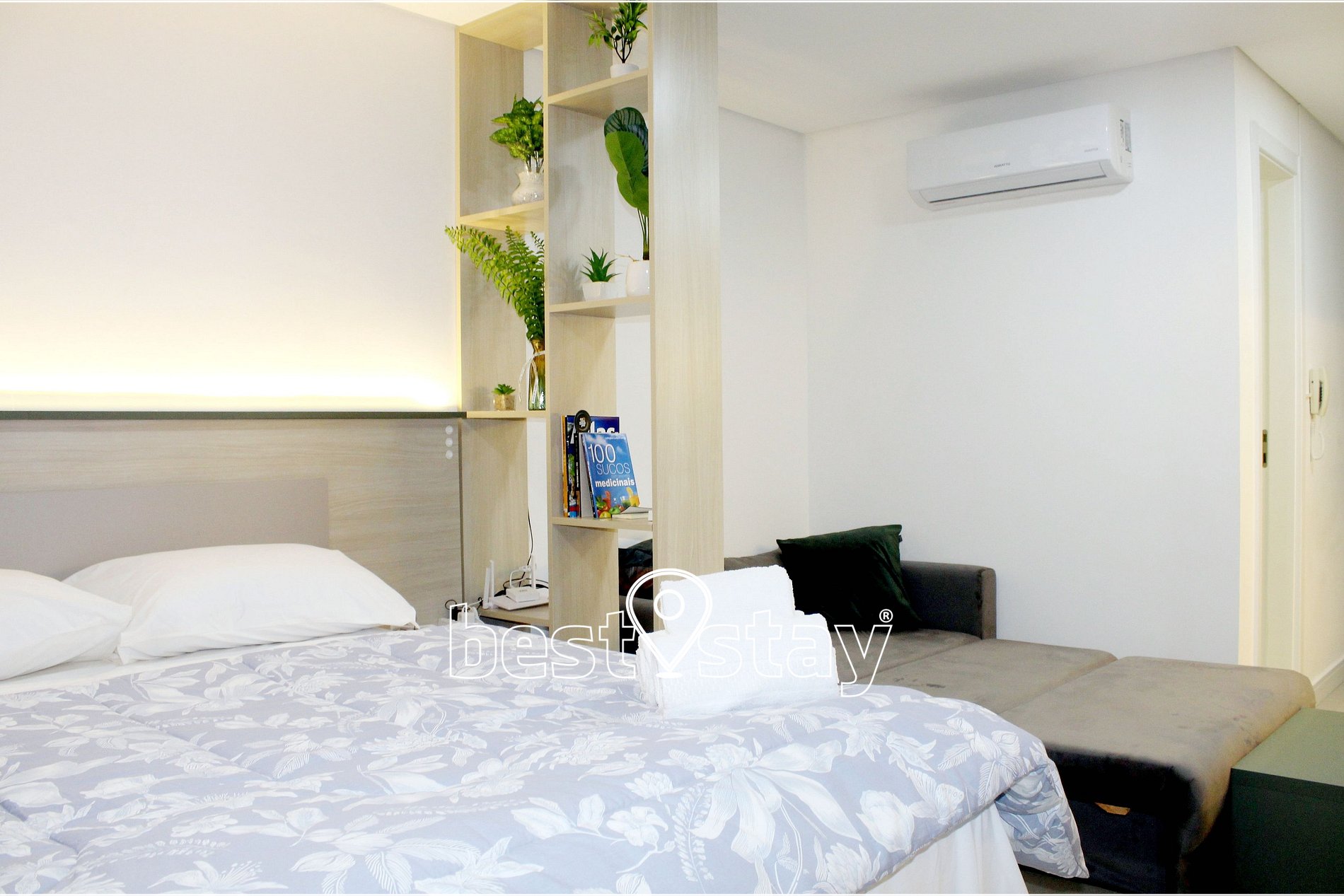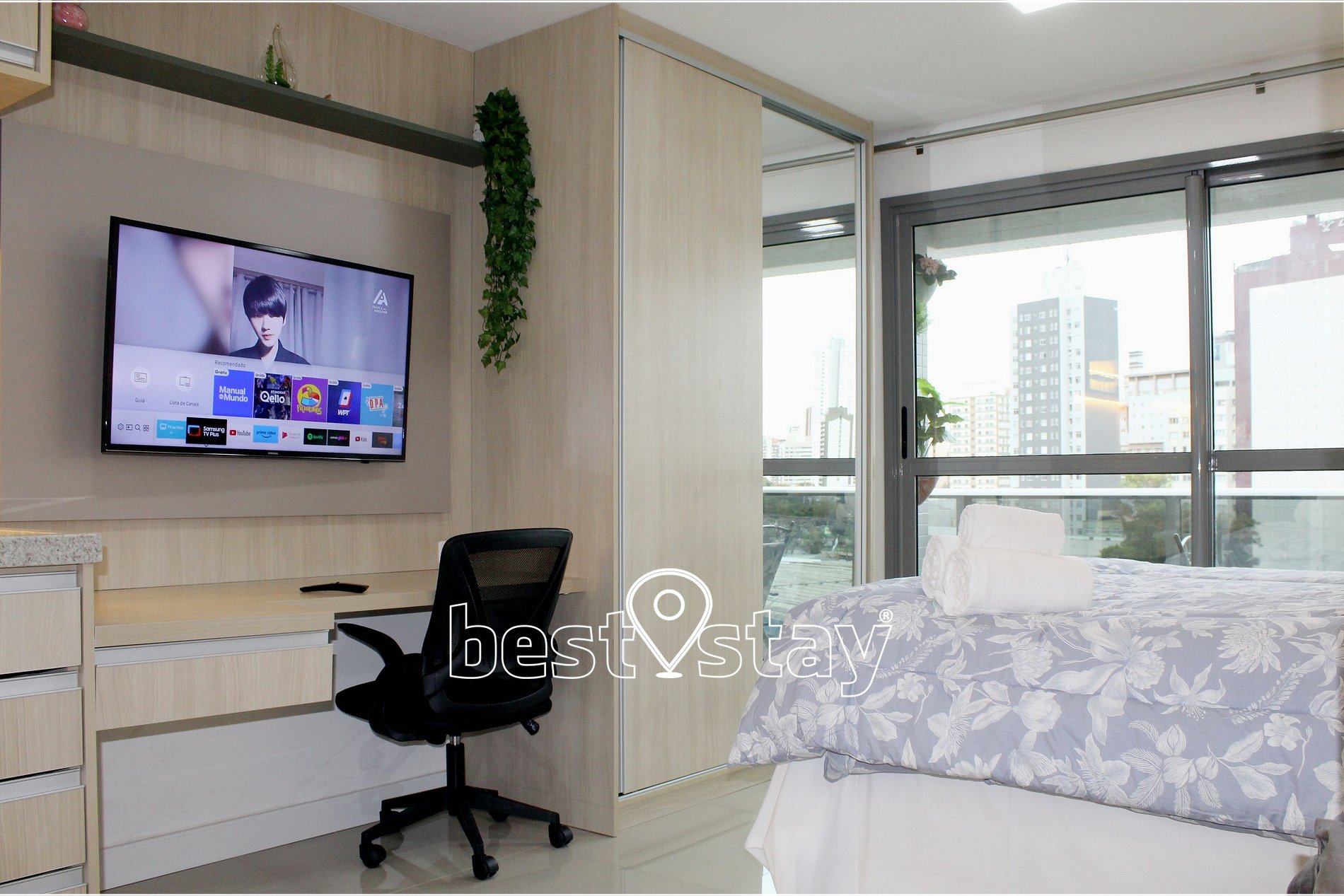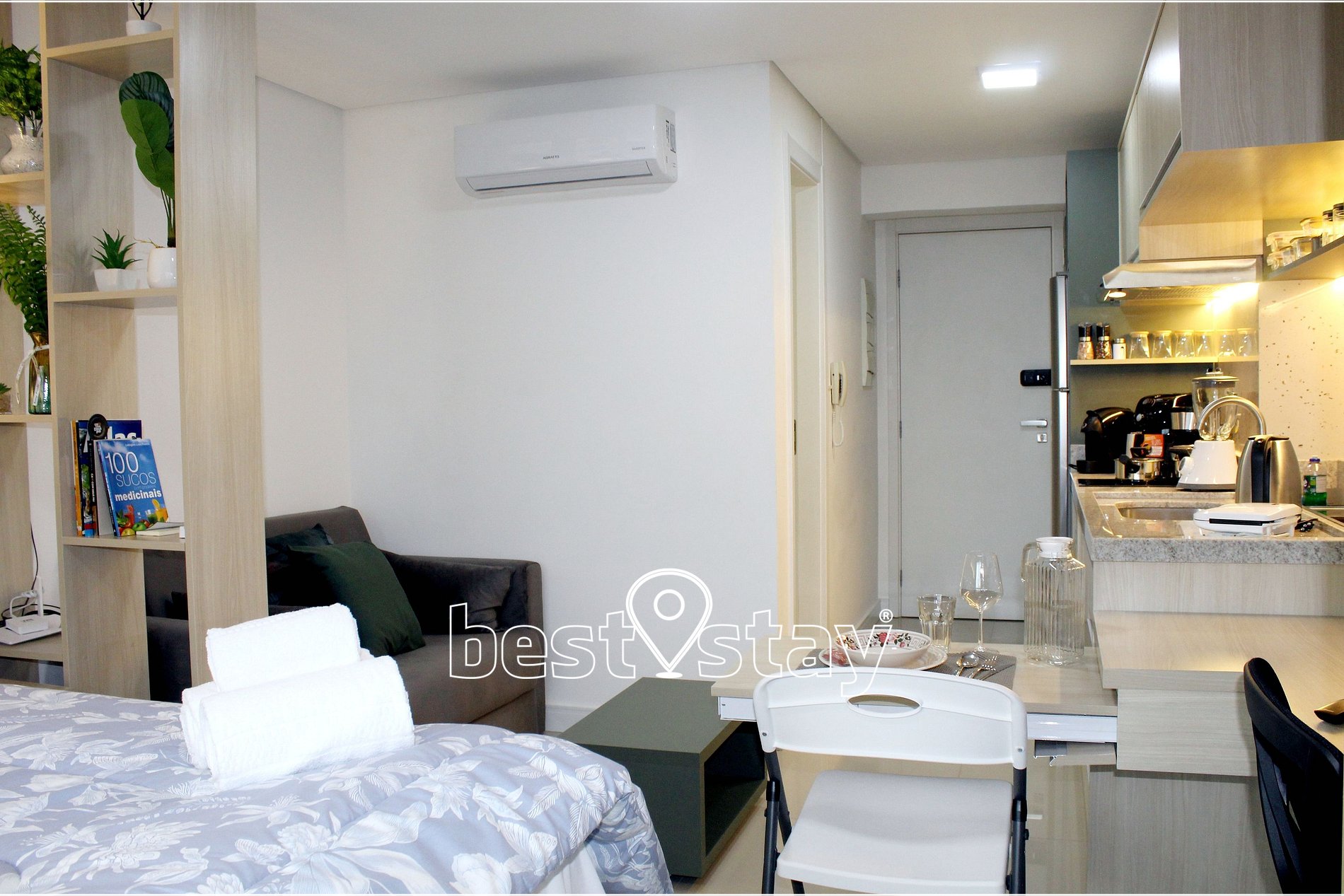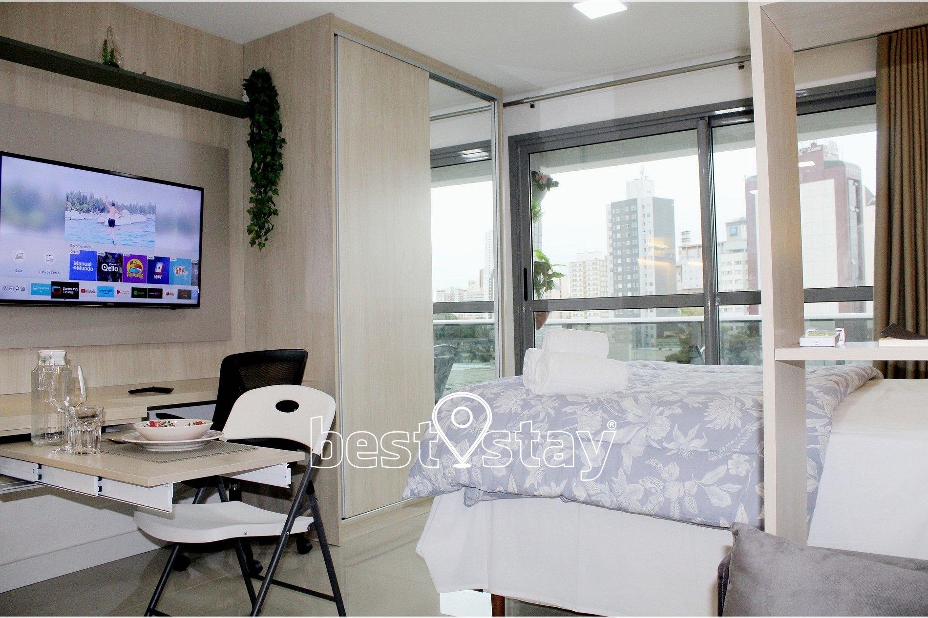Ar condicionado (quente/frio), SmarTv, Cama confortável e colchão novos, criado mudo, sofá-cama, guarda roupa, cabides, ferro e tábua de passar embutida no guarda roupas, área de trabalho/estudos, bancada para refeições, porta balcão para varanda e cortinas com blackout.