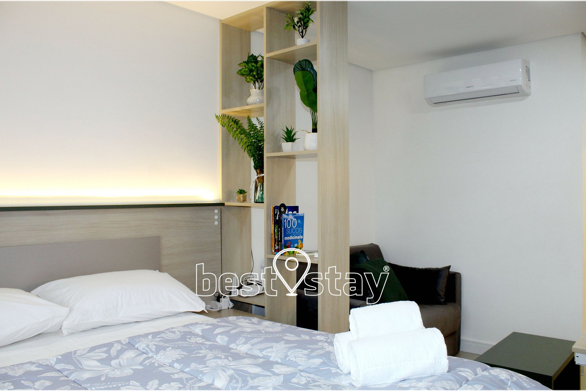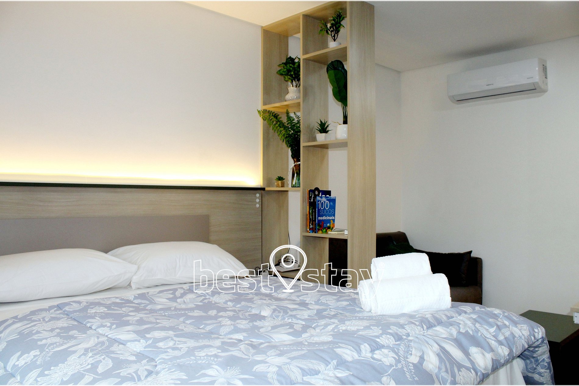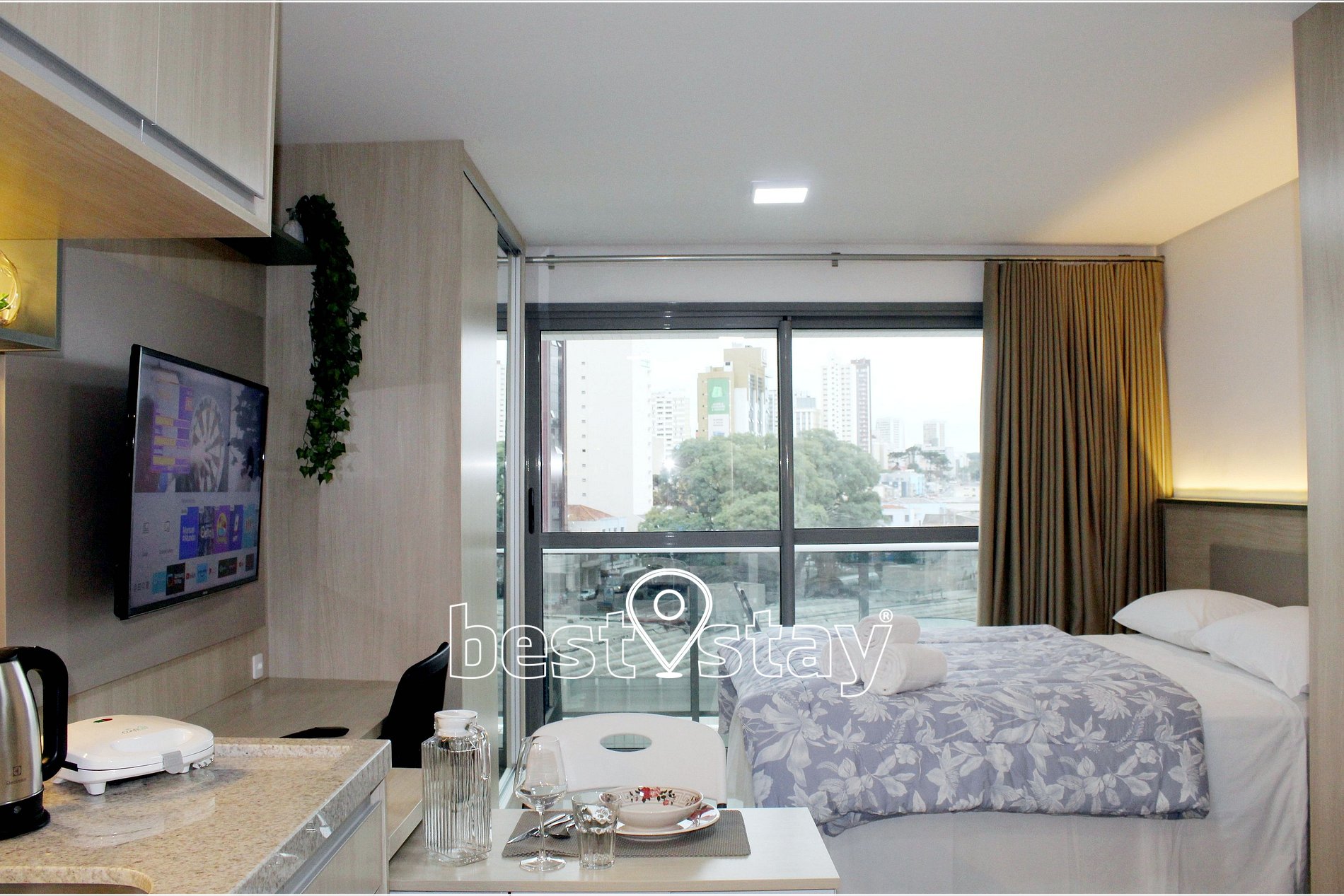 Ar condicionado (quente/frio), SmarTv, Cama confortável e colchão novos, criado mudo, sofá-cama, guarda roupa, cabides, ferro e tábua de passar embutida no guarda roupas, área de trabalho/estudos, bancada para refeições, porta balcão para varanda e cortinas com blackout.