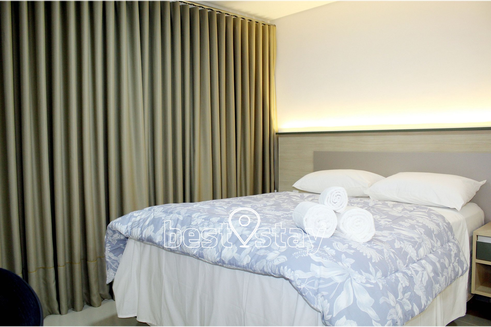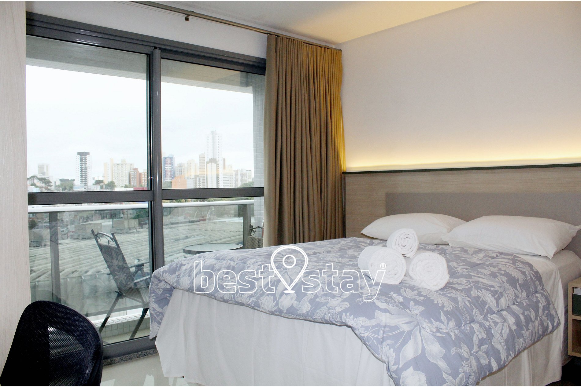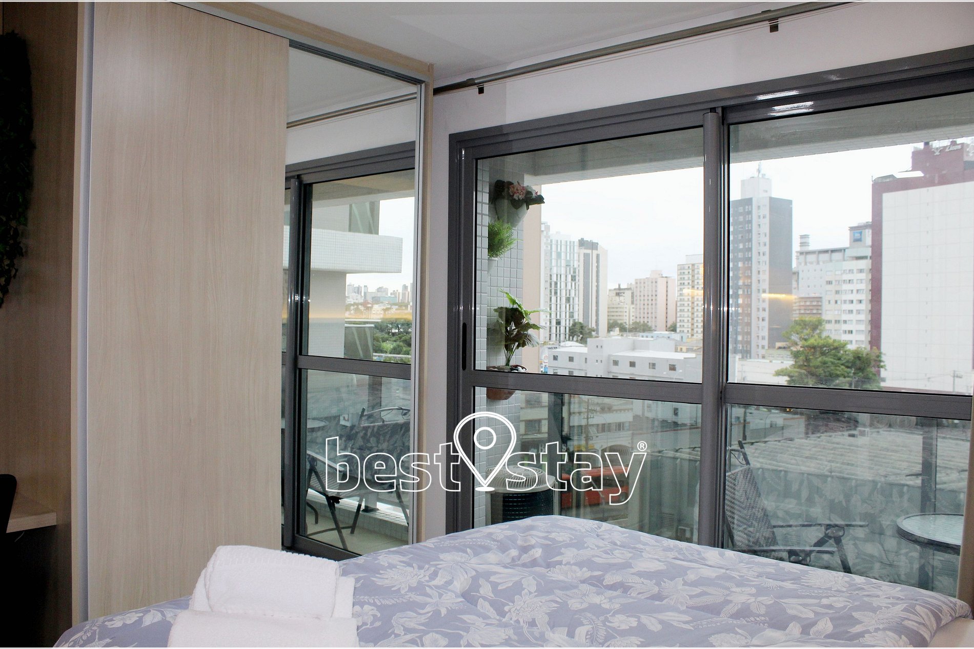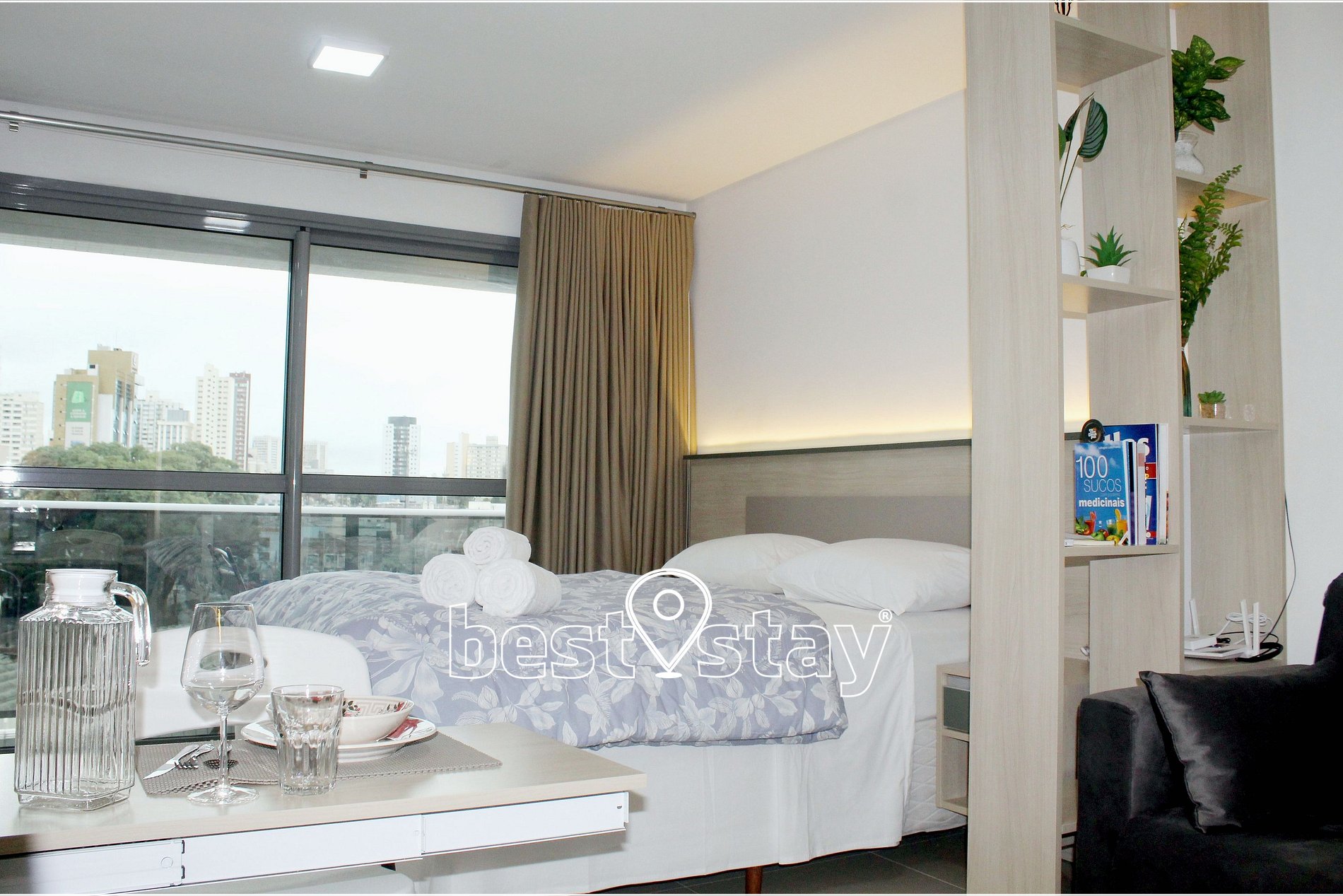 Ar condicionado (quente/frio), SmarTv, Cama confortável e colchão novos, criado mudo, sofá-cama, guarda roupa, cabides, ferro e tábua de passar embutida no guarda roupas, área de trabalho/estudos, bancada para refeições, porta balcão para varanda e cortinas com blackout.