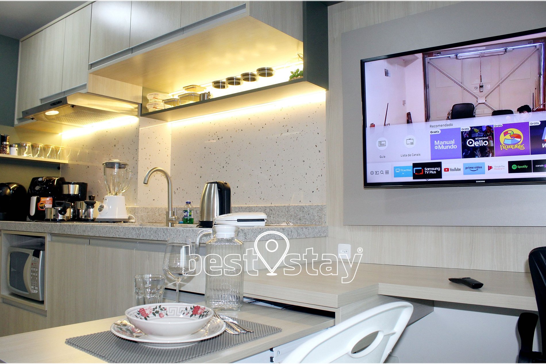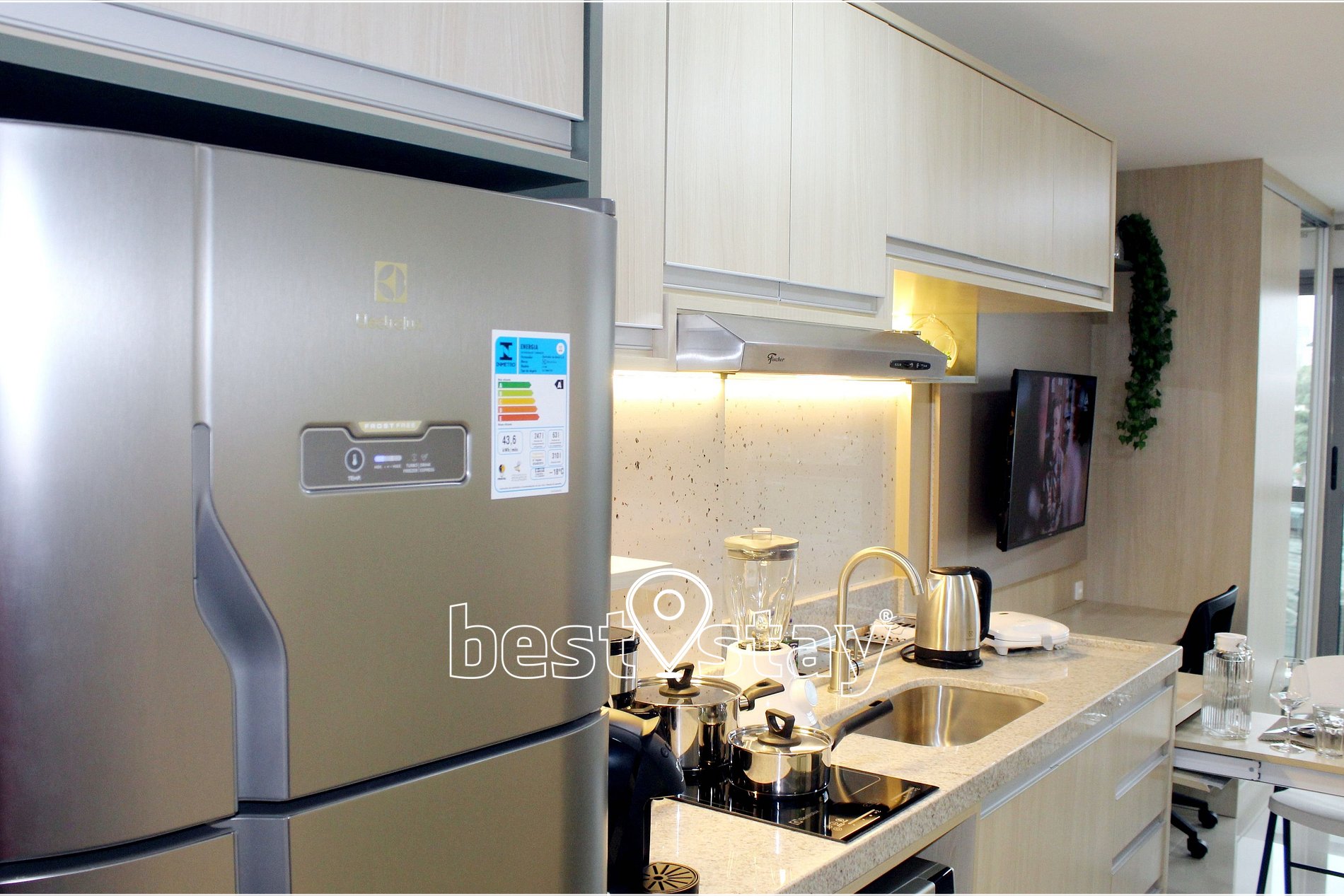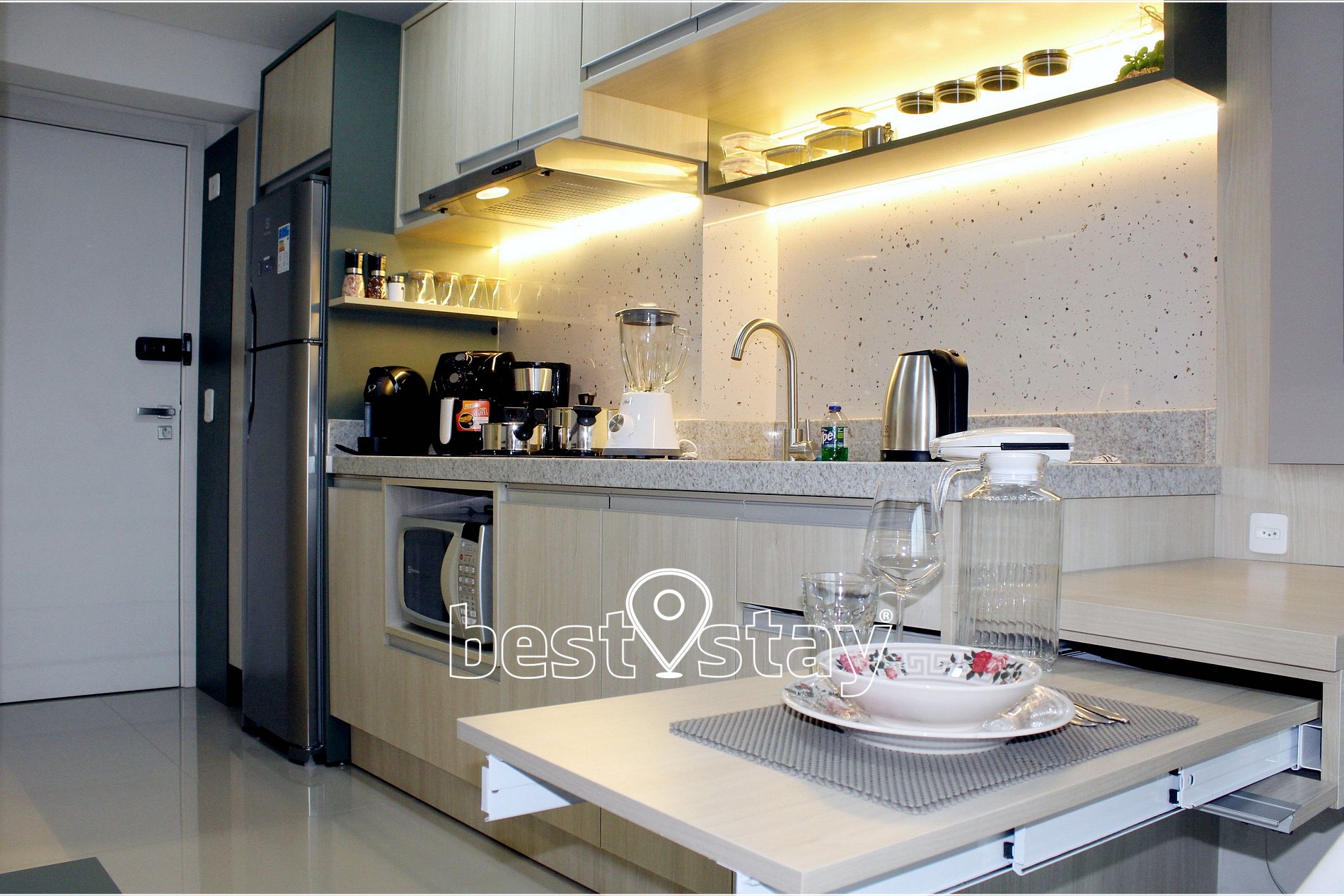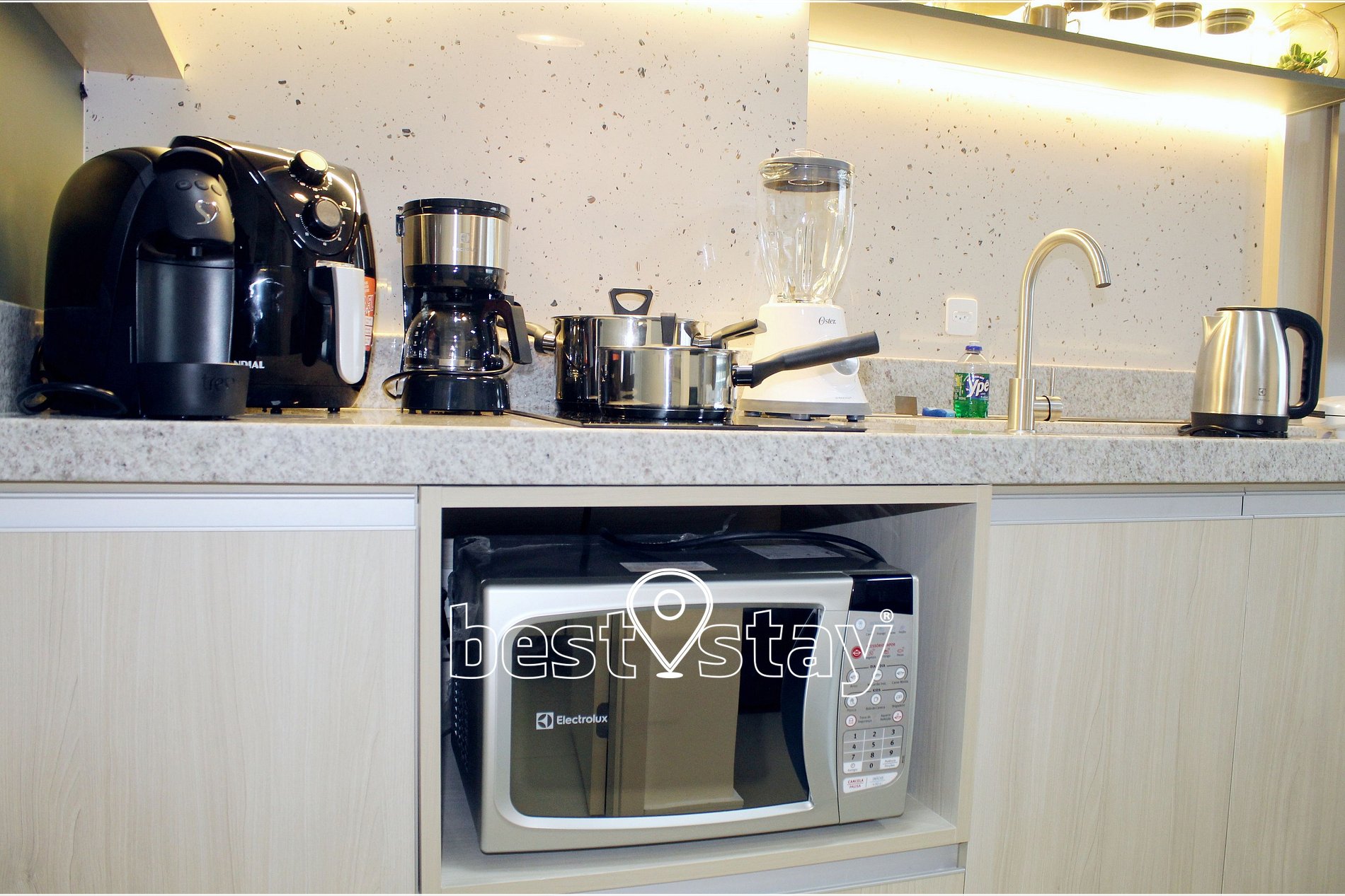 Fogão cooktop de indução 2 bocas, exaustor para controle de fumaça, geladeira duplex com freezer, micro-ondas, cafeteira elétrica tradicional, cafeteira de cápsulas 3 corações, chaleira elétrica, Sanduicheira, Airfryer (fritadeira elétrica), panela de pressão elétrica, liquidificador, panelas de inox, louças, talheres, e todos o itens necessário na cozinha para que você possa preparar sua refeições. Pia com água quente e aquecimento central com ótima pressão.