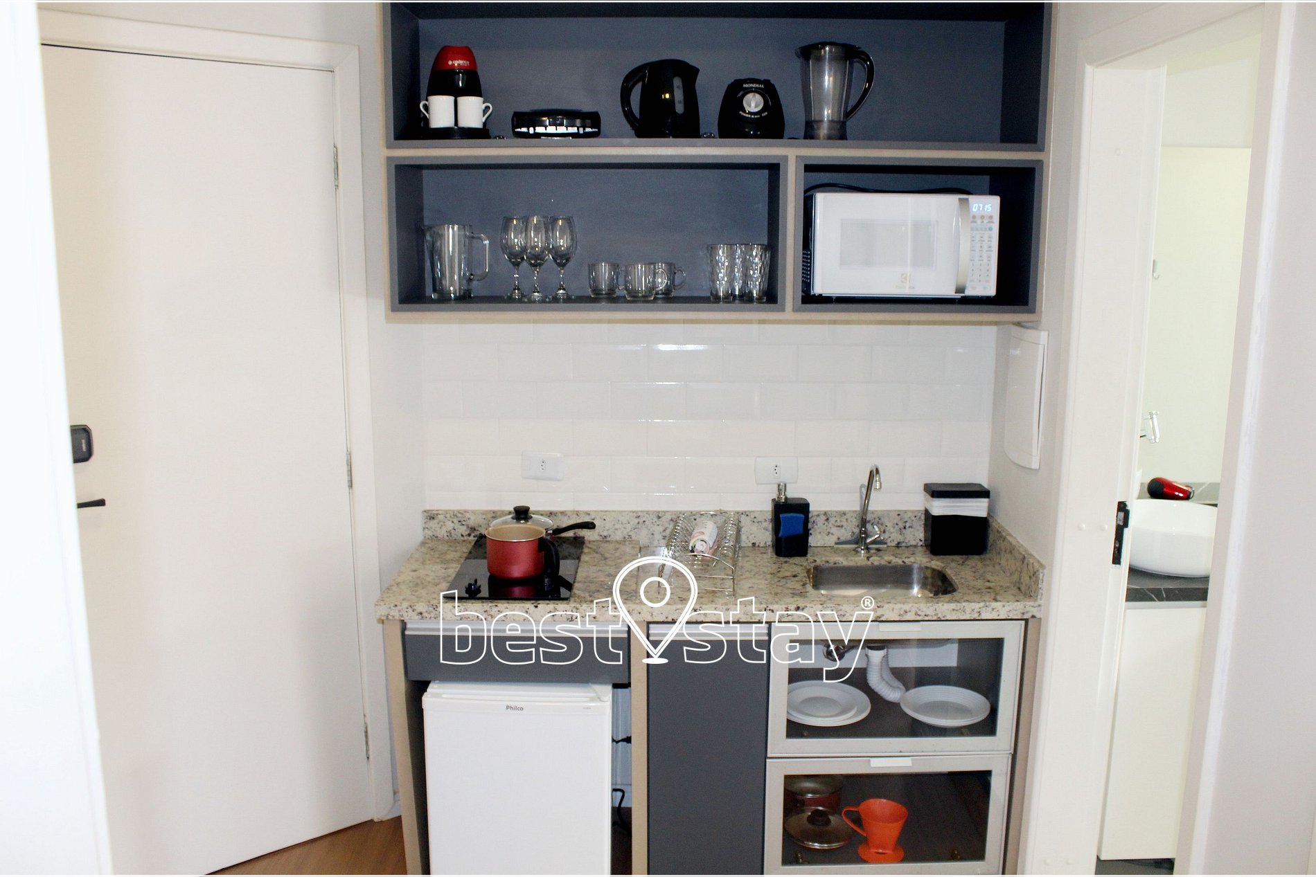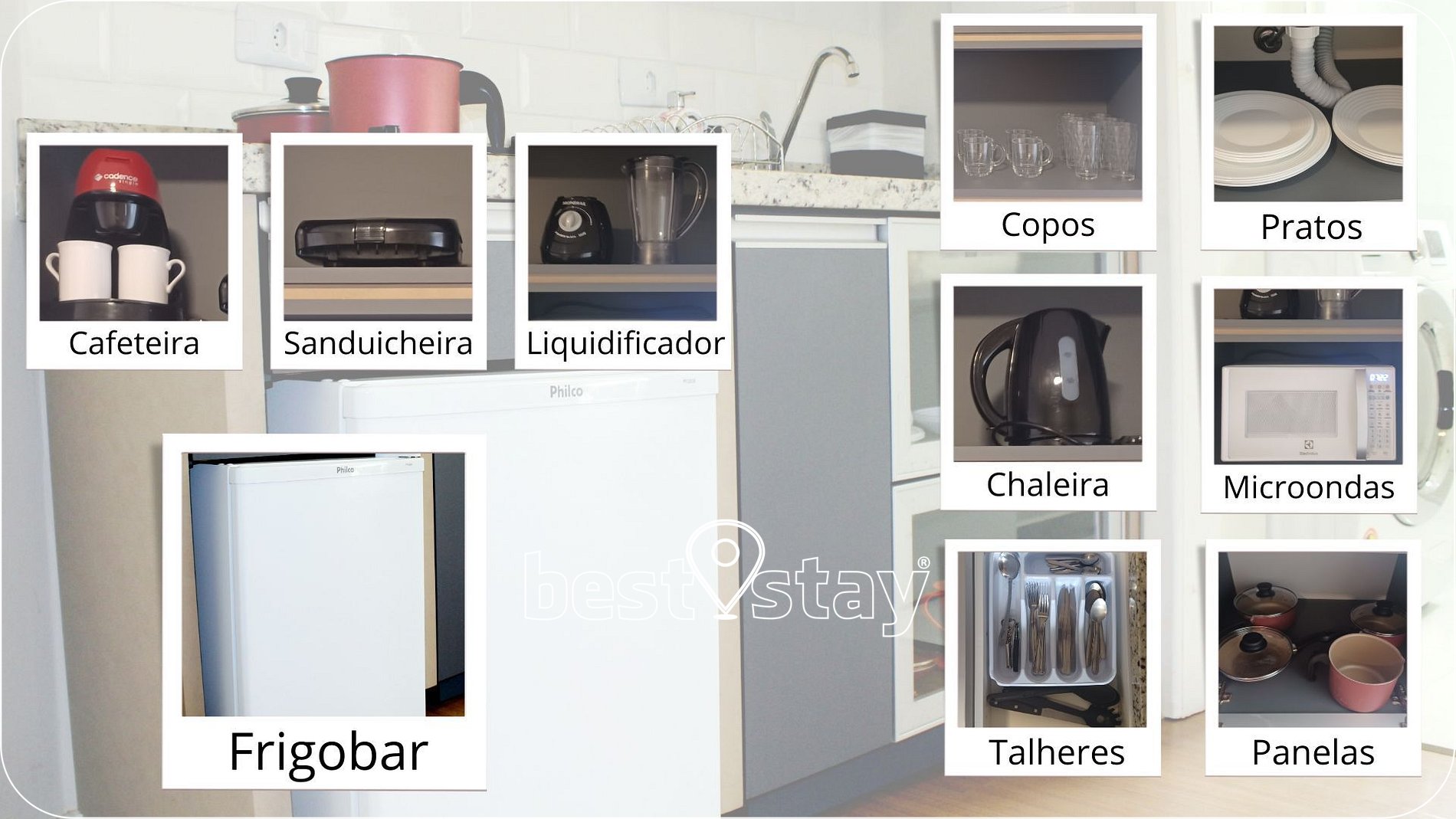 Cooktop elétrico 2 BOCAS, frigobar, micro-ondas, sanduicheira, cafeteira elétrica, liquidificador, chaleira elétrica, panelas, louças e talheres, utensílios, e todos os acessórios necessários para preparar seu café da manhã e demais refeições, bancada para refeições, com 2 cadeiras.