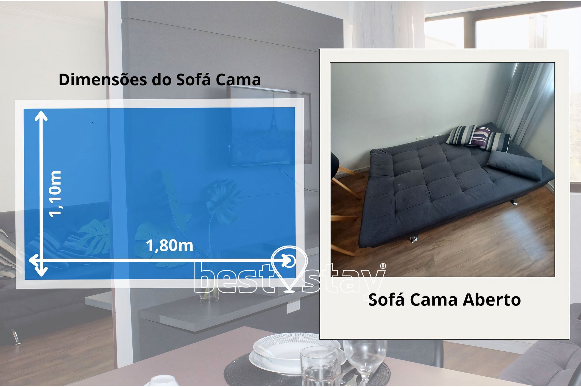 Cooktop indução de balcão (1 boca), panela de pressão elétrica, mesa c/ 4 cadeiras, para refeições, frigobar, micro-ondas, sanduicheira, chaleira elétrica, cafeteira de cápsulas 3 Corações, liquidificador, panelas, taças, louças e talheres, utensílios, detergente, esponja de louça e todos os acessórios necessários para preparar seu café da manhã e demais refeições, TV Smart 48", Sofá-cama.