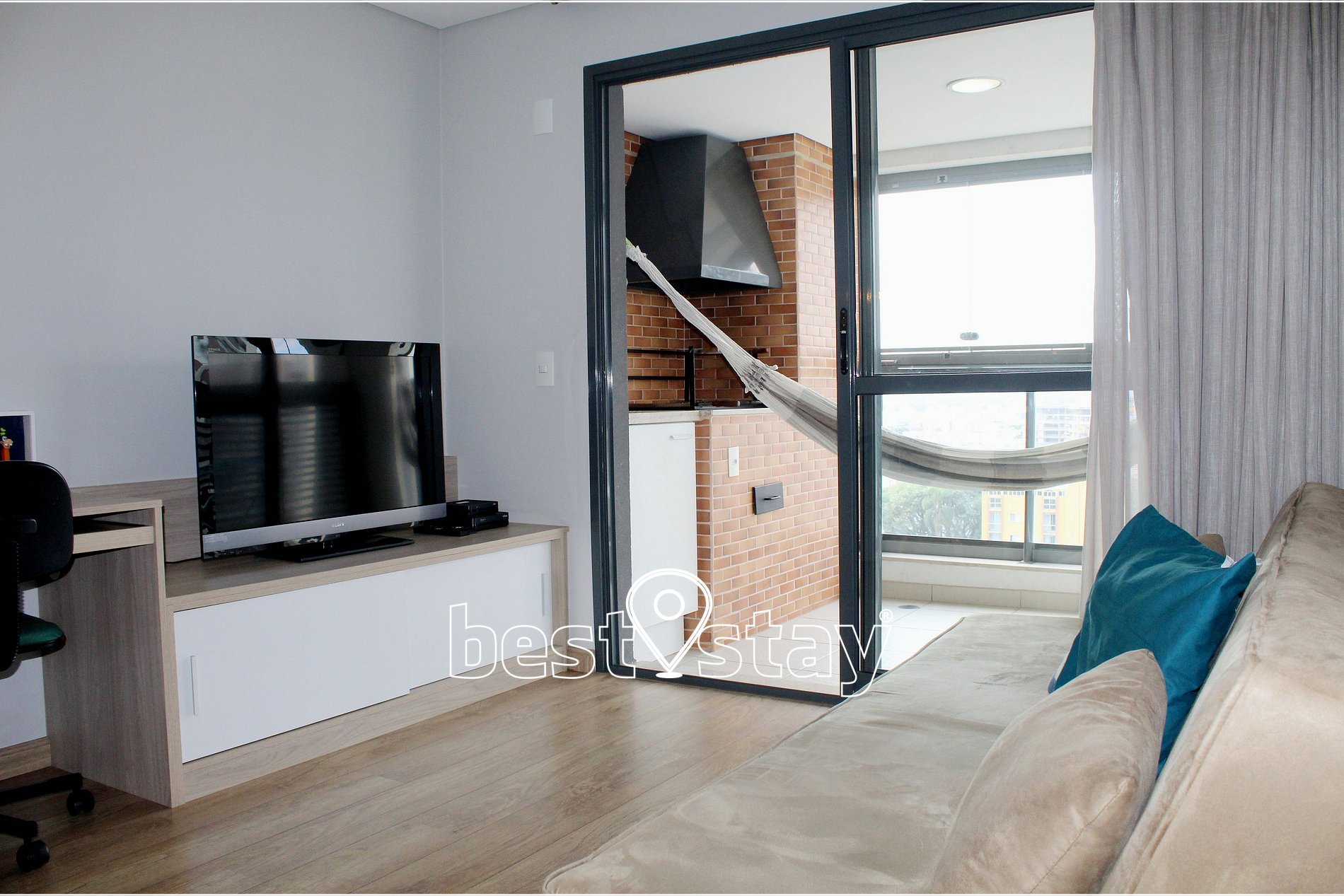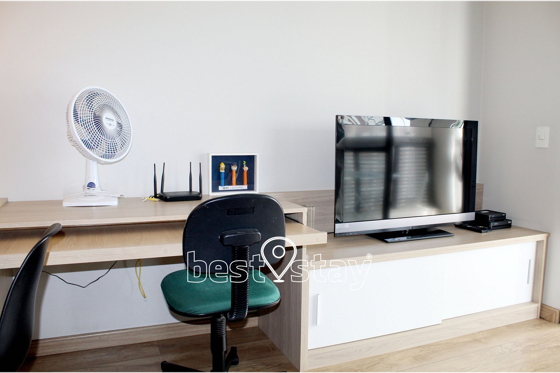 TV, sofá, estação de trabalho e porta balcão para a varanda com churrasqueira. Tudo meticulosamente decorado e com muito conforto.