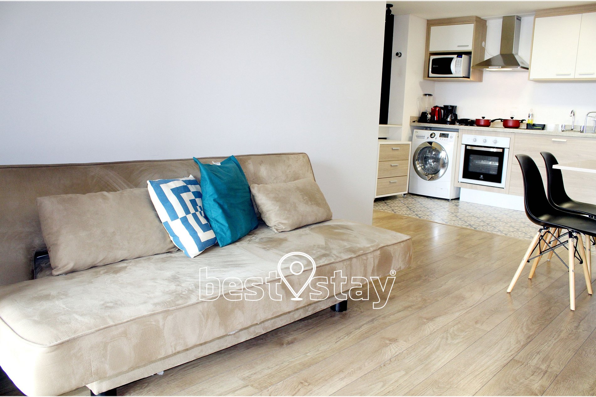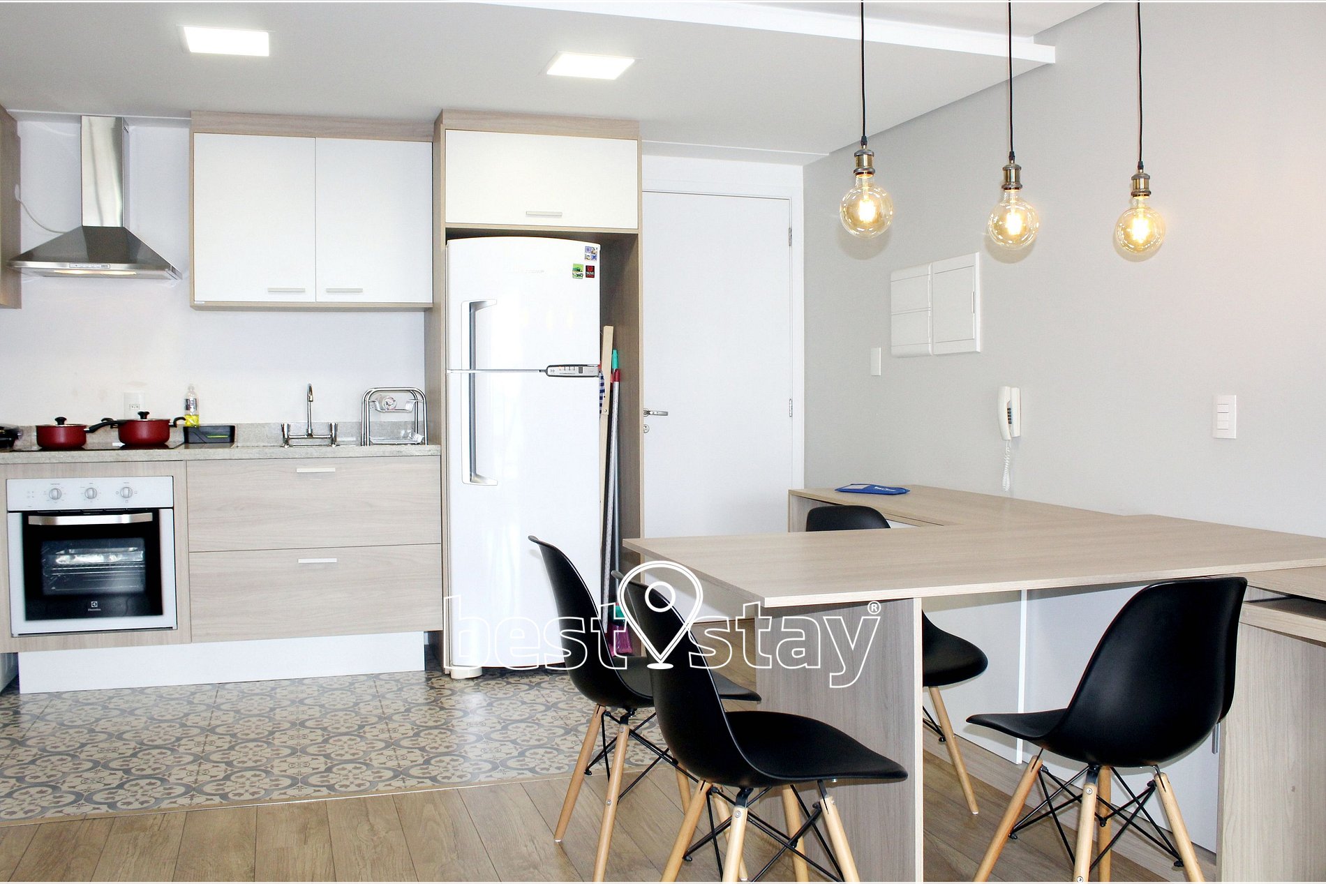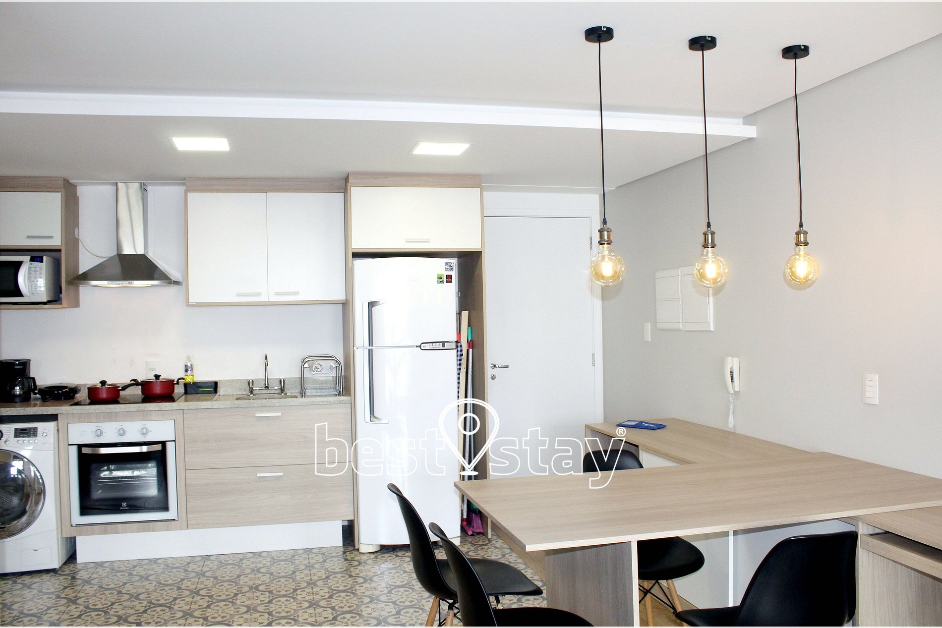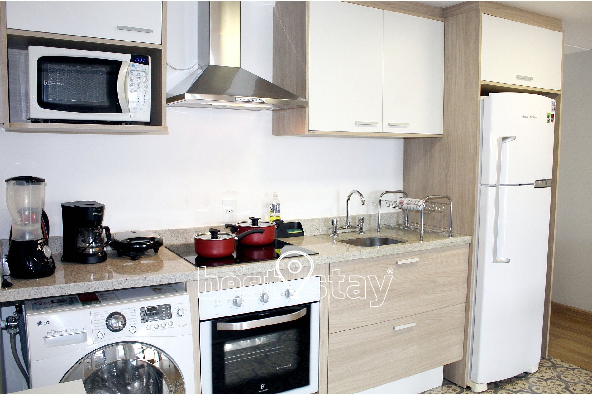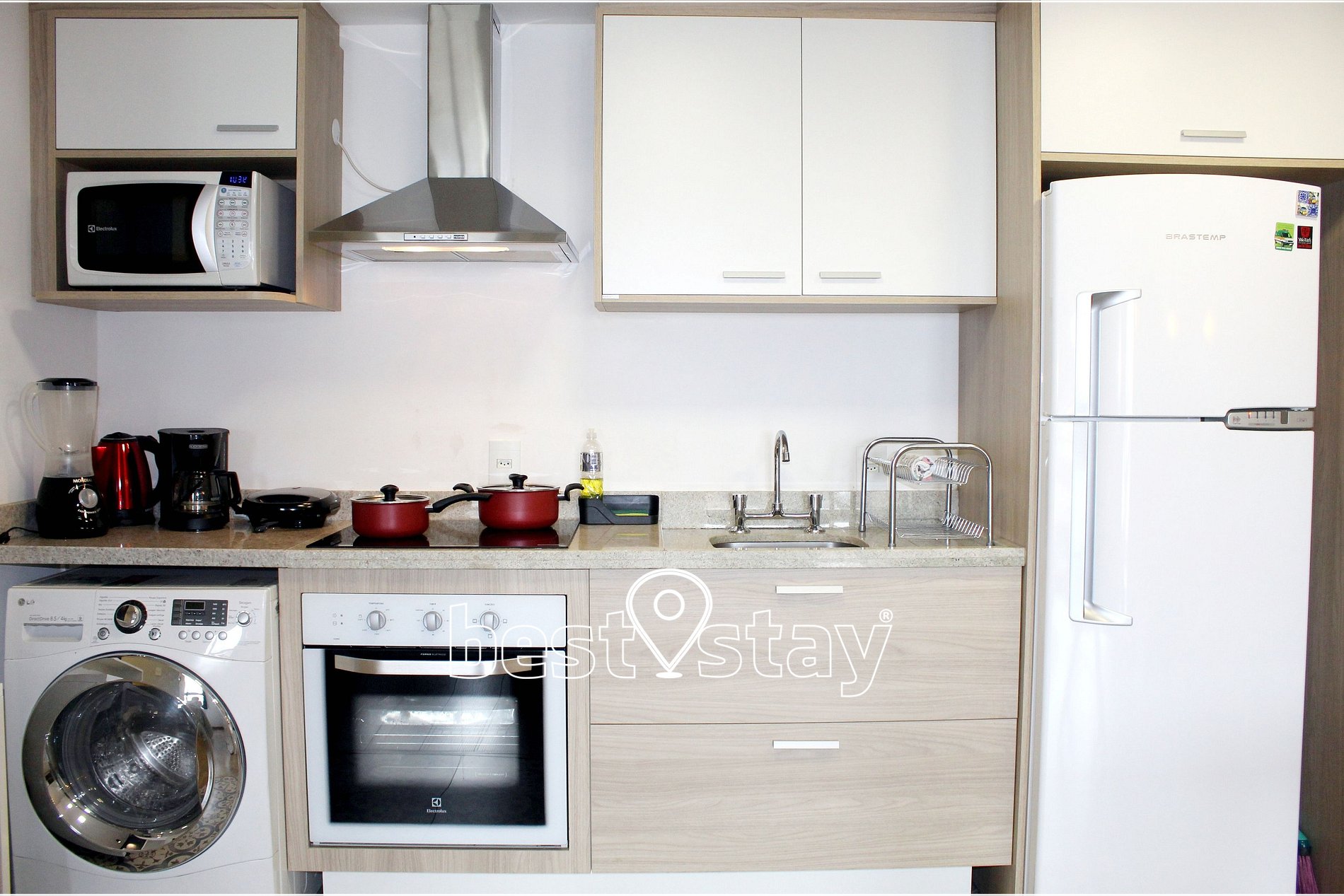 Tipo americana, mesa com 4 cadeiras para refeições, fogão Cooktop 4 bocas, forno elétrico, geladeira, micro-ondas, cafeteira elétrica, sanduicheira, chaleira elétrica, panelas, louças e talheres. Lavadora/secadora de roupas. Água quente com aquecimento central e ótima pressão.