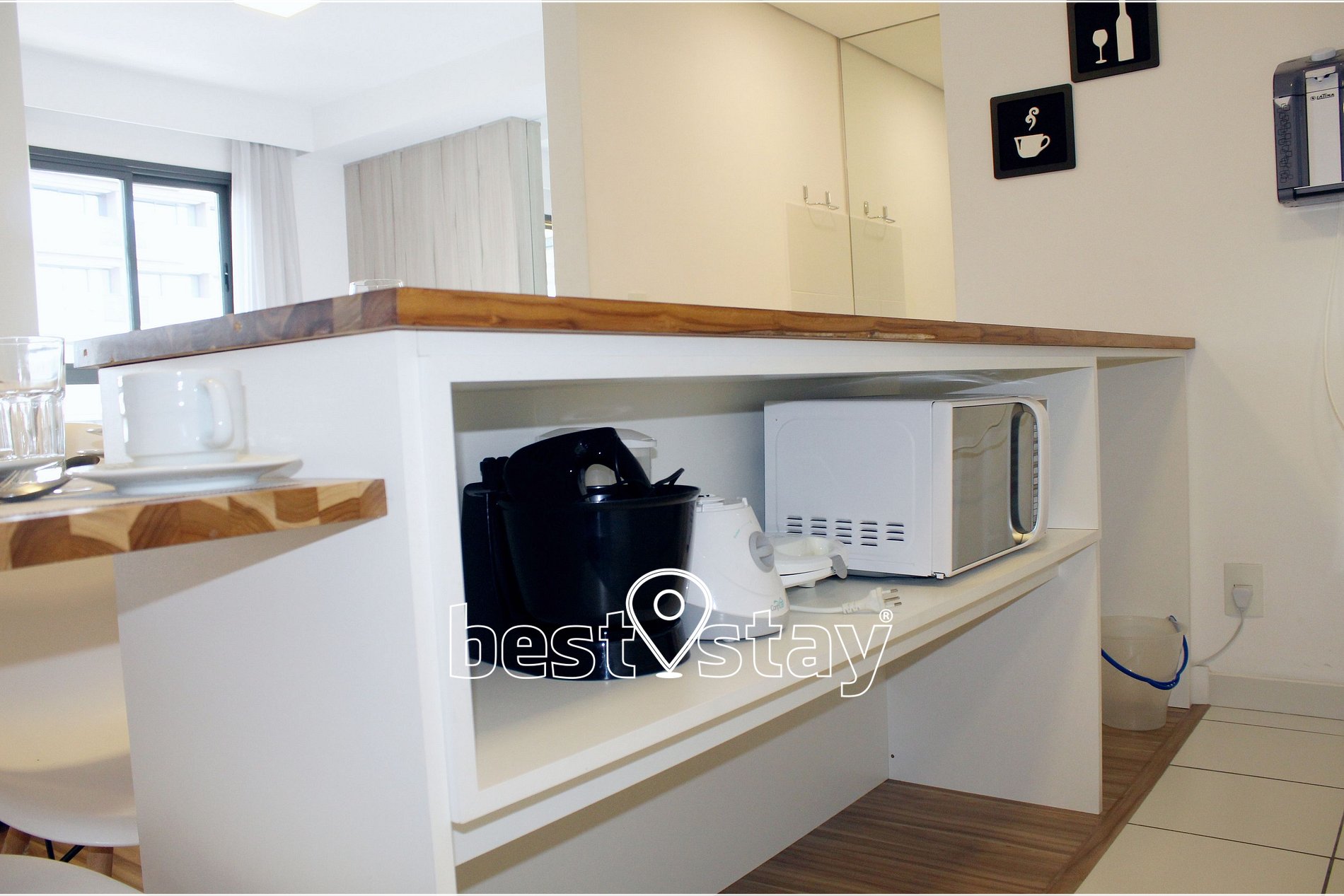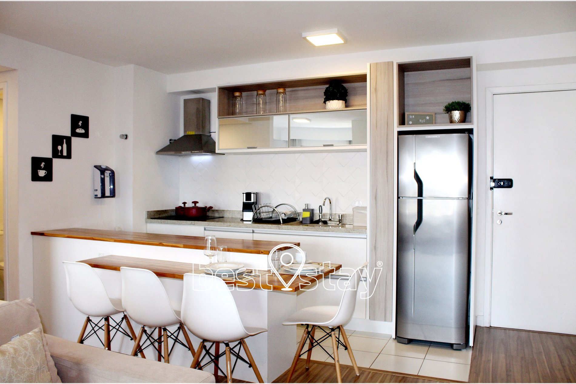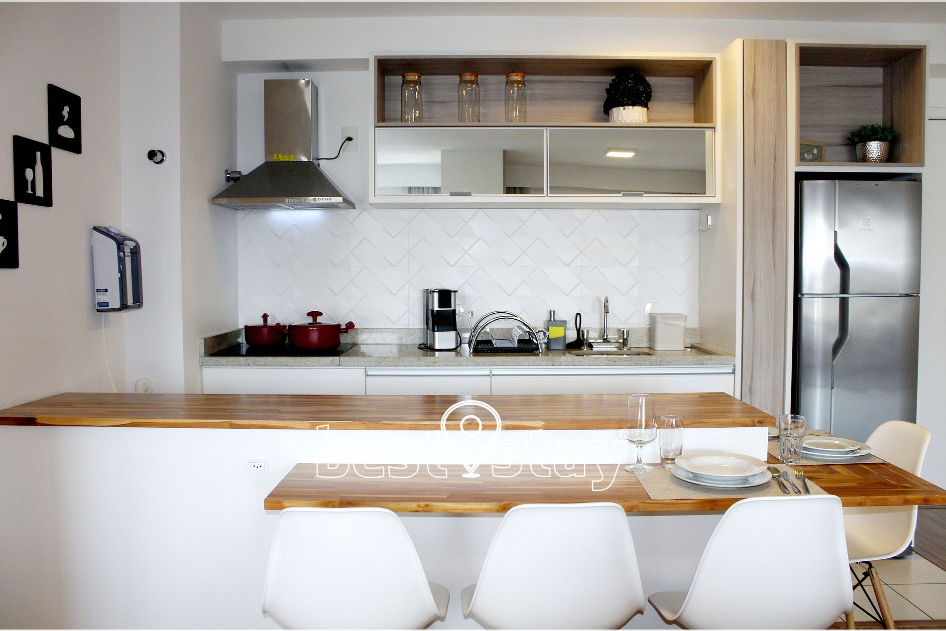 Tipo americana, balcão e 4 cadeiras para refeições, fogão Cooktop elétrico de 4 bocas, forno elétrico, geladeira, micro-ondas, cafeteira elétrica tradicional, cafeteria de cápsulas, mixer, liquidificador, sanduicheira, panelas, louças e talheres. Água quente com aquecimento central com ótima pressão e filtro purificador filtro de água, ferro de passar, blackout nas cortinas.