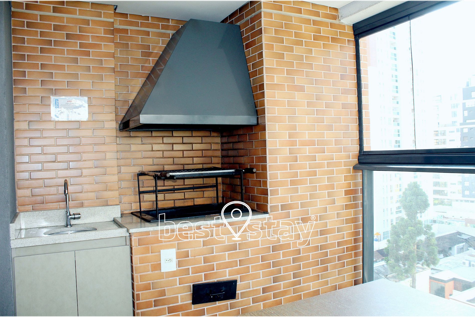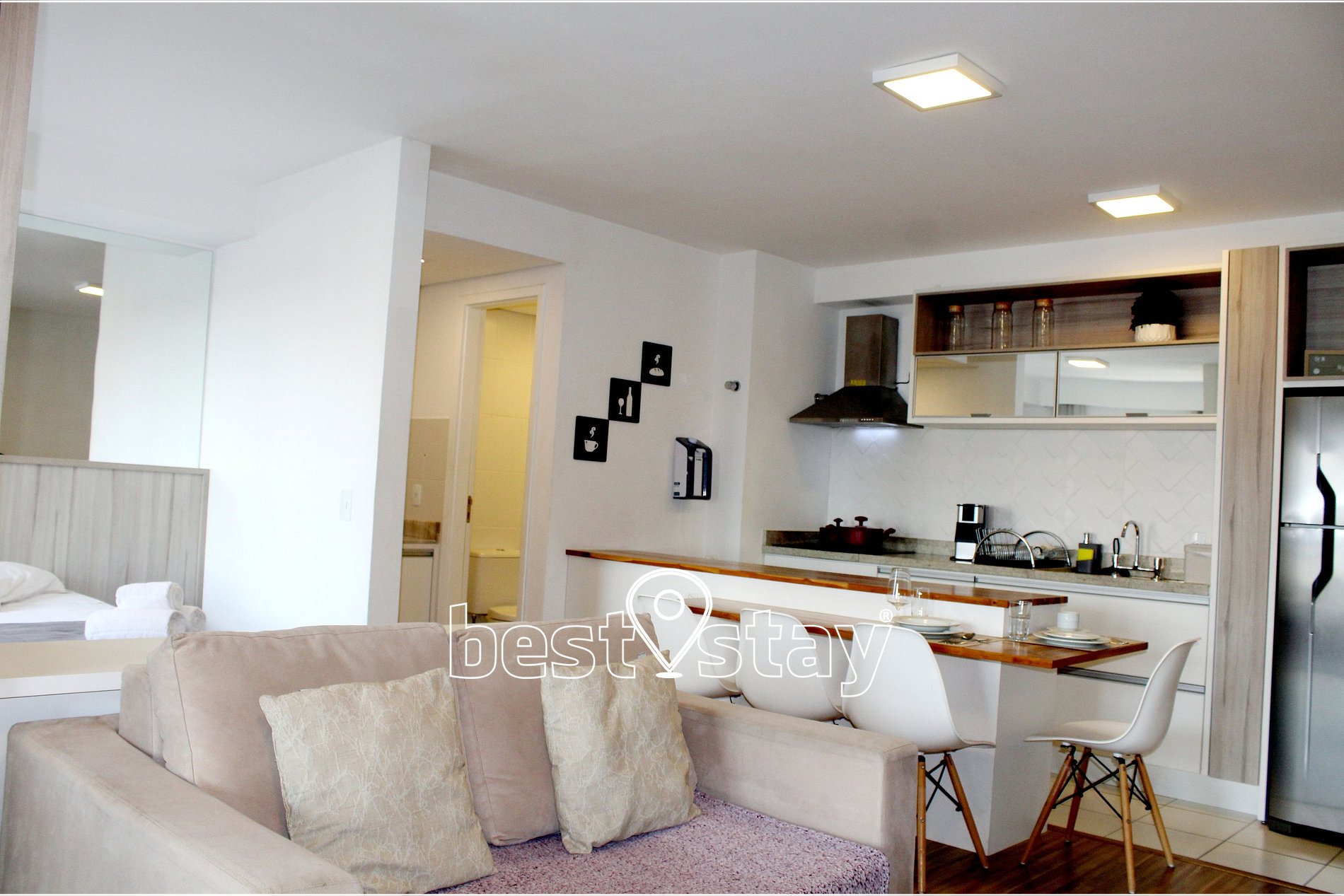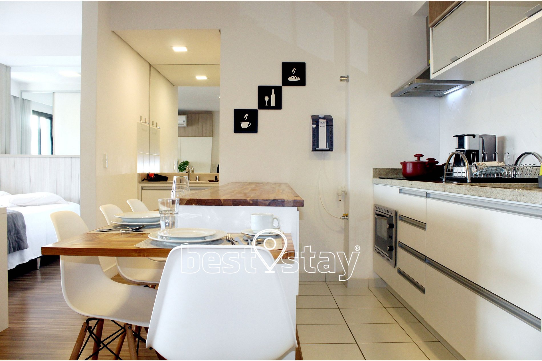 Tipo americana, balcão e 4 cadeiras para refeições, fogão Cooktop elétrico de 4 bocas, forno elétrico, geladeira, micro-ondas, cafeteira elétrica tradicional, cafeteria de cápsulas, mixer, liquidificador, sanduicheira, panelas, louças e talheres. Água quente com aquecimento central com ótima pressão e filtro purificador filtro de água, ferro de passar, blackout nas cortinas.