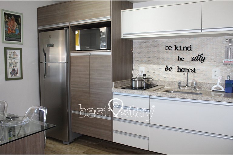 Apartamento concebido com design moderno e 100% equipado. Ideal para famílias, possui cozinha completa e equipada, redes de proteção nas Janelas e sacada, garagem privativa e numerada, garantindo sua segurança e comodidade.