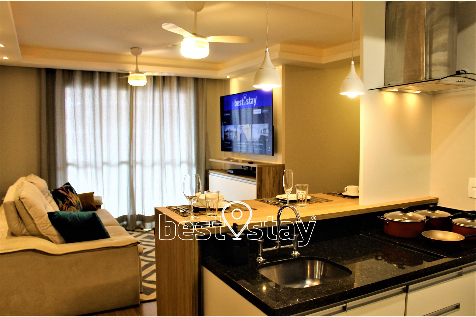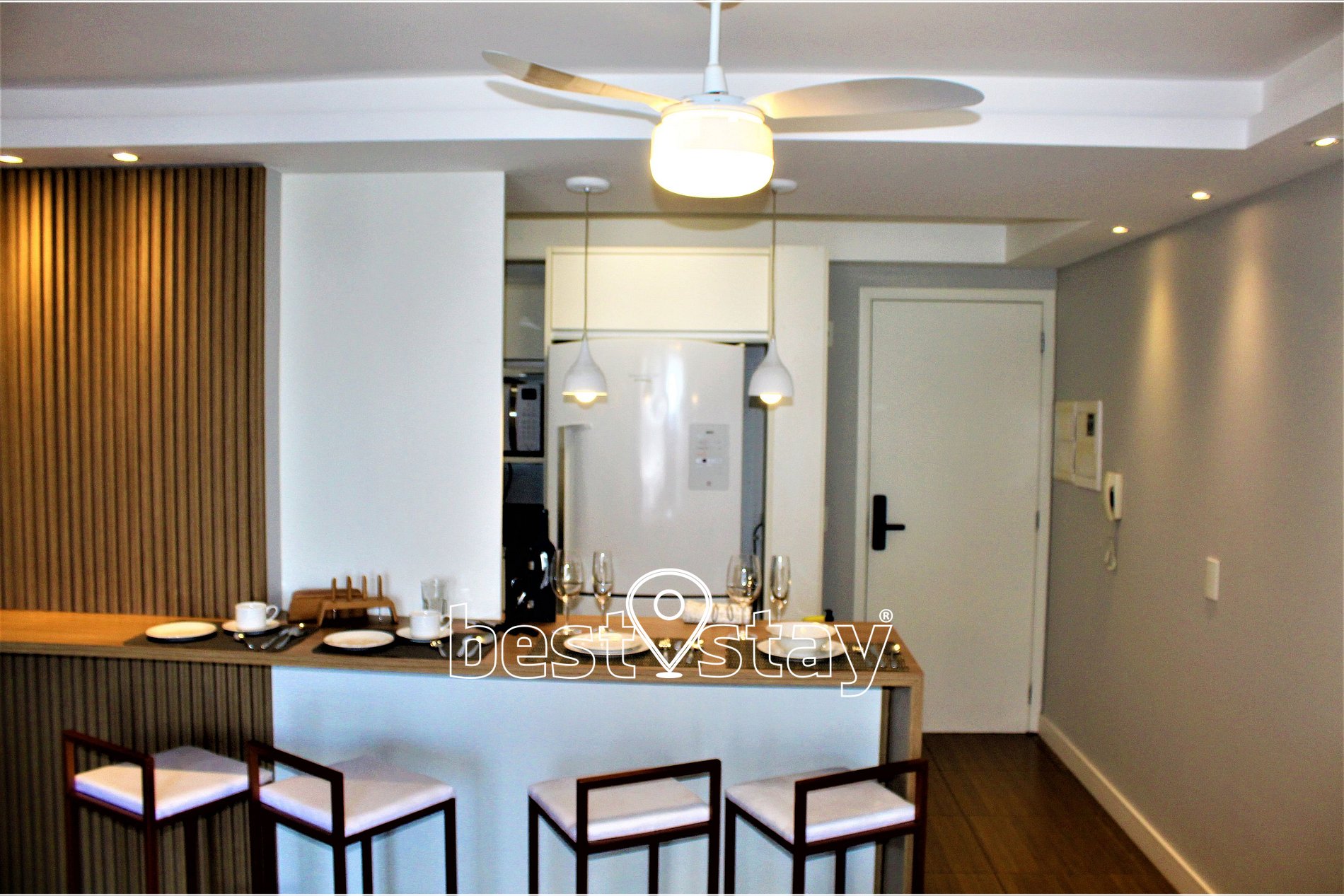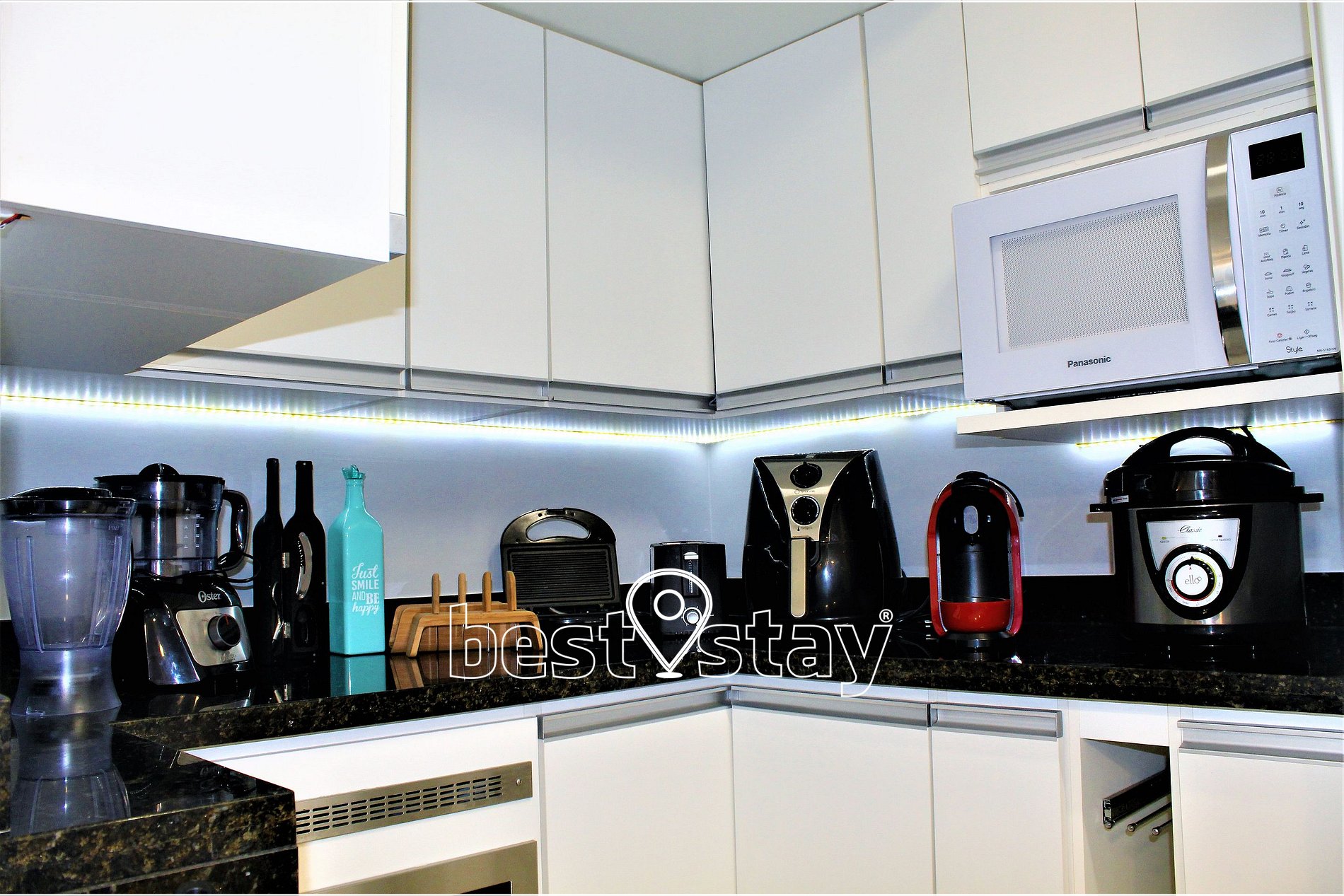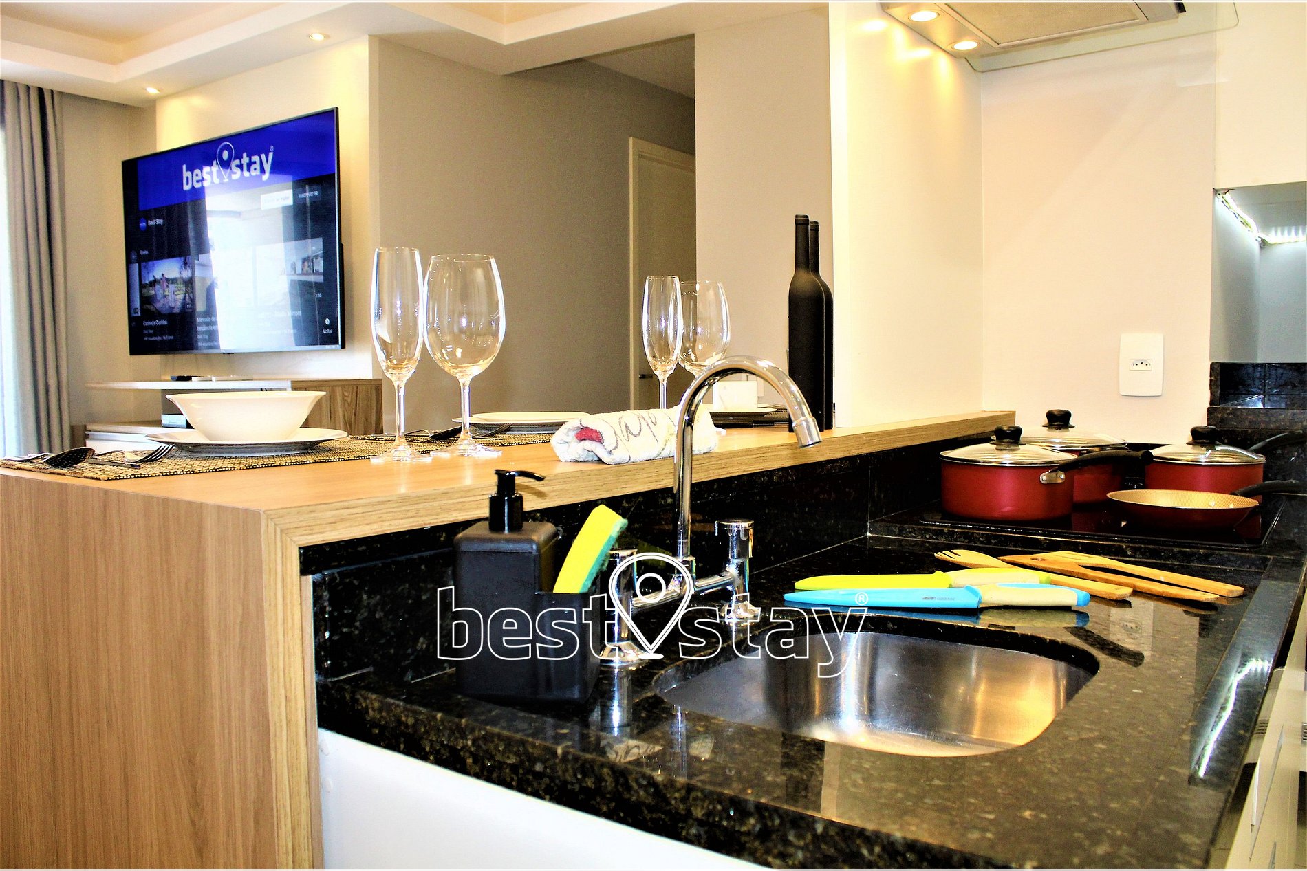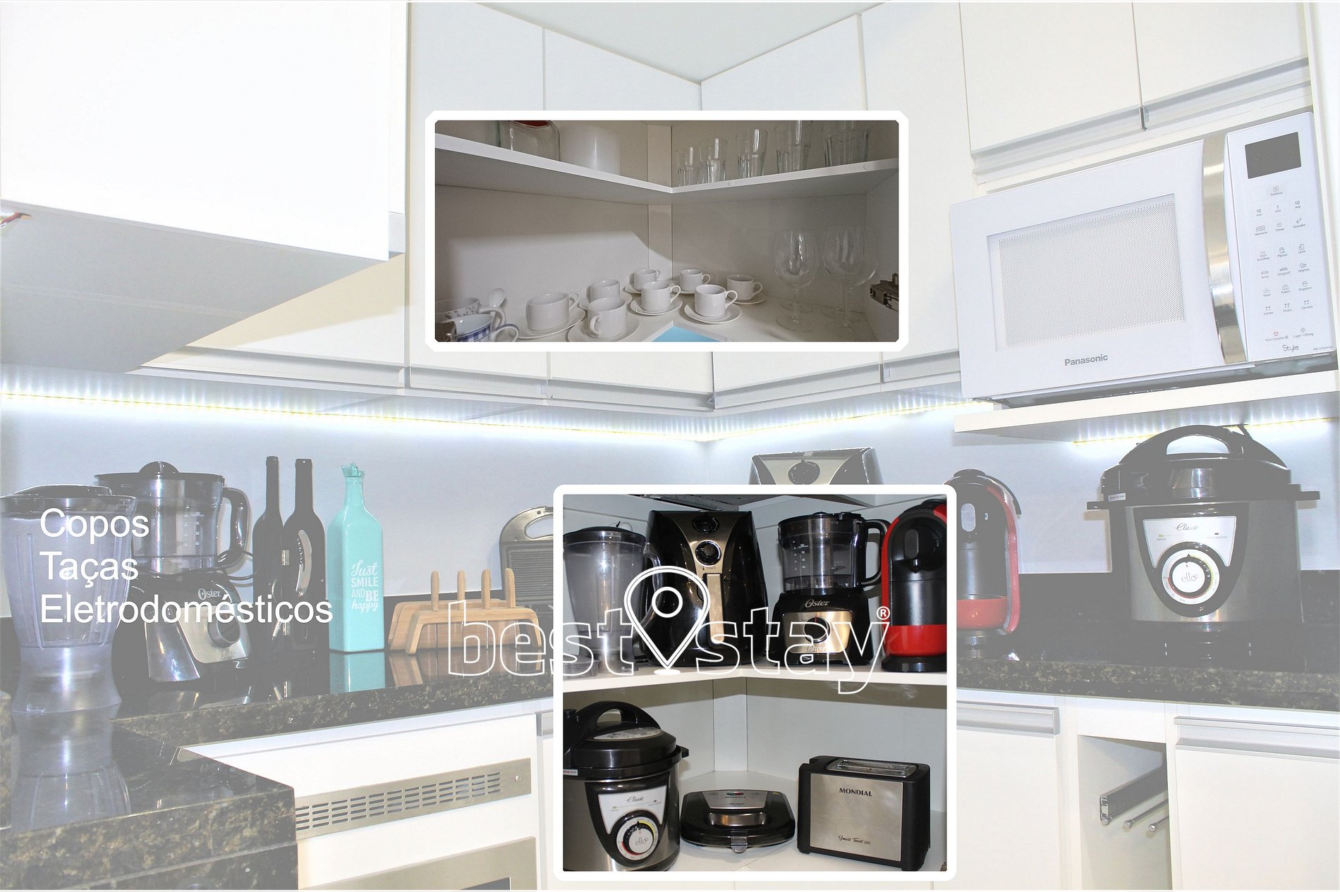 Tipo americana, balcão com banquetas para refeições, fogão Cooktop 4 bocas, forno embutido, geladeira, micro-ondas, cafeteira 3 Corações de cápsulas, cafeteira elétrica tradicional, liquidificador, espremedor de frutas, panelas, Airfryer, panela de pressão elétrica, Sanduicheira, torradeira, louças e talheres. Água quente com aquecimento central e ótima pressão.