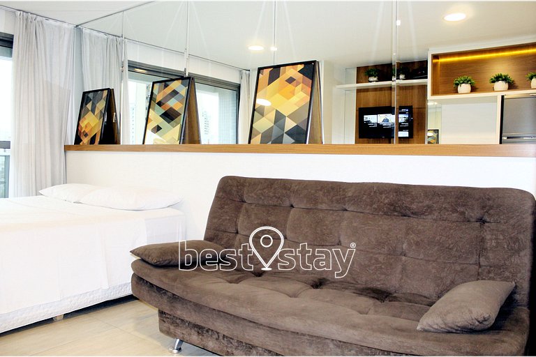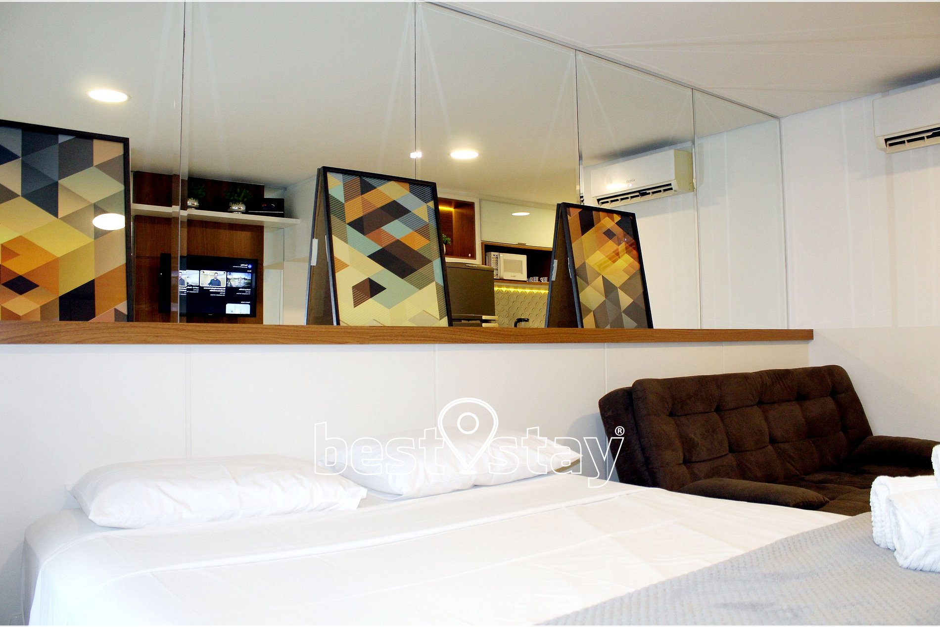 Ar condicionado (quente/frio), SmarTv, Cama Queen, criado mudo, sofá-cama, guarda roupa, cabides, ferro e tábua de passar roupas, área de trabalho/estudos, bancada para refeições, porta balcão para varanda e cortinas com blackout.