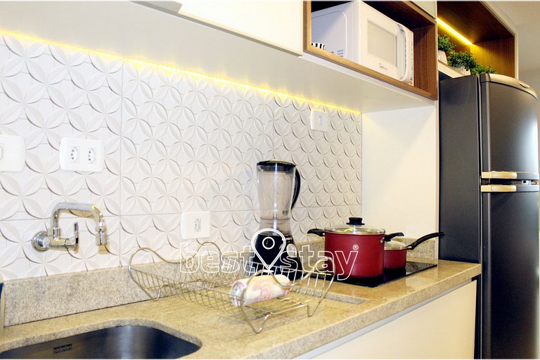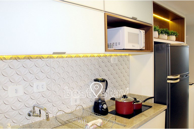 Fogão cooktop elétrico de 2 bocas, Microondas, geladeira duplex com freezer, micro-ondas, cafeteira cápsulas Nespresso, chaleira elétrica, Sanduicheira, liquidificador, espremedor de frutas., panelas, copos, taças, louças, talheres, e todos o itens necessário na cozinha para que você possa preparar sua refeições. Pia com água quente e aquecimento central com ótima pressão.