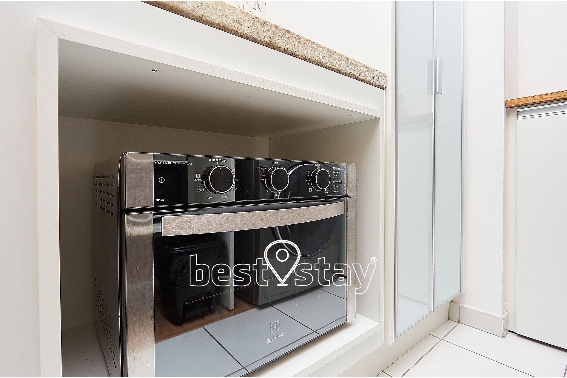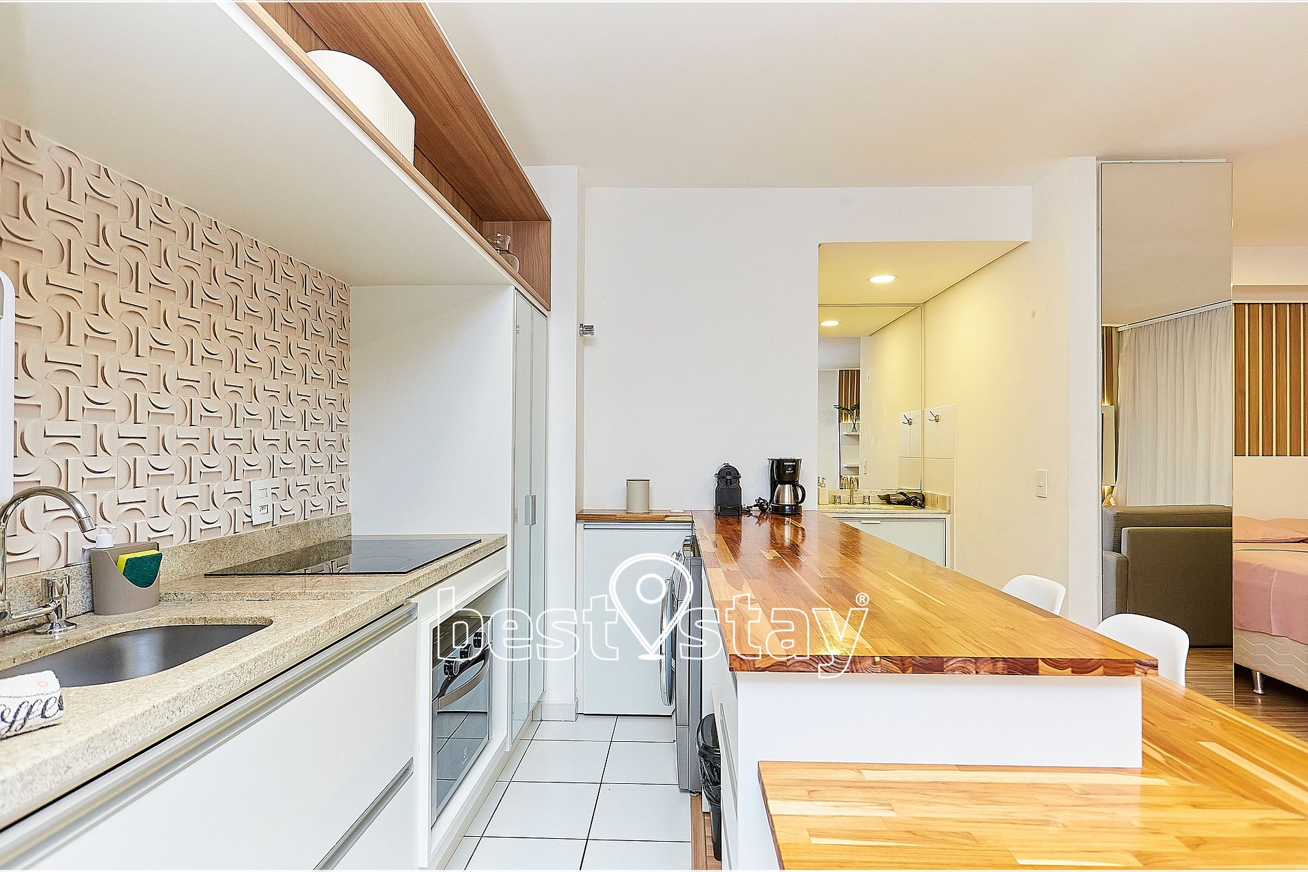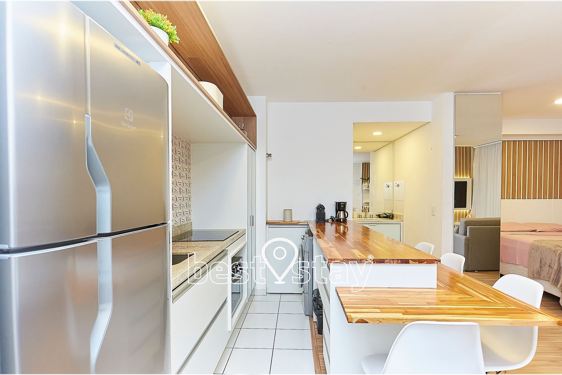 Tipo americana, balcão e 4 cadeiras para refeições, fogão Cooktop elétrico de 4 bocas, forno elétrico, geladeira, micro-ondas, cafeteira elétrica tradicional, cafeteria de cápsula nespresso liquidificador, sanduicheira, panelas, louças e talheres. Água quente com aquecimento central e ótima pressão e purificador filtro de água (inclusive gelada), ferro de passar, blackout nas cortinas.