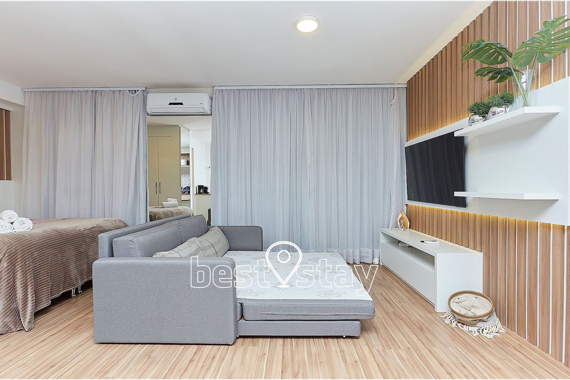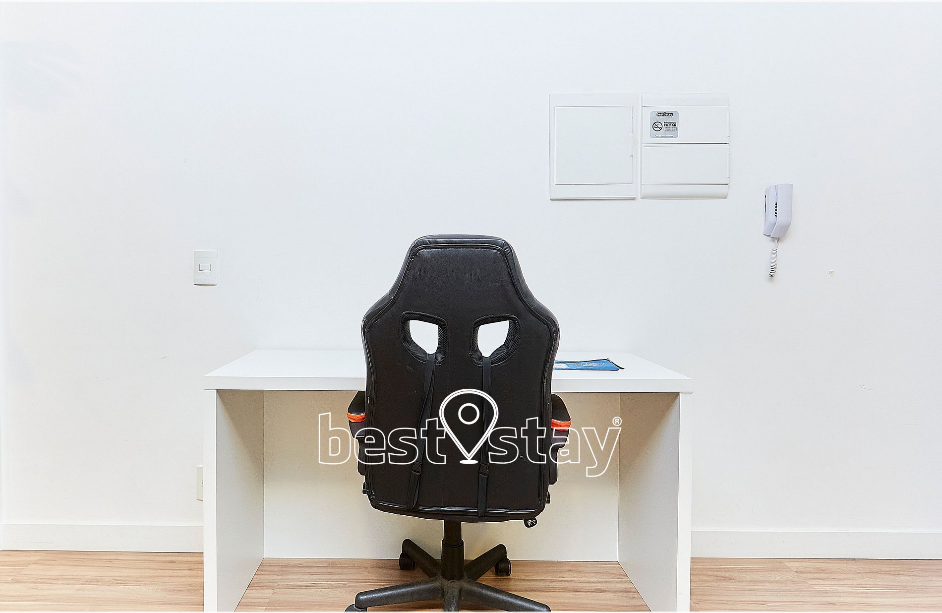 Cama de casal, 1 colchão extra de solteiro, guarda roupas, cabides, cobertores e travesseiros.TV Smart 55 polegadas, ar-condicionado quente e frio, sofá-cama (NOVO) e super confortável, mesa de trabalho com cadeira confortável. Tudo meticulosamente decorado, com muito conforto e blackout nas cortinas.