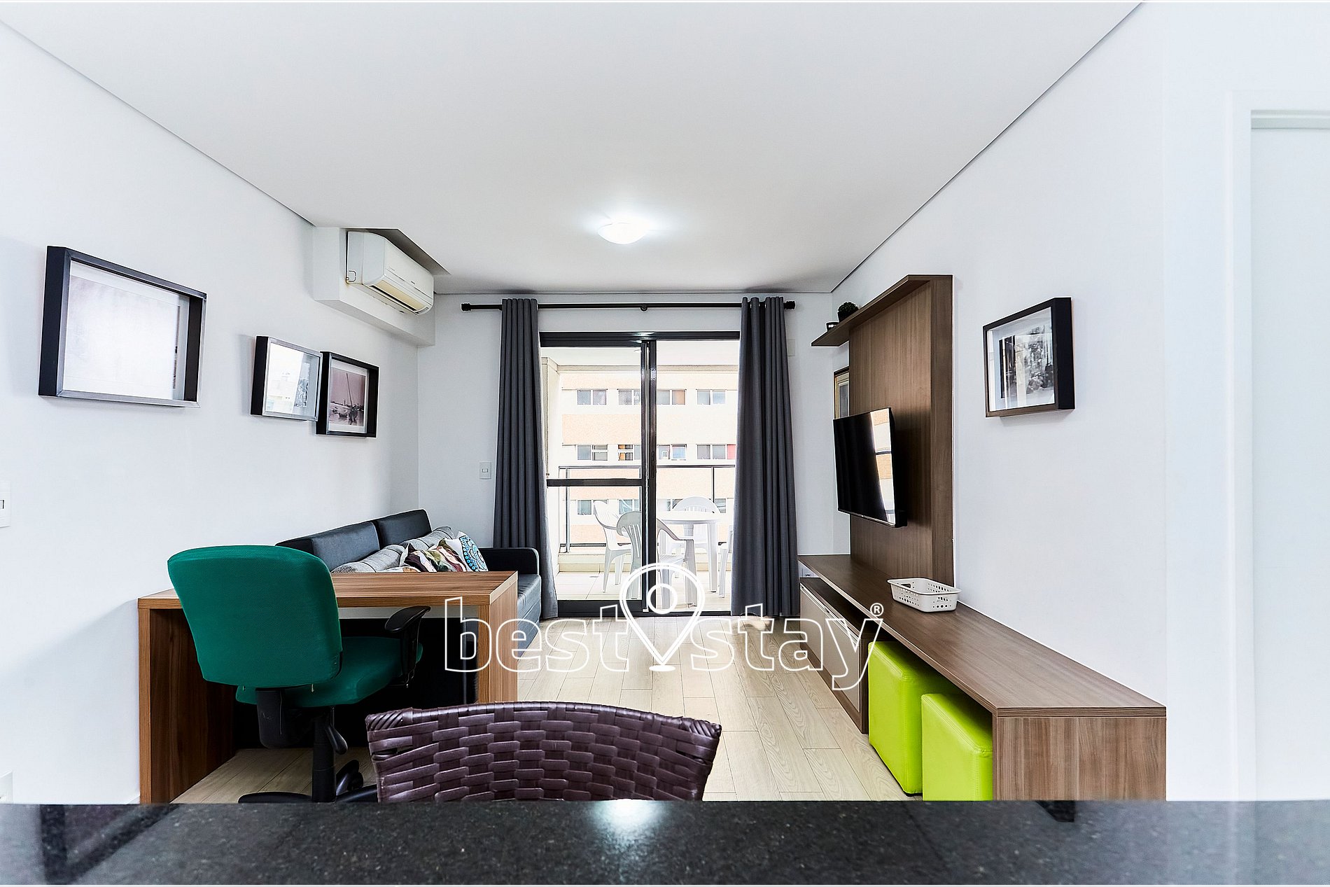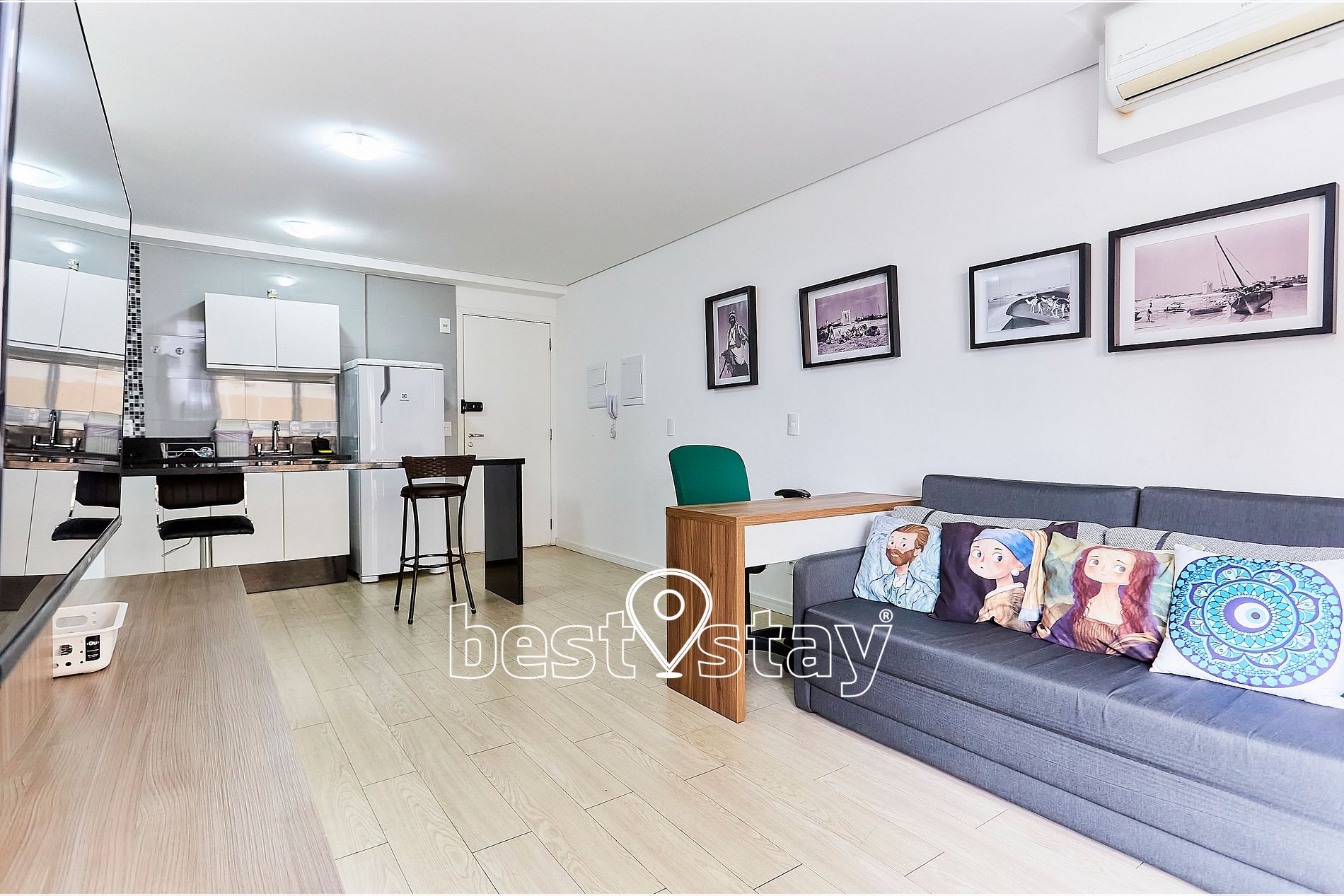 SmarTv 48 polegadas, sofá-cama para 1 pessoa, ar condicionado, estação de trabalho com mesa e cadeira Tudo meticulosamente decorado, com muito conforto e blackout nas cortinas.