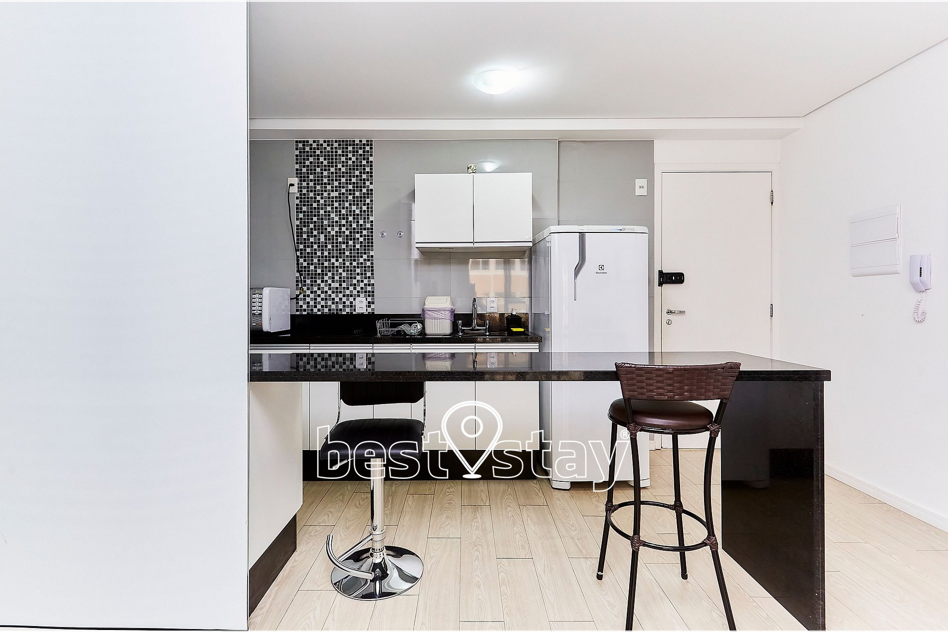 Tipo americana, bancada com 2 banquetas para refeições, fogão Cooktop elétrico de 4 bocas, geladeira, micro-ondas, cafeteira elétrica tradicional, liquidificador, sanduicheira, panelas, utensílios de cozinha, louças e talheres. Água quente com aquecimento central e ótima pressão.