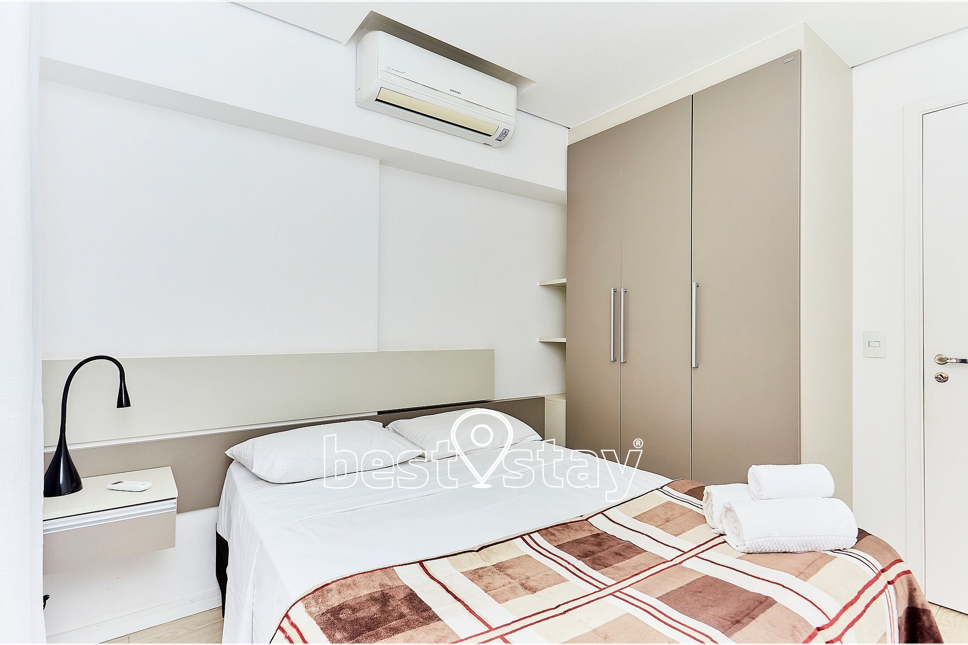 Cama de casal, cortina BLACKOUT 100%, guarda roupas, cabides, ferro de passar, cobertores e travesseiros e ar condicionado.