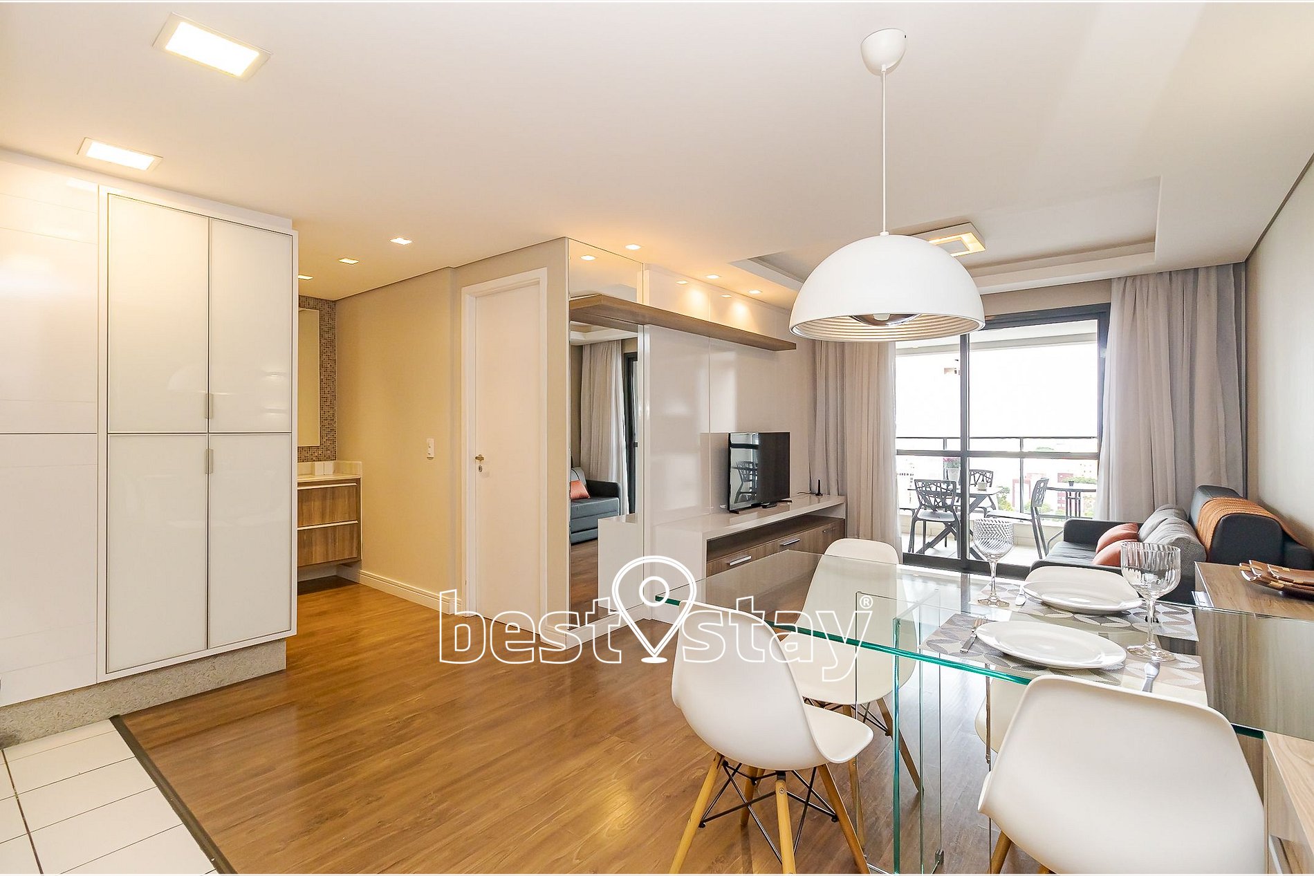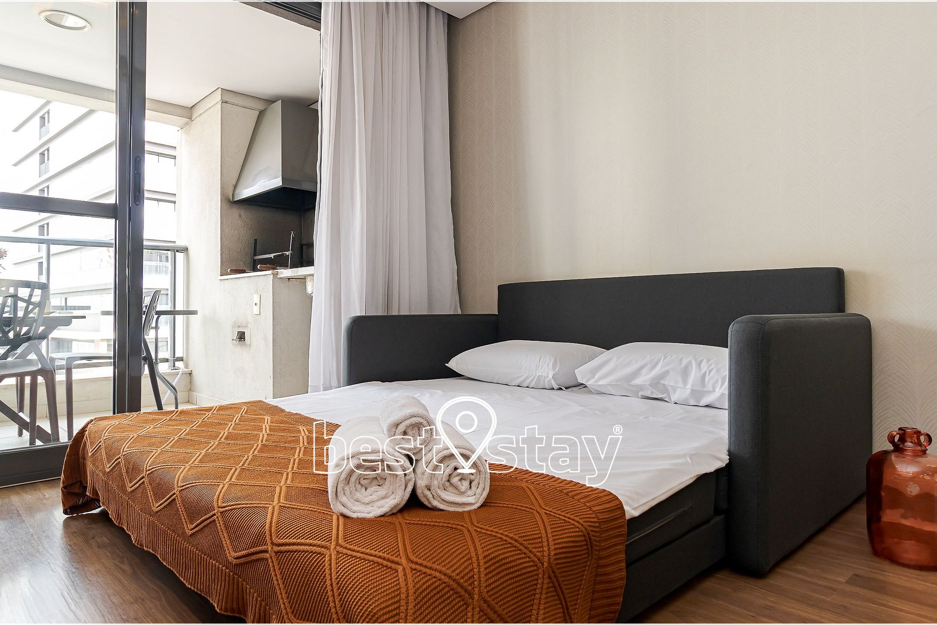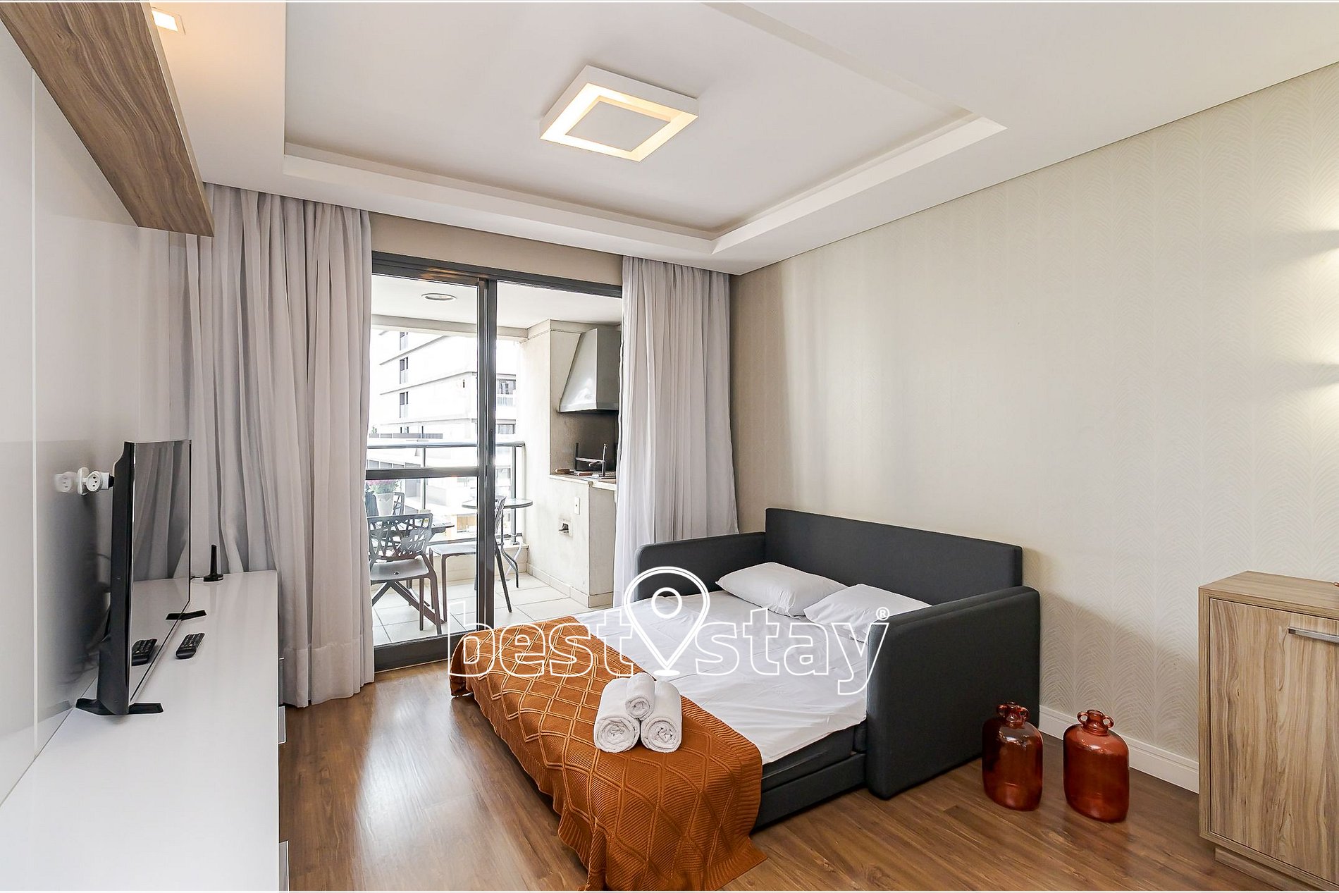 Mesa de jantar com 4 cadeiras, TV Smart, sofá-cama (NOVO) super confortável (acomoda 2 pessoas para dormir), porta balcão para a varanda, cortina com blackout. Tudo meticulosamente decorado e com muito conforto.