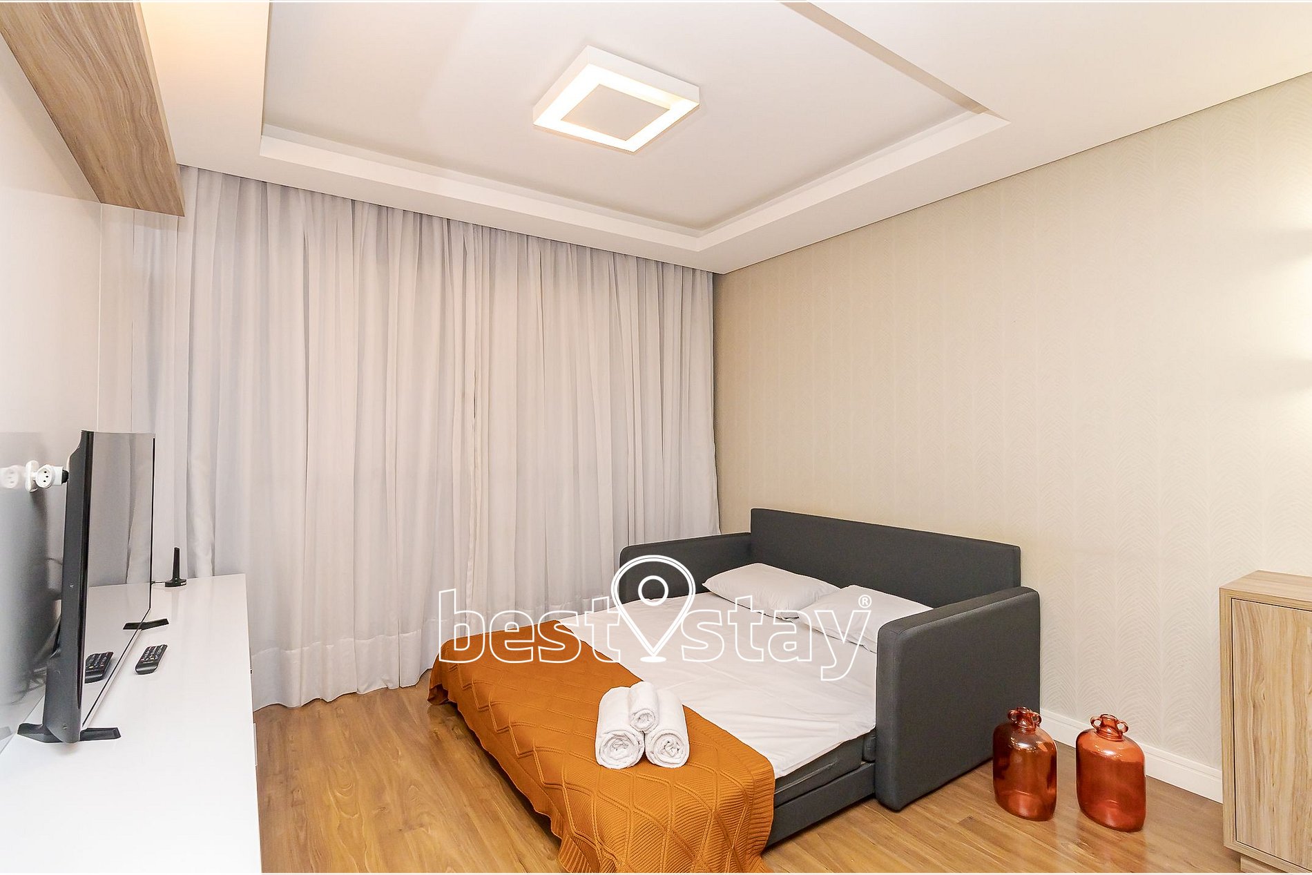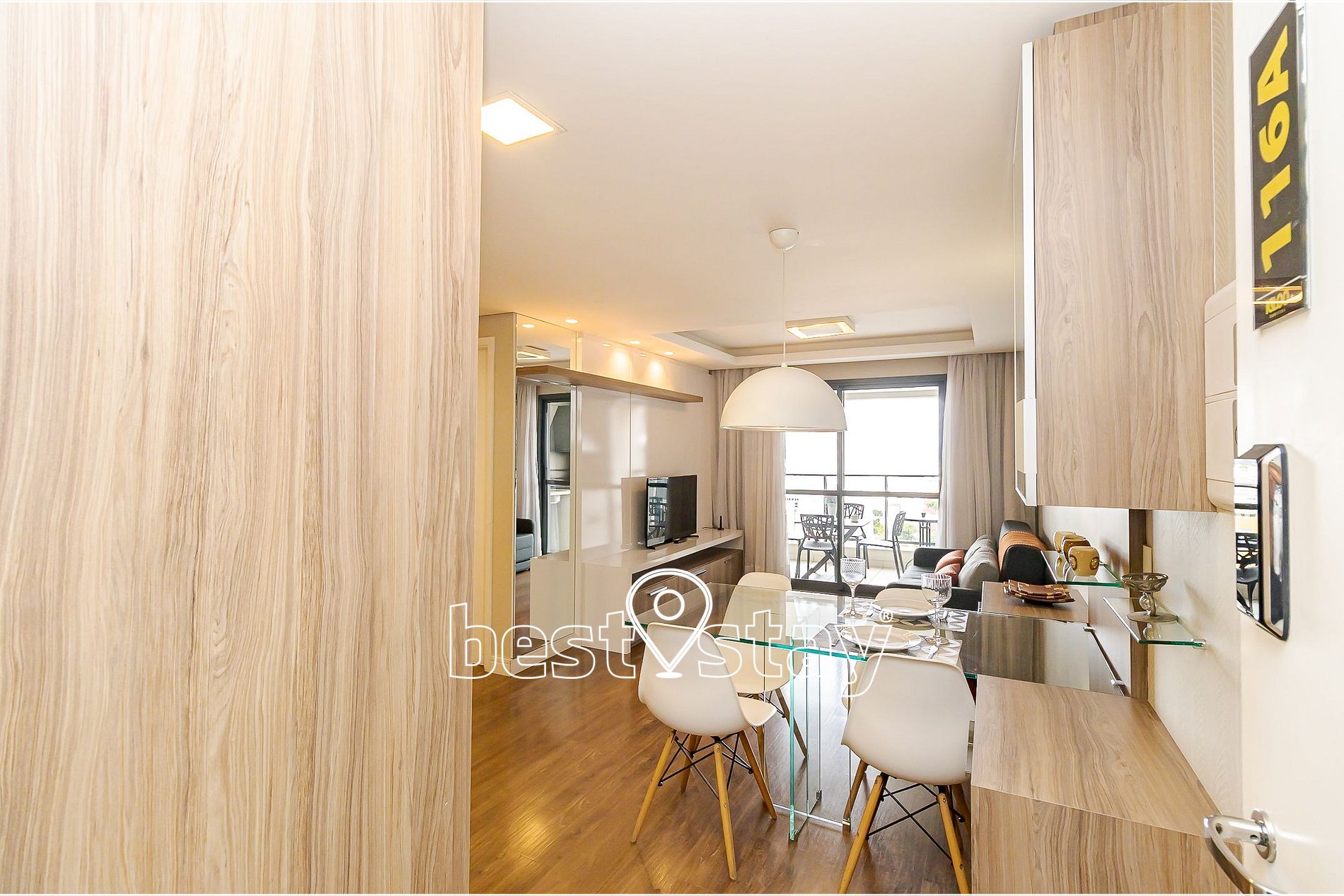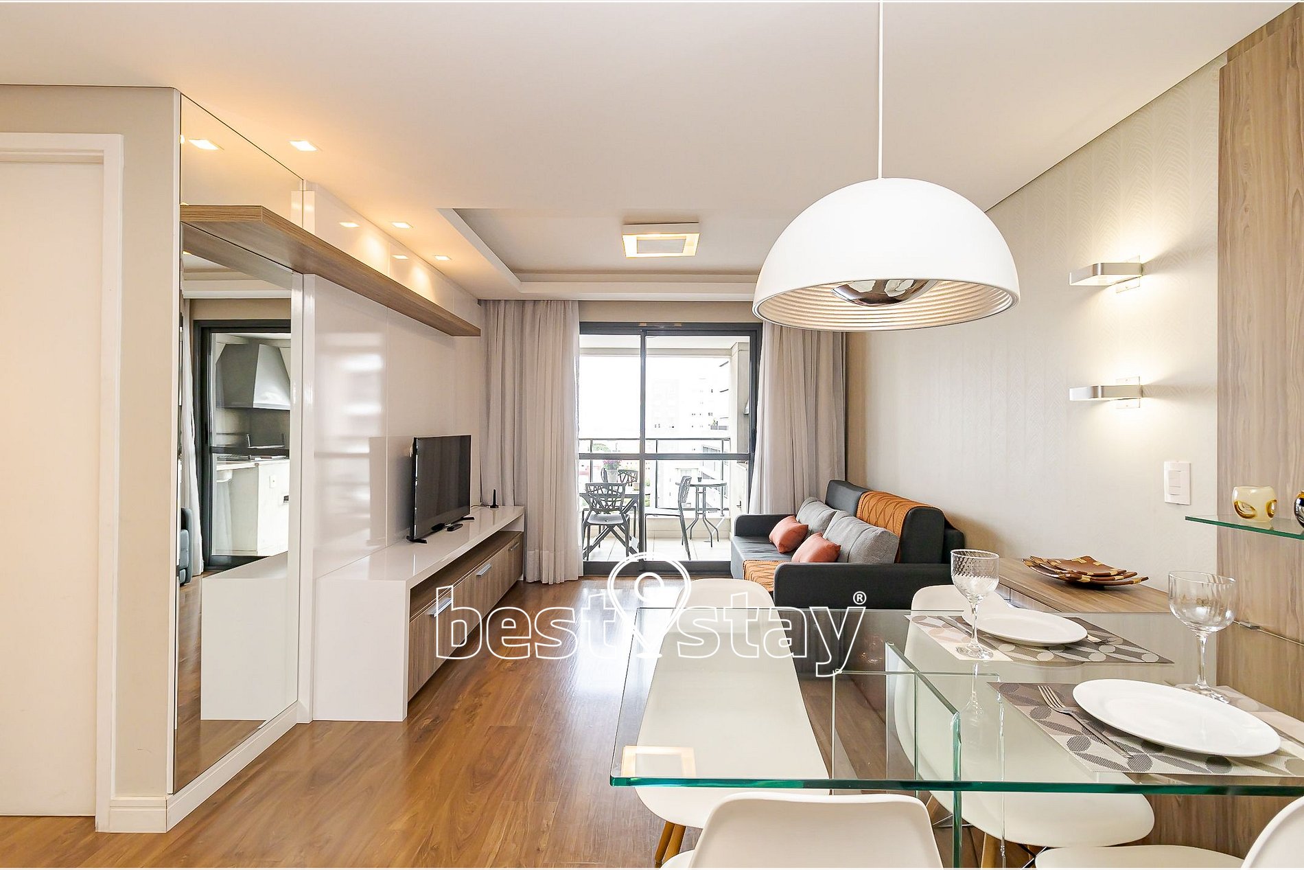 Mesa de jantar com 4 cadeiras, TV Smart, sofá-cama (NOVO) super confortável (acomoda 2 pessoas para dormir), porta balcão para a varanda, cortina com blackout. Tudo meticulosamente decorado e com muito conforto.