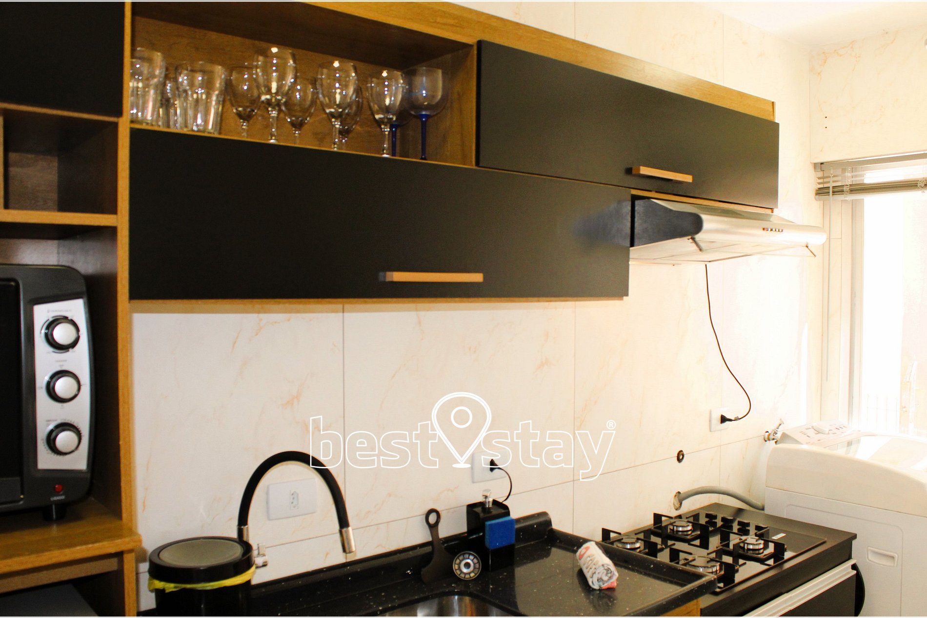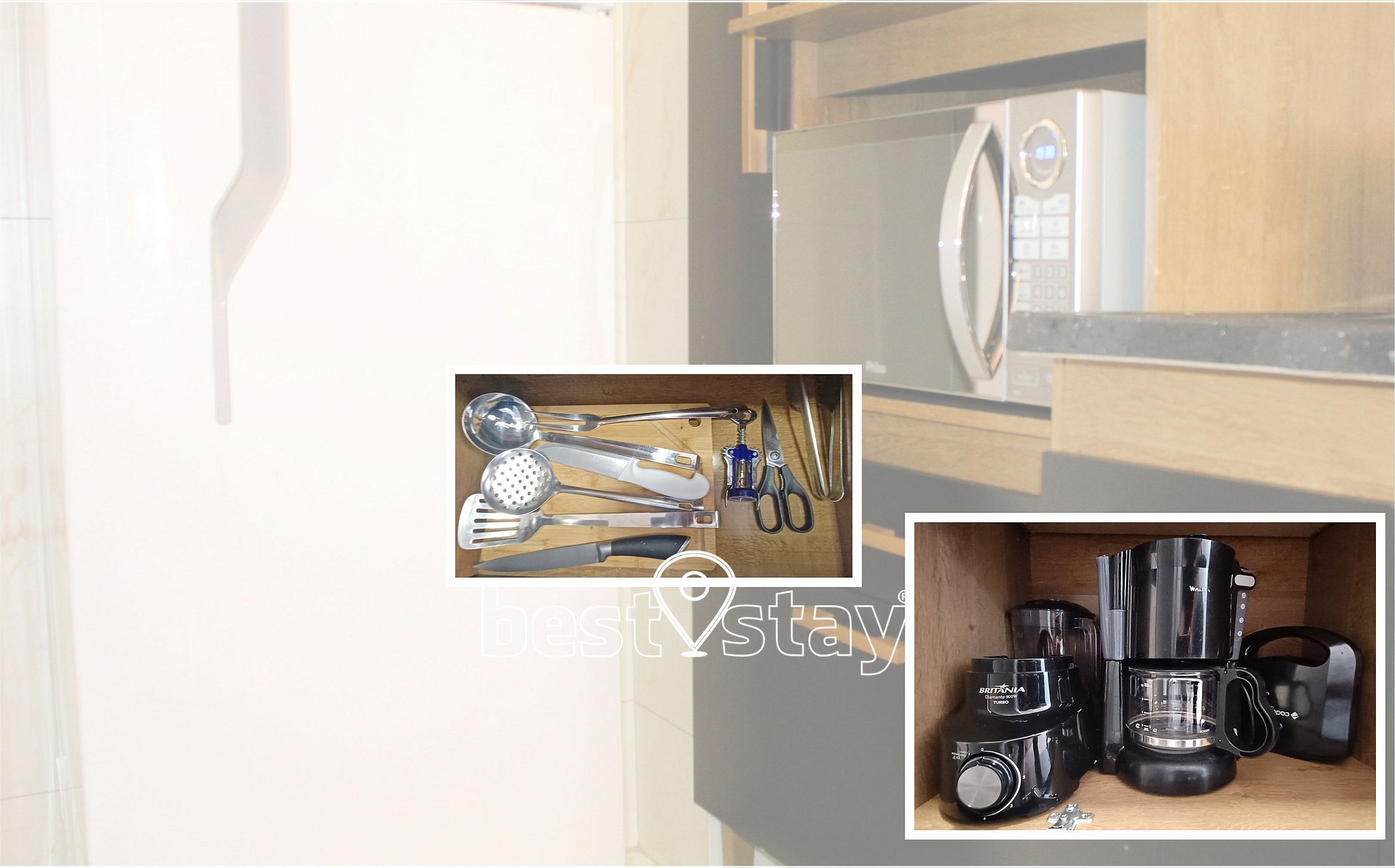 Fogão Cooktop, à gás, 4 bocas, geladeira, forno elétrico, micro-ondas, cafeteira elétrica tradicional, liquidificador, panelas, louças e talheres, e todos os itens necessário para preparar suas refeições. Máquina de lavar (EM MANUTENÇAO), escada, varal para secar roupas, ferro elétrico, tábua de passar.